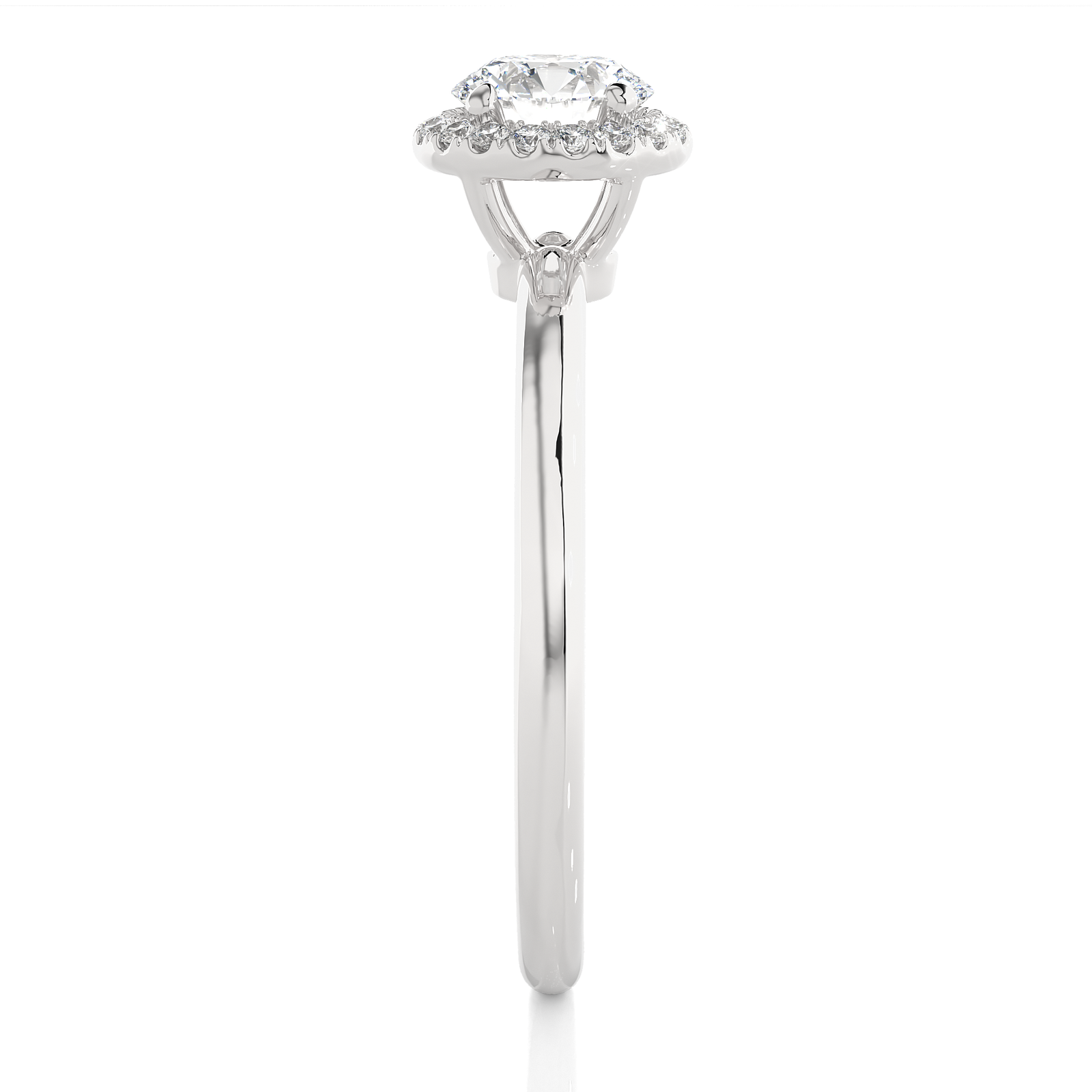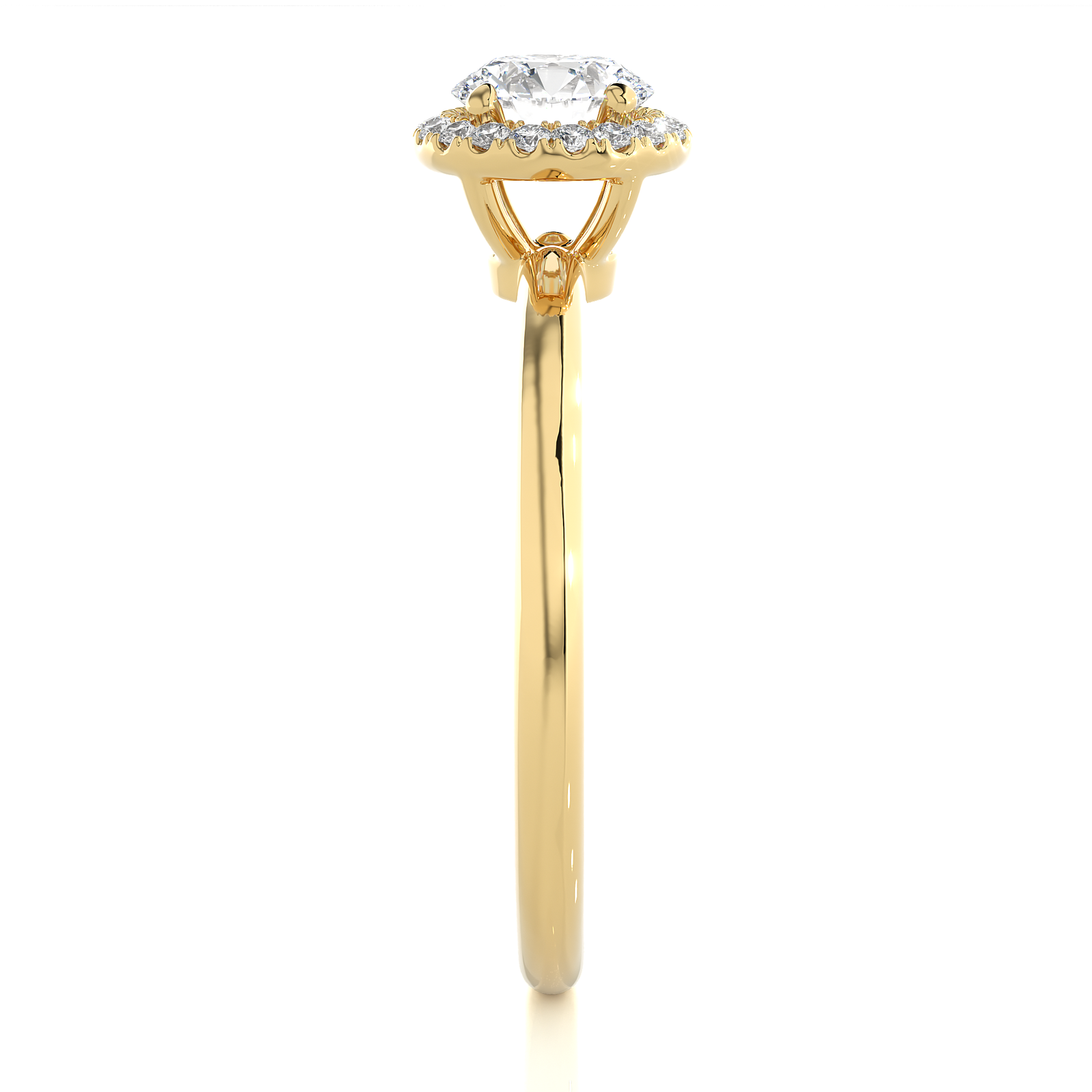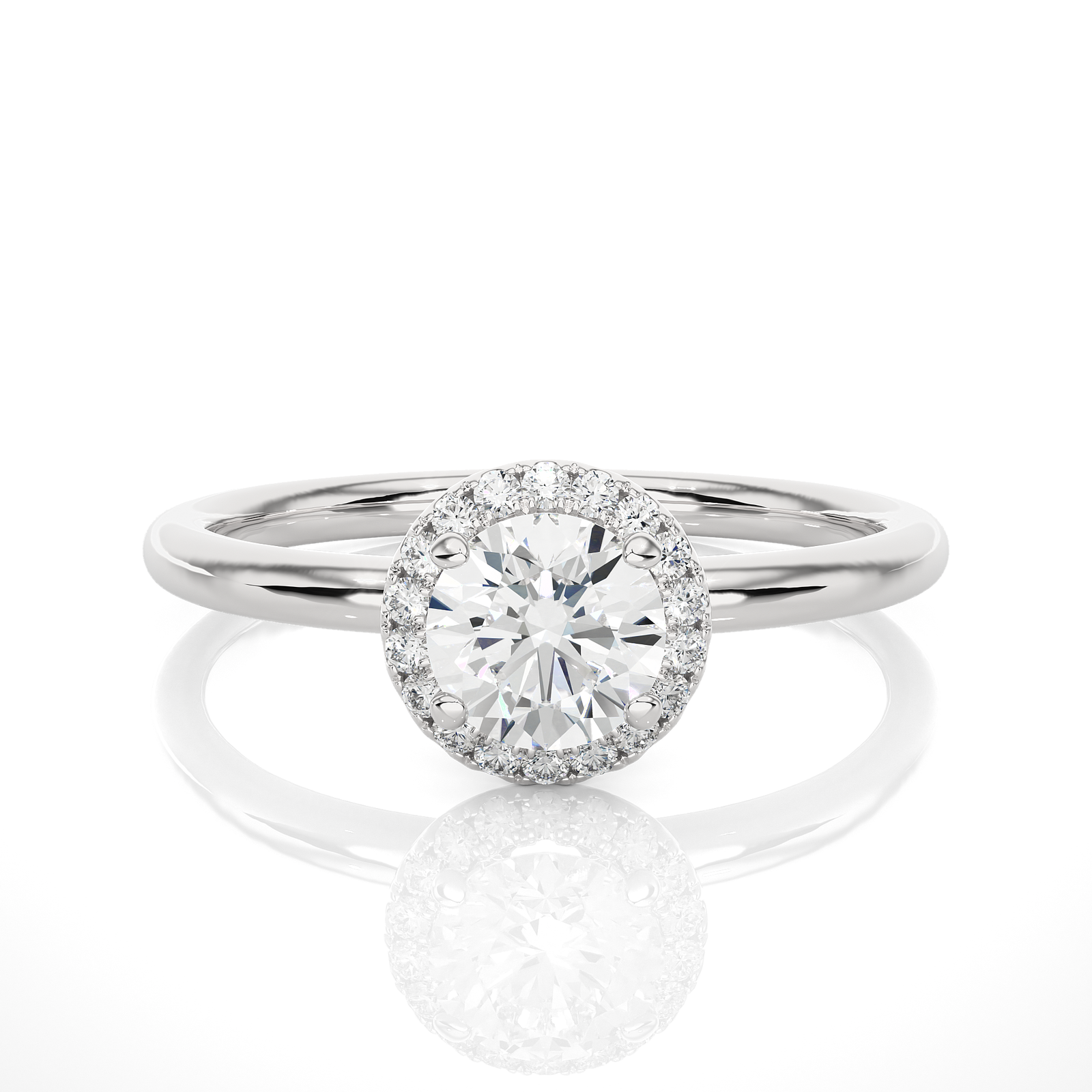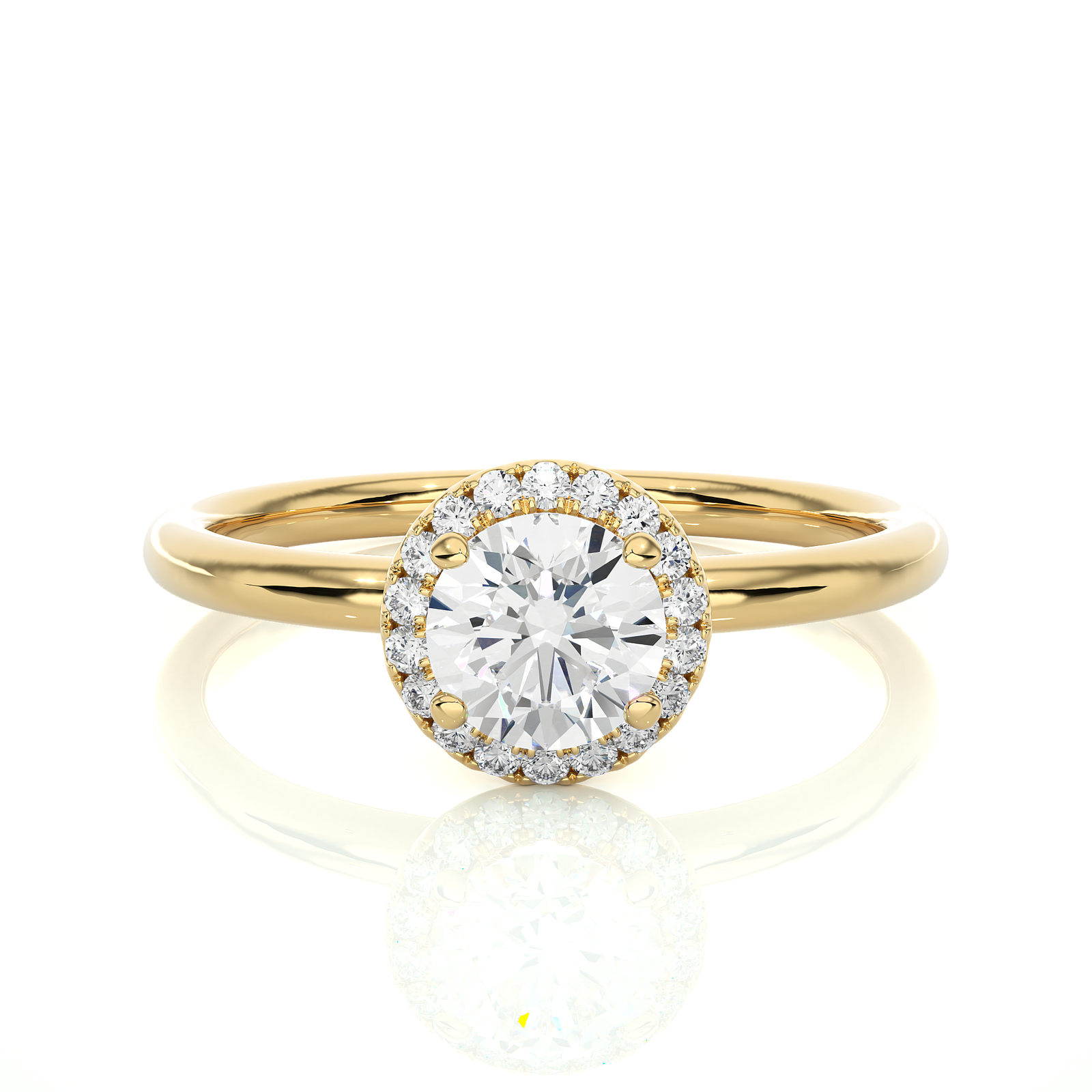 A timeless piece of beauty, this solid gold engagement ring features a brilliant round center diamond encircled by a sparkling halo of pavé-set diamonds. The sleek, polished band enhances the delicate elegance, making it a perfect choice for those who appreciate simplicity with a touch of refined glamour.