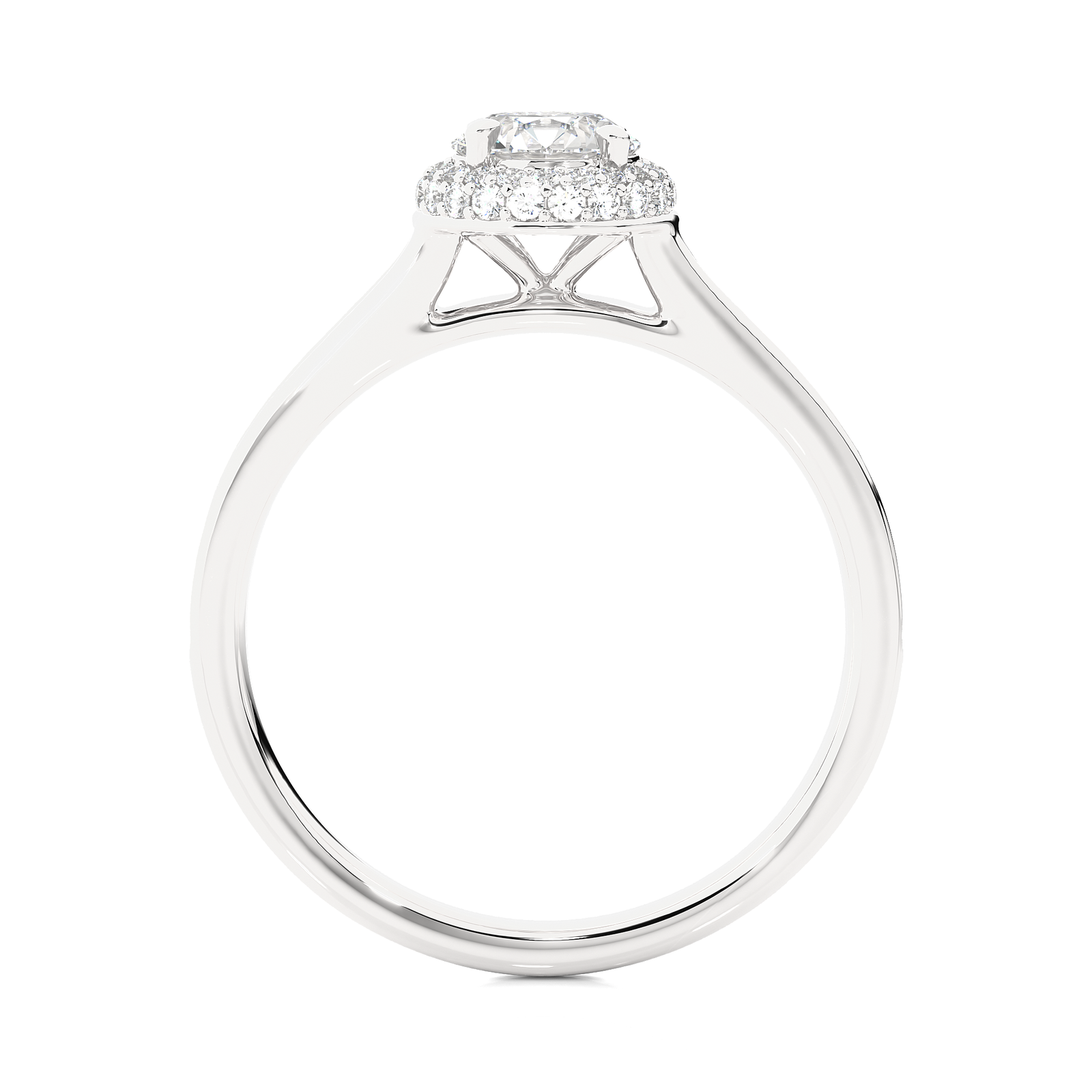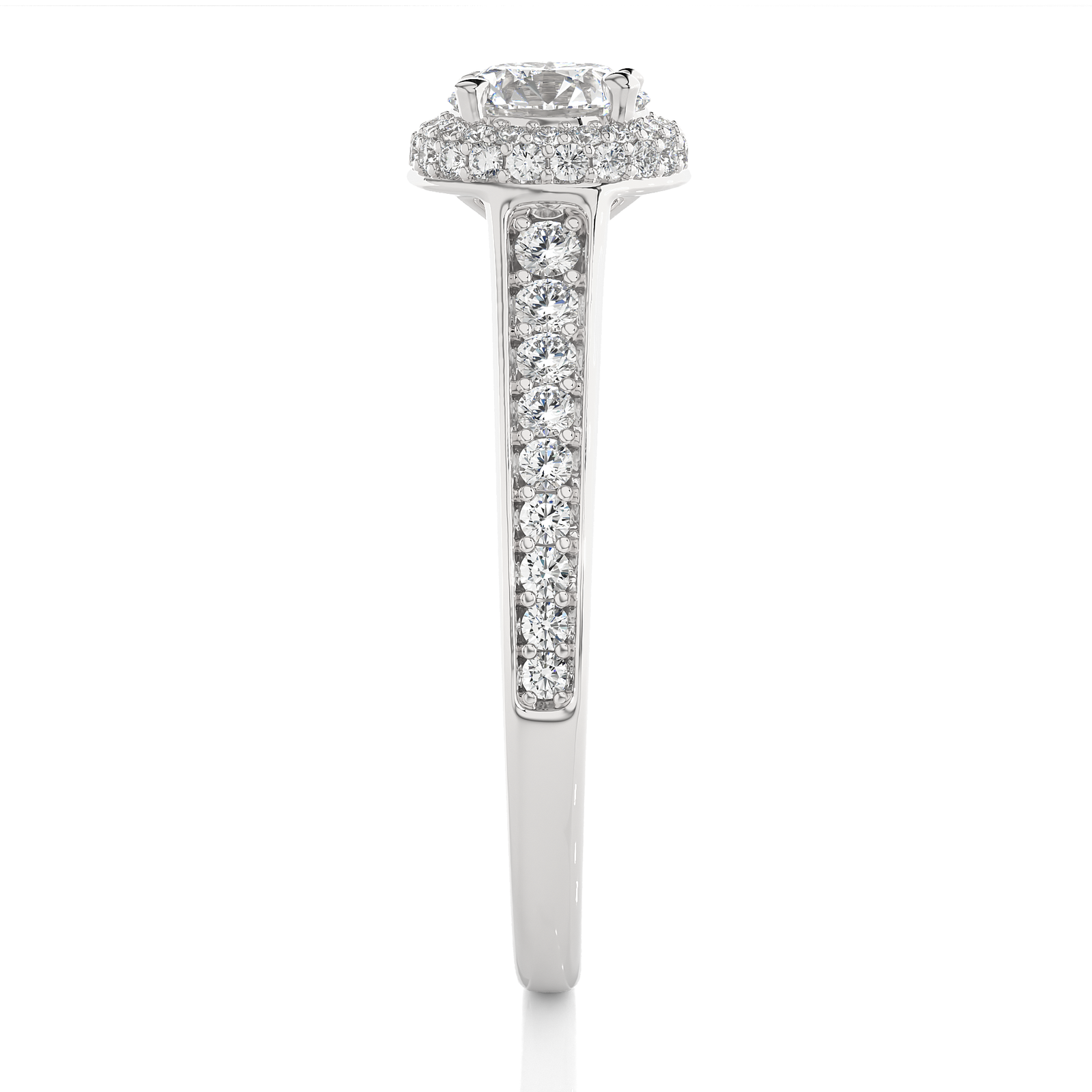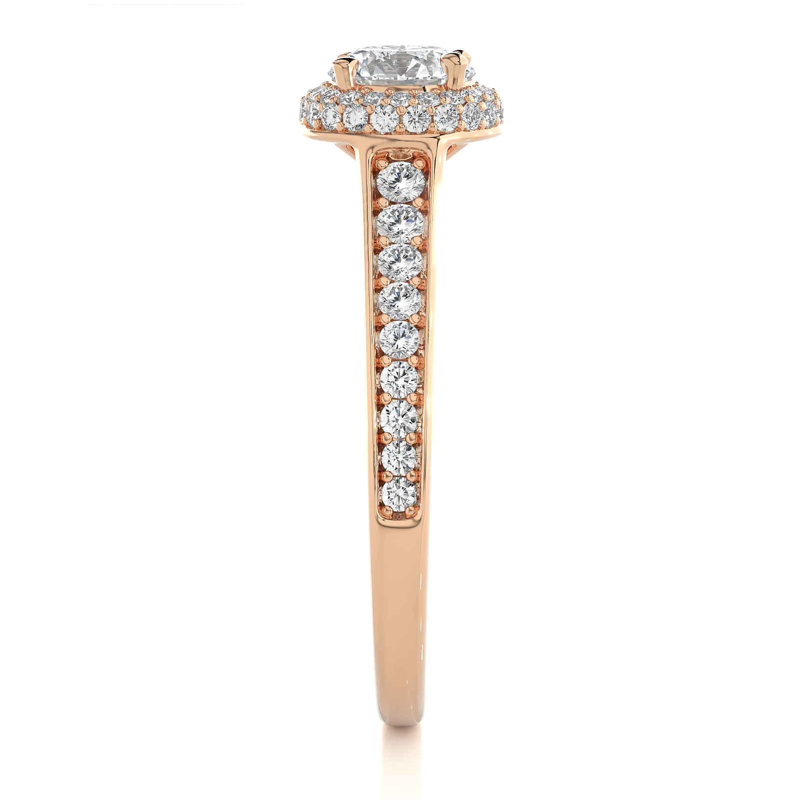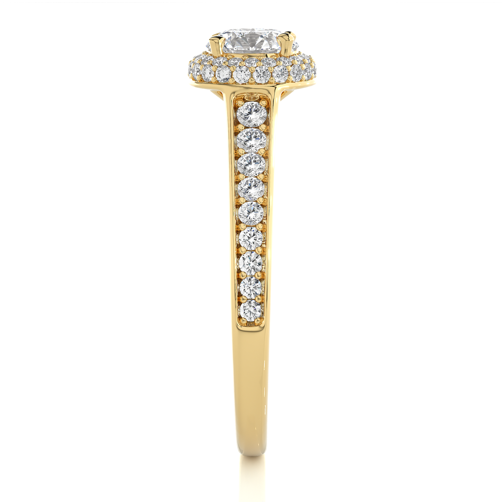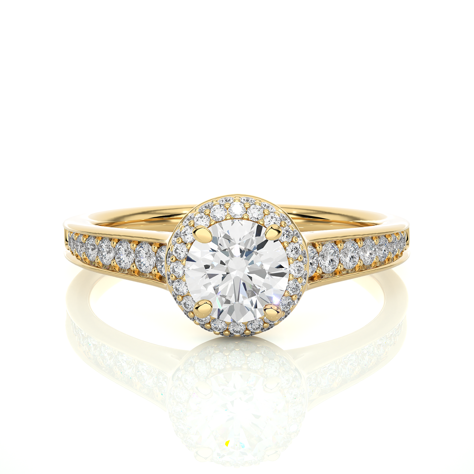 This timeless engagement ring features a stunning round-cut diamond encircled by a sparkling halo of pavé diamonds. Set in radiant yellow gold, the band showcases a row of brilliant diamonds, adding exceptional brilliance and elegance. A perfect symbol of everlasting love, crafted to captivate from every angle.