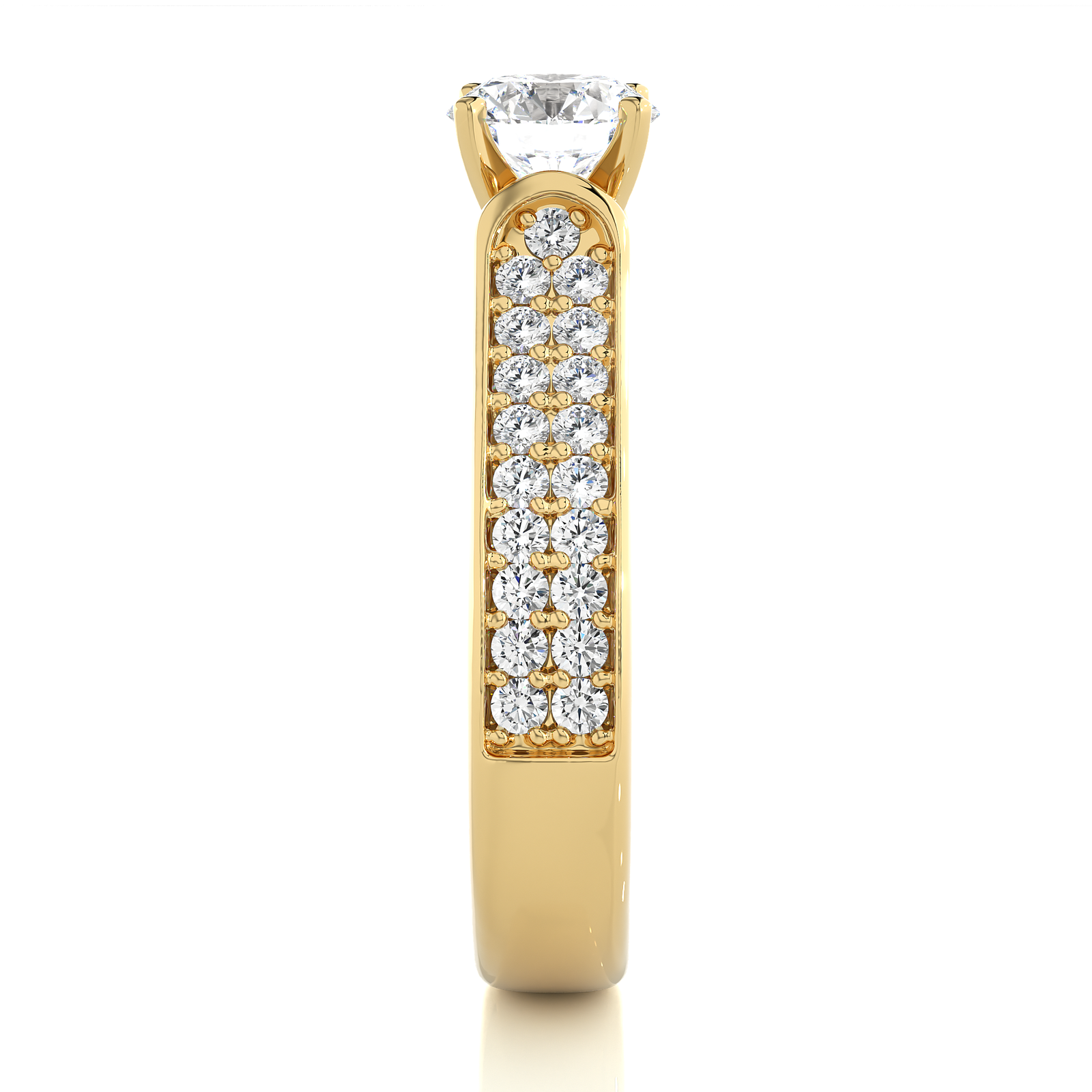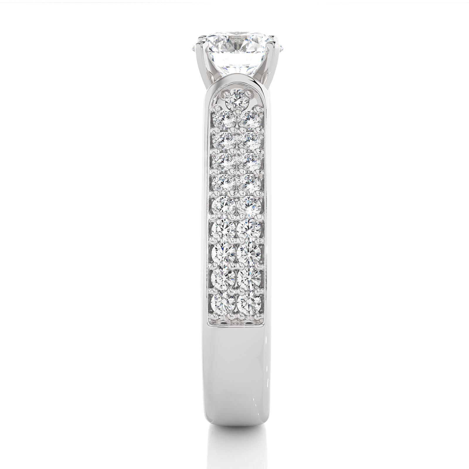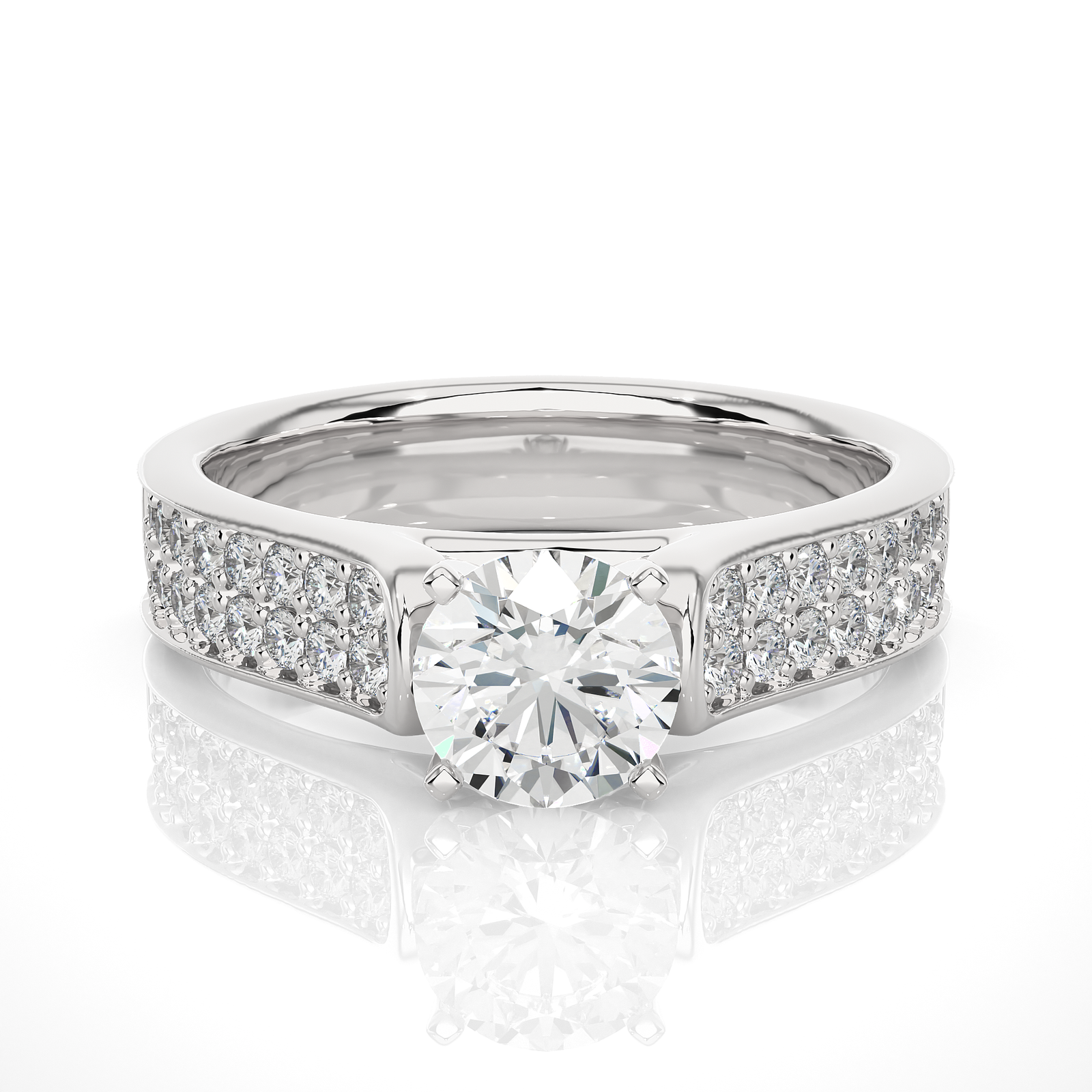 A timeless symbol of love, this solitaire engagement ring features a brilliant round-cut center diamond elevated by a sleek white gold setting. The band is encrusted with pavé-set diamonds for added sparkle, creating a luxurious and elegant look. Perfect for a classic yet dazzling proposal she’ll always remember.