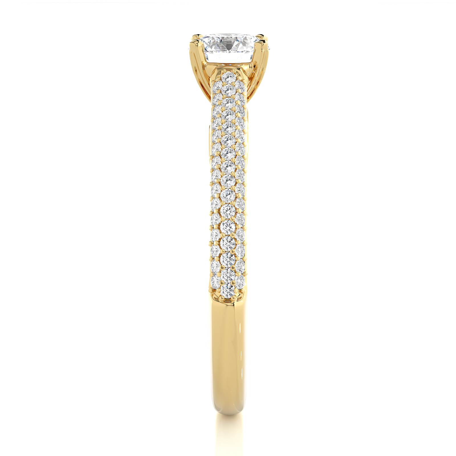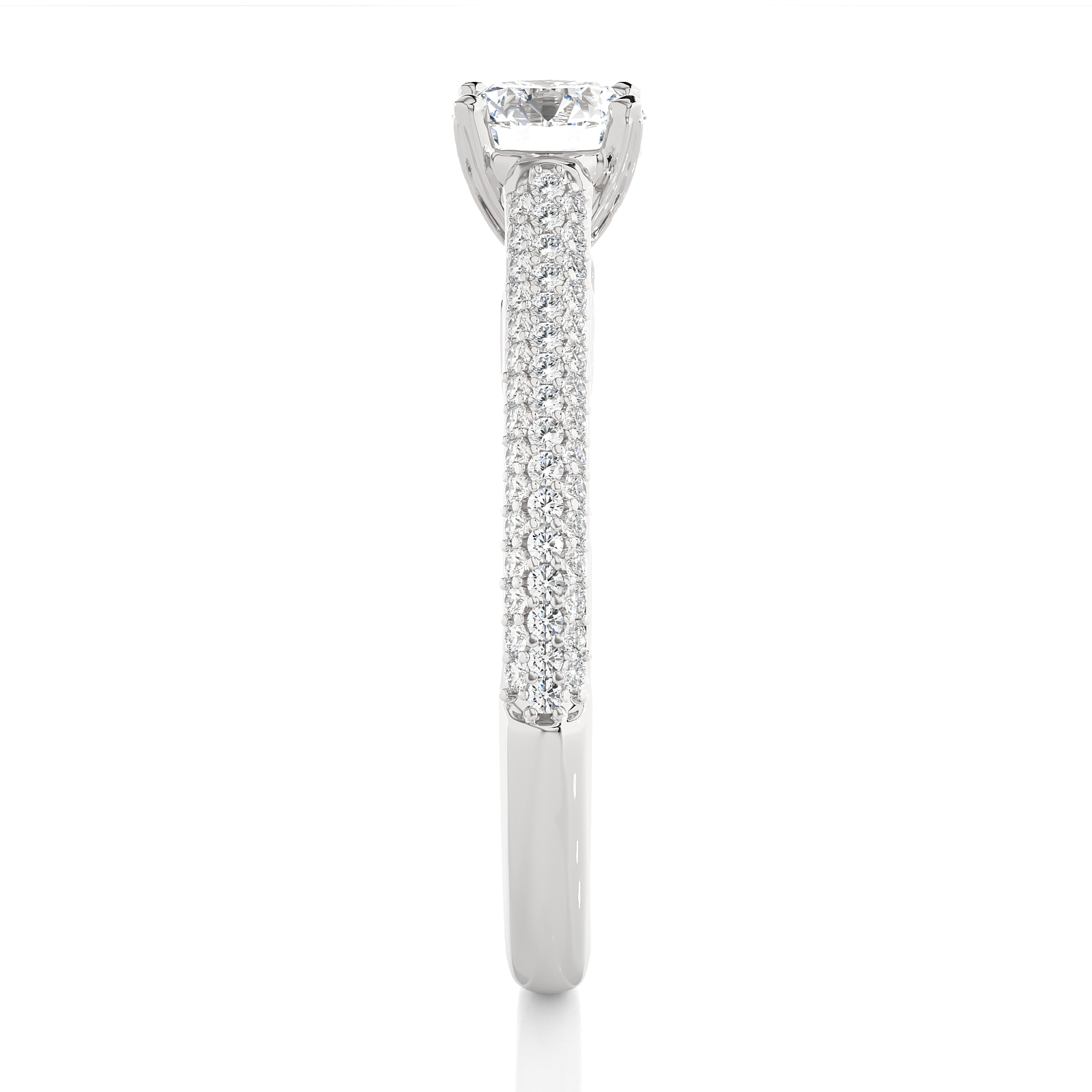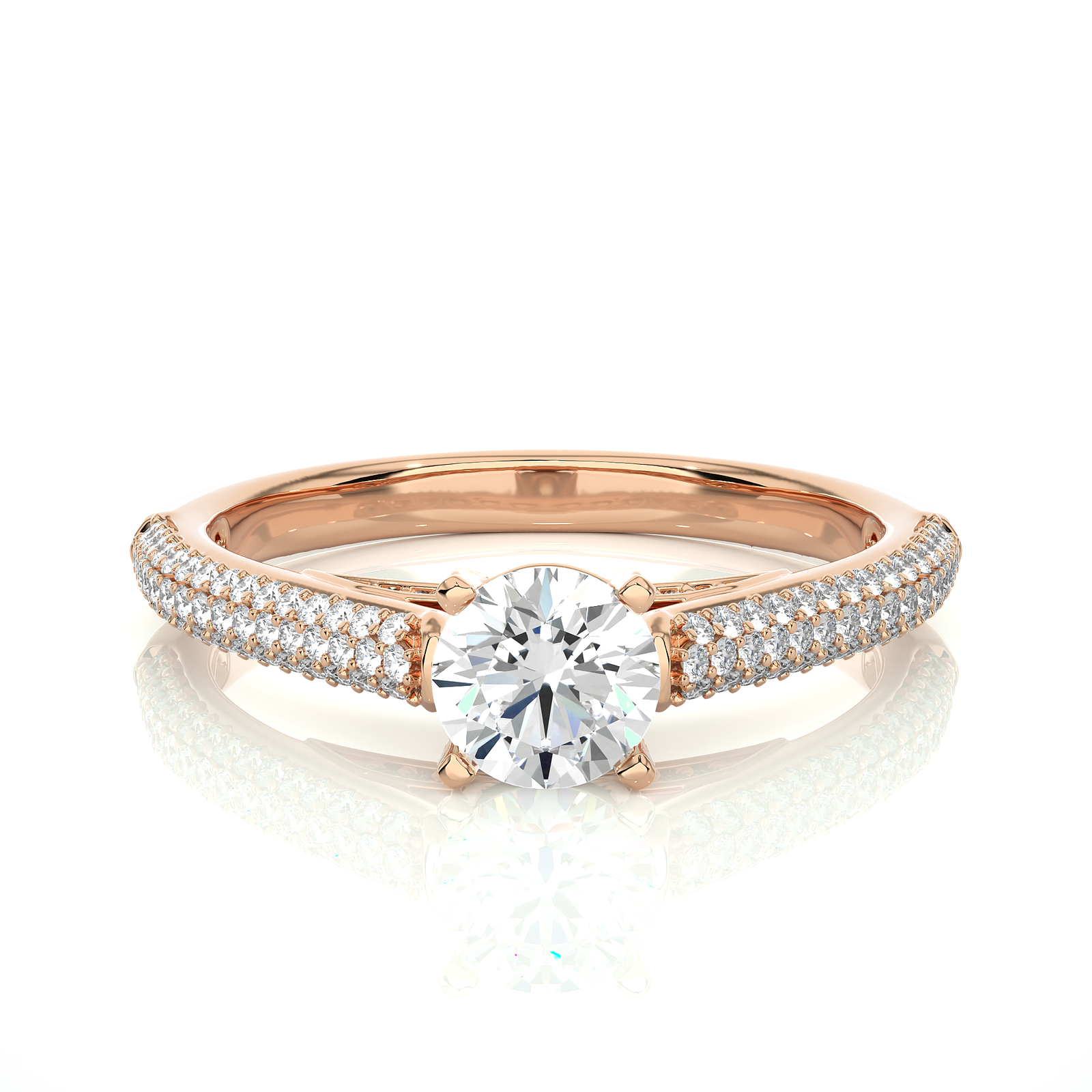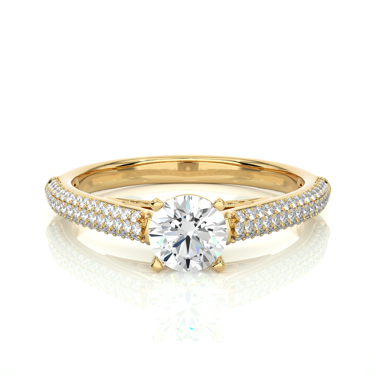 This elegant engagement ring features a brilliant round-cut center diamond. The band showcases three rows of sparkling pave-set diamonds, adding layers of radiance and sophistication. A timeless design that blends classic elegance with modern luxury — perfect for the love that shines forever.