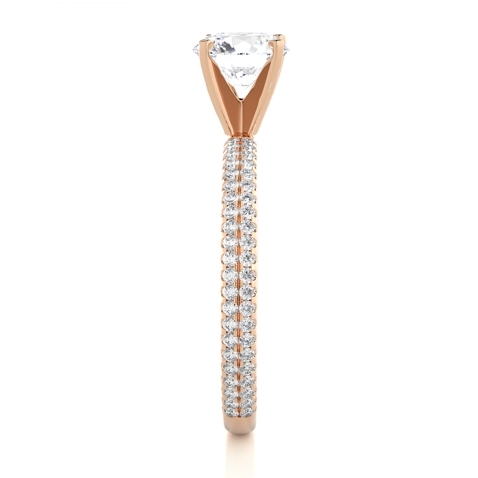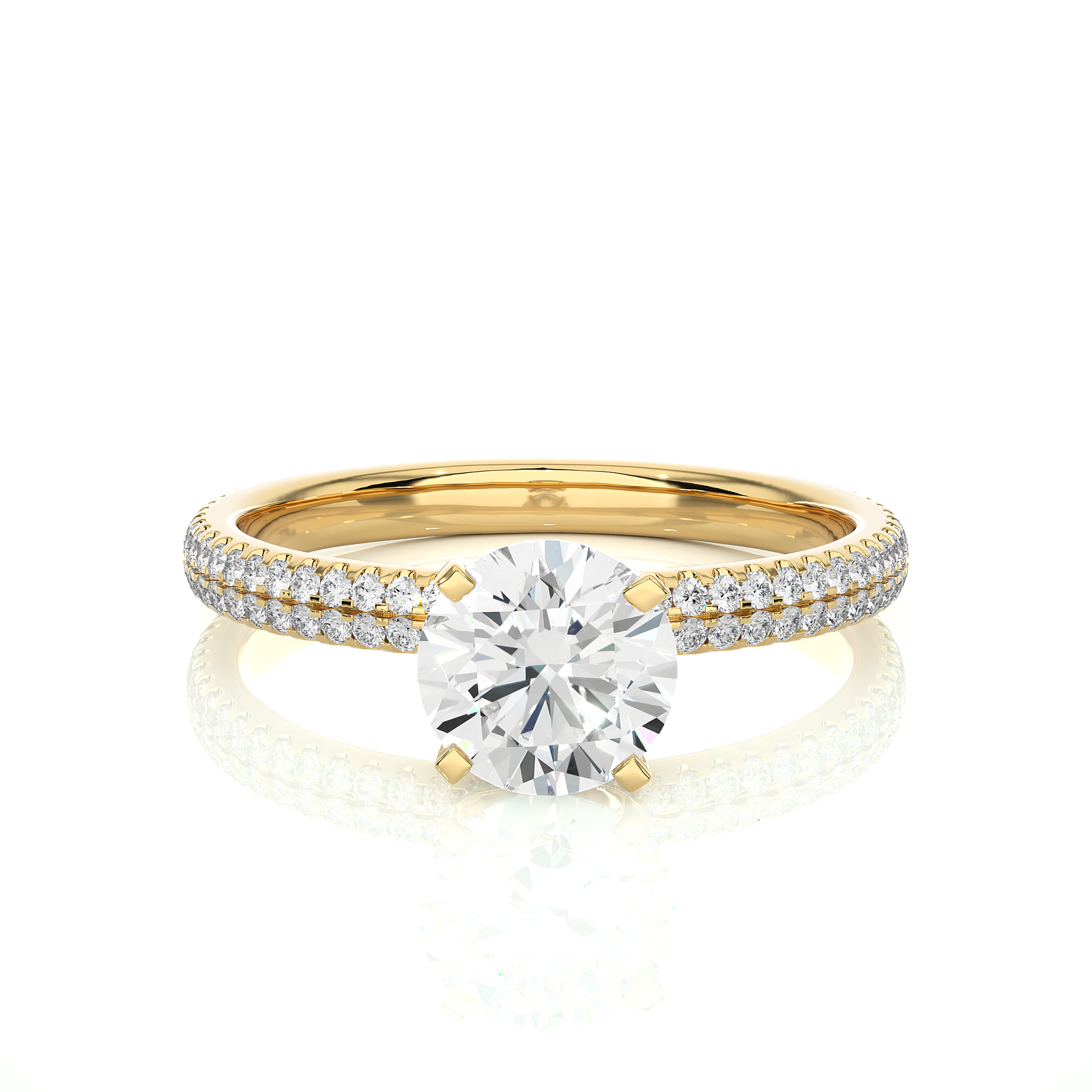 This timeless engagement ring features a dazzling round-cut center diamond, gracefully set on a lustrous yellow gold band. Two rows of pave-set diamonds along the band add brilliance and sophistication. A refined design that symbolizes everlasting love, perfect for those who cherish elegance with a hint of modern sparkle.