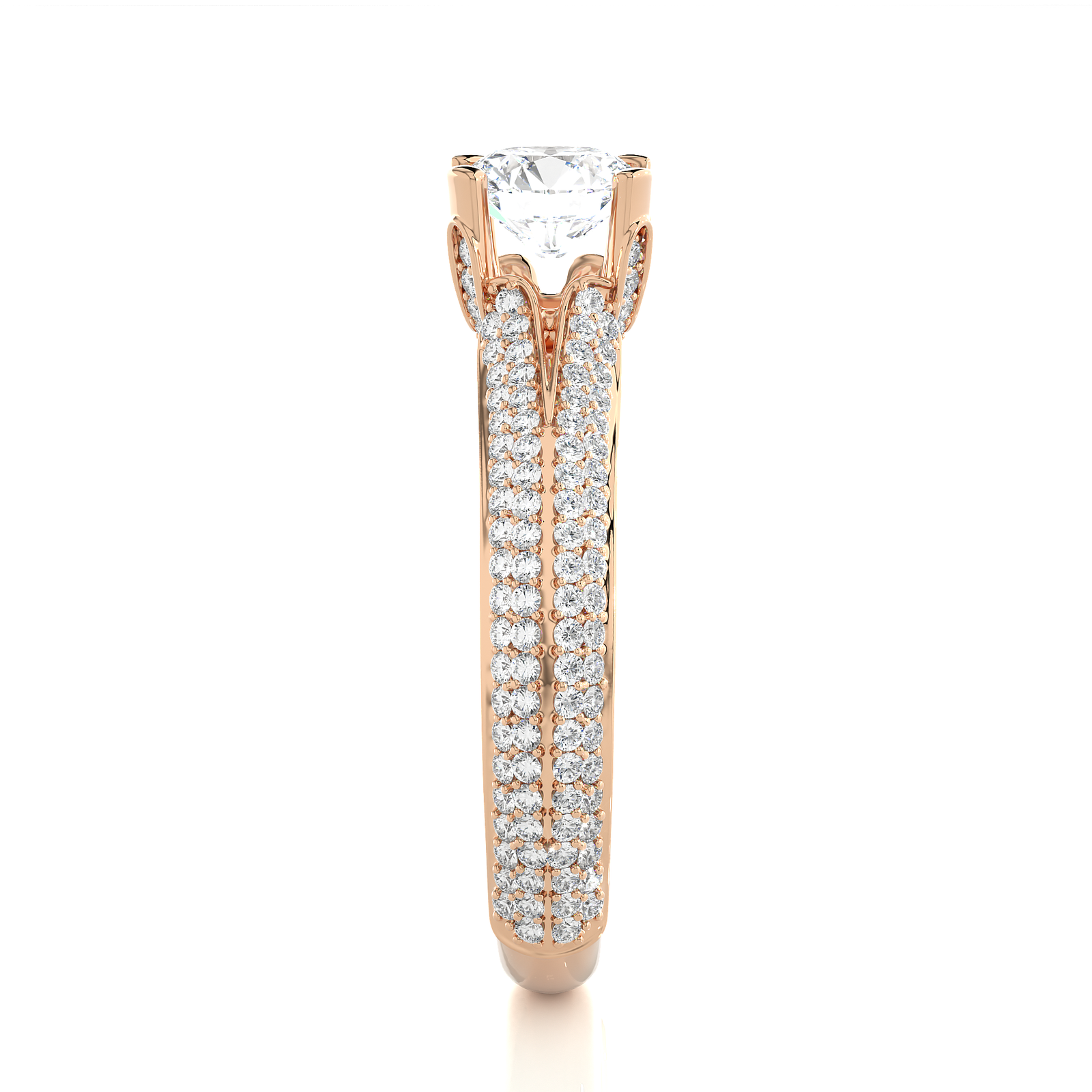 This stunning rose gold engagement ring features a brilliant round center diamond set on a pavé split shank band. The delicate diamonds along the band add timeless sparkle and elegance. Perfect for symbolizing enduring love with a modern, luxurious touch, this ring radiates beauty and sophistication.