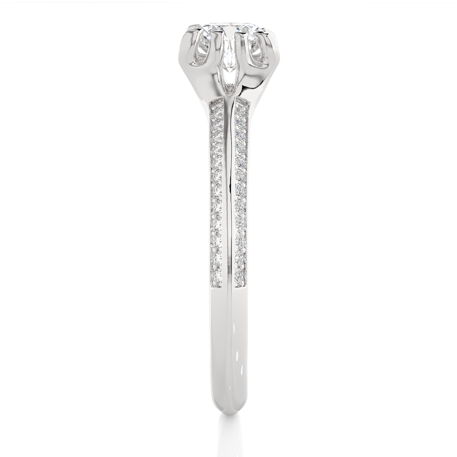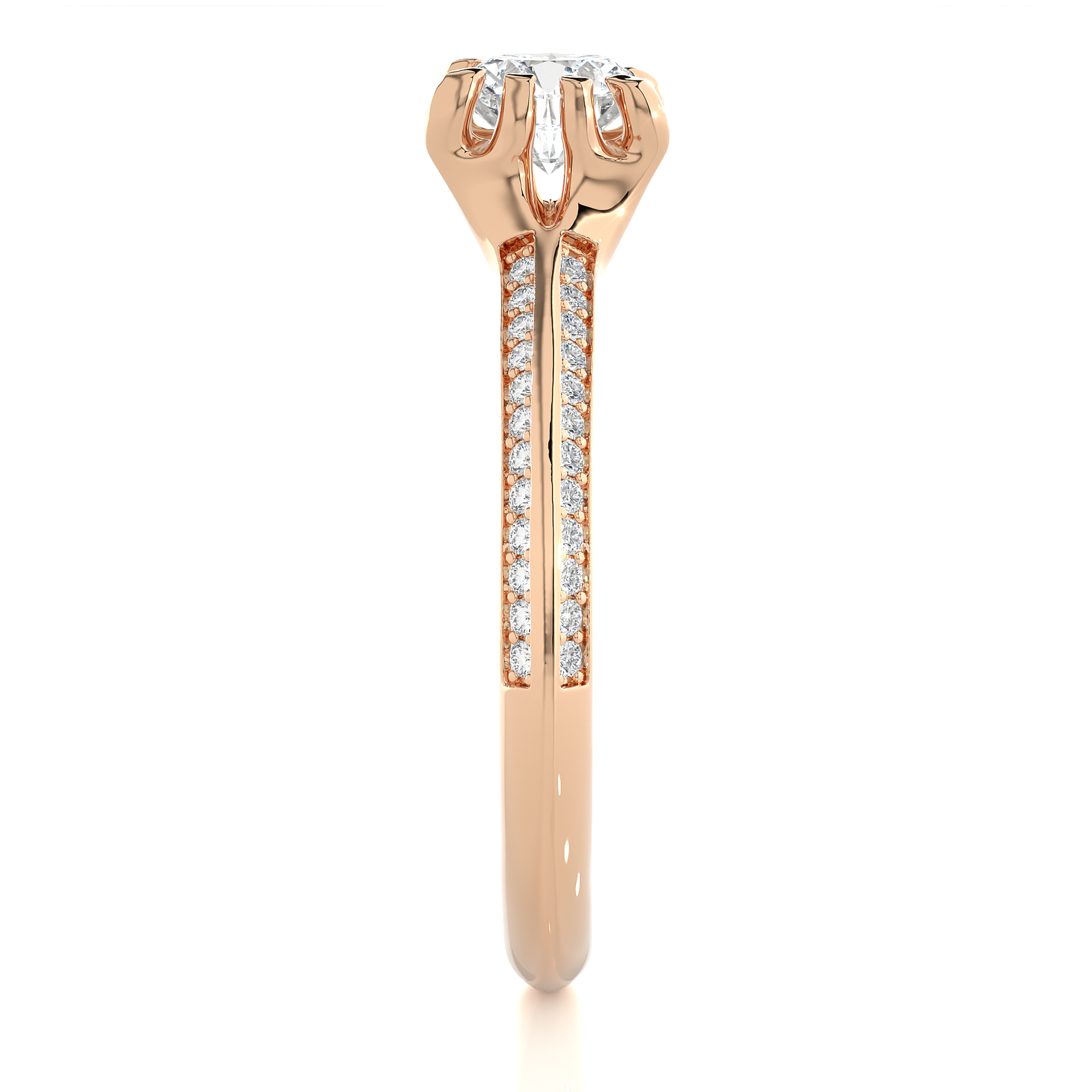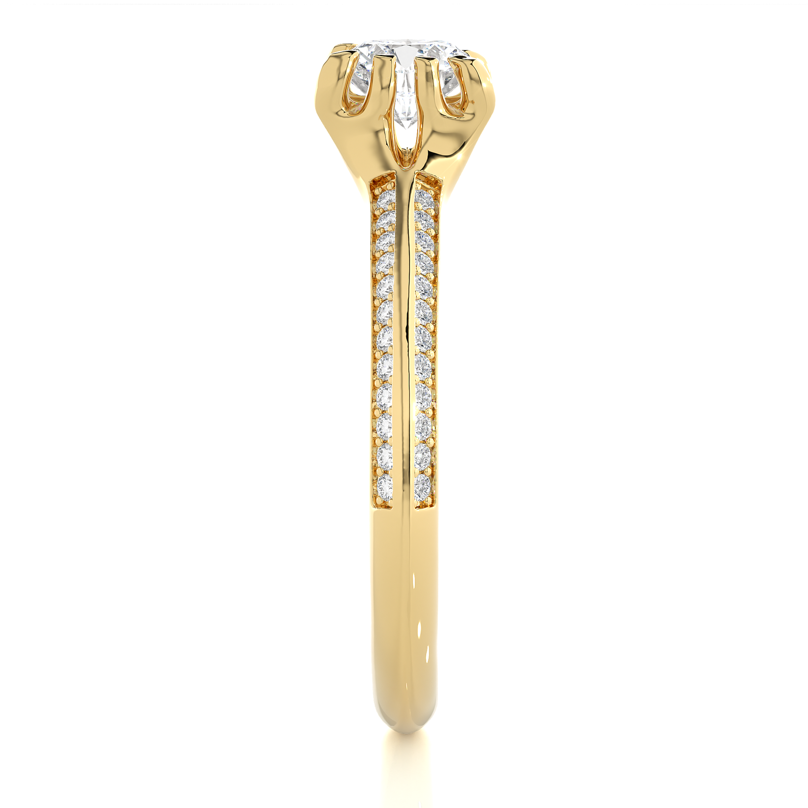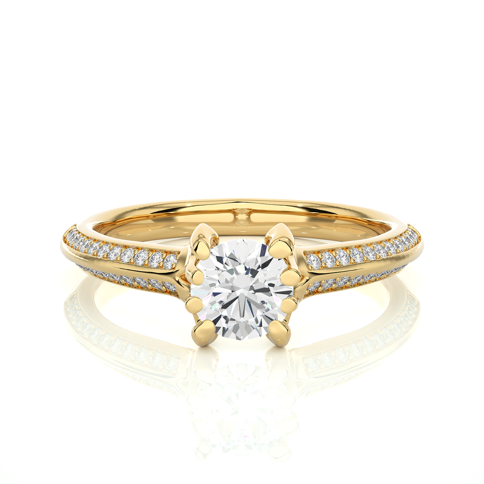 This gold engagement ring features a dazzling round solitaire diamond. Accentuated by sparkling side diamonds along the band, it embodies sophistication and grace. Perfect for celebrating lasting love, this ring offers a refined and classic style that shines with every gesture.
