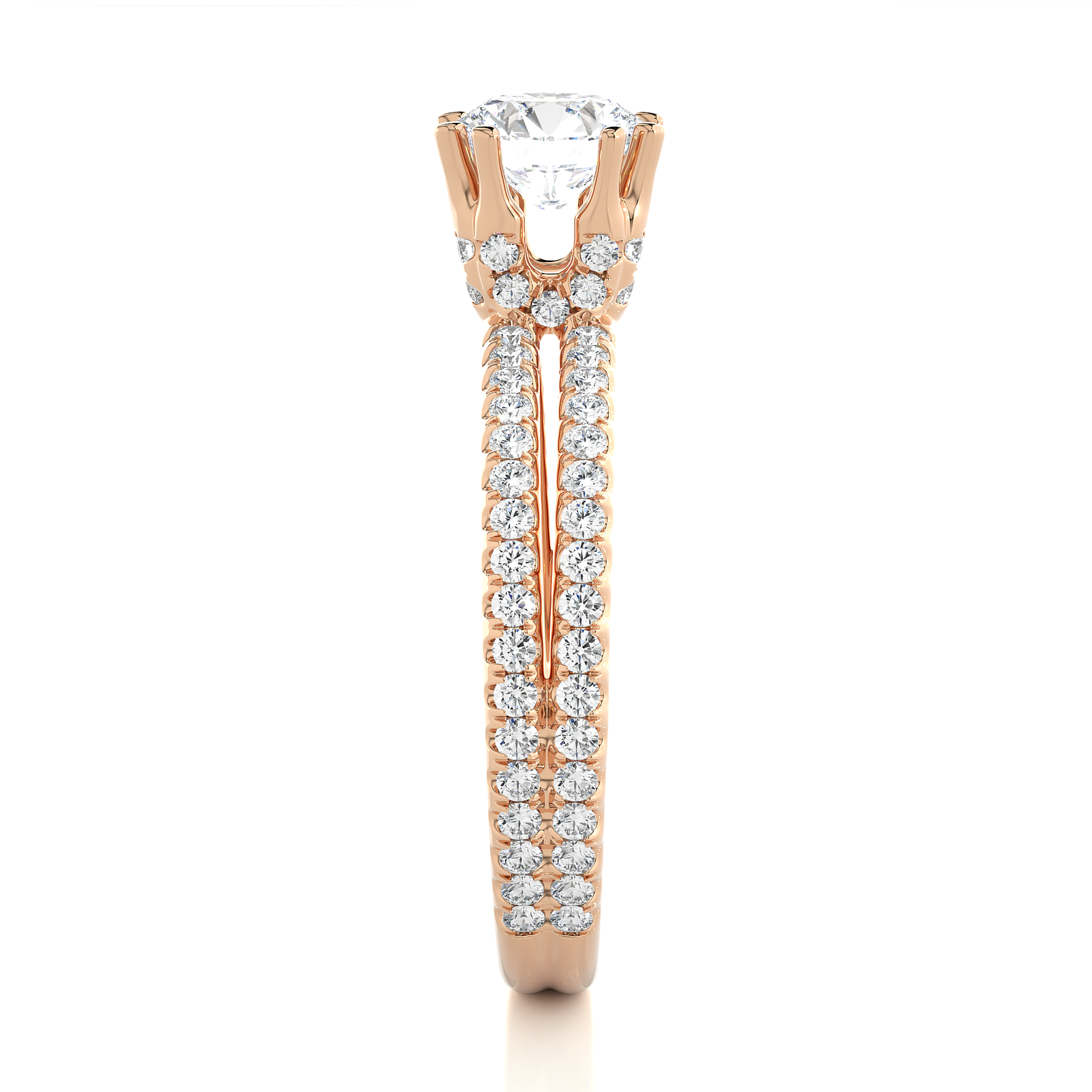 This platinum ring showcases a brilliant round-cut center diamond secured by a six-prong setting. The dual pavé-set bands add extra shimmer, making it a sophisticated and luxurious piece. Perfect for engagements or anniversaries, this design reflects enduring love with exceptional brilliance and modern refinement.