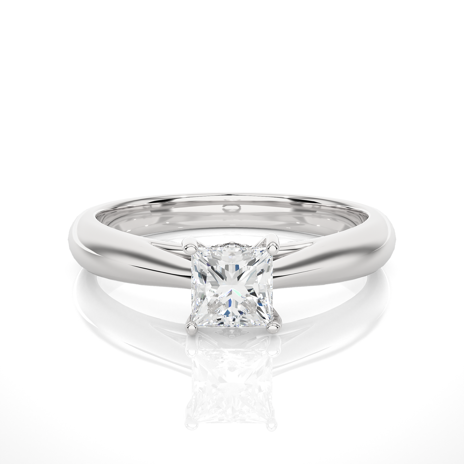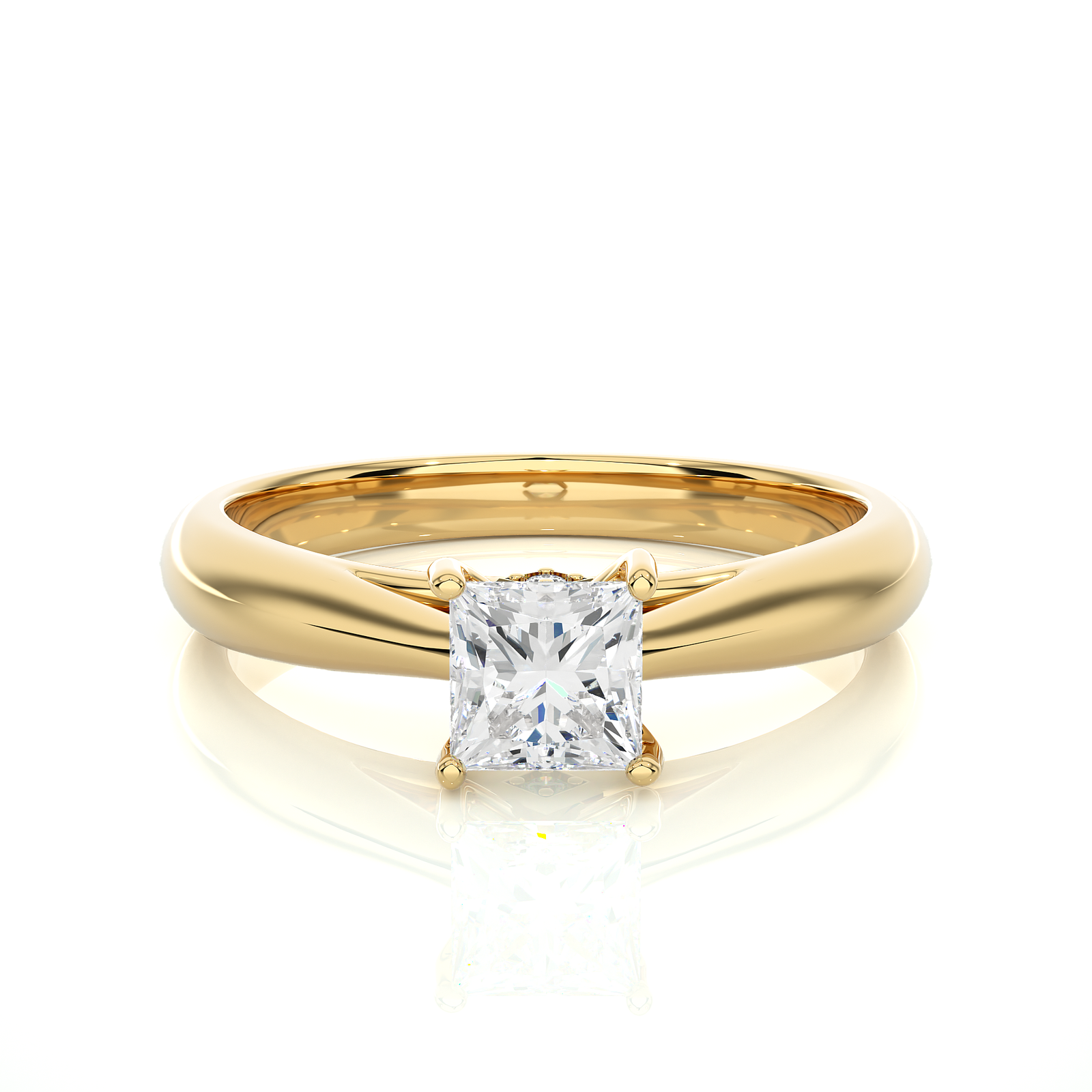 This sophisticated solid gold solitaire ring features a dazzling princess-cut diamond, gracefully elevated to maximize brilliance. A delicate hidden accent diamond beneath the center stone adds a unique touch of elegance. A timeless symbol of love and commitment, perfect for engagements or special moments that deserve to shine forever.