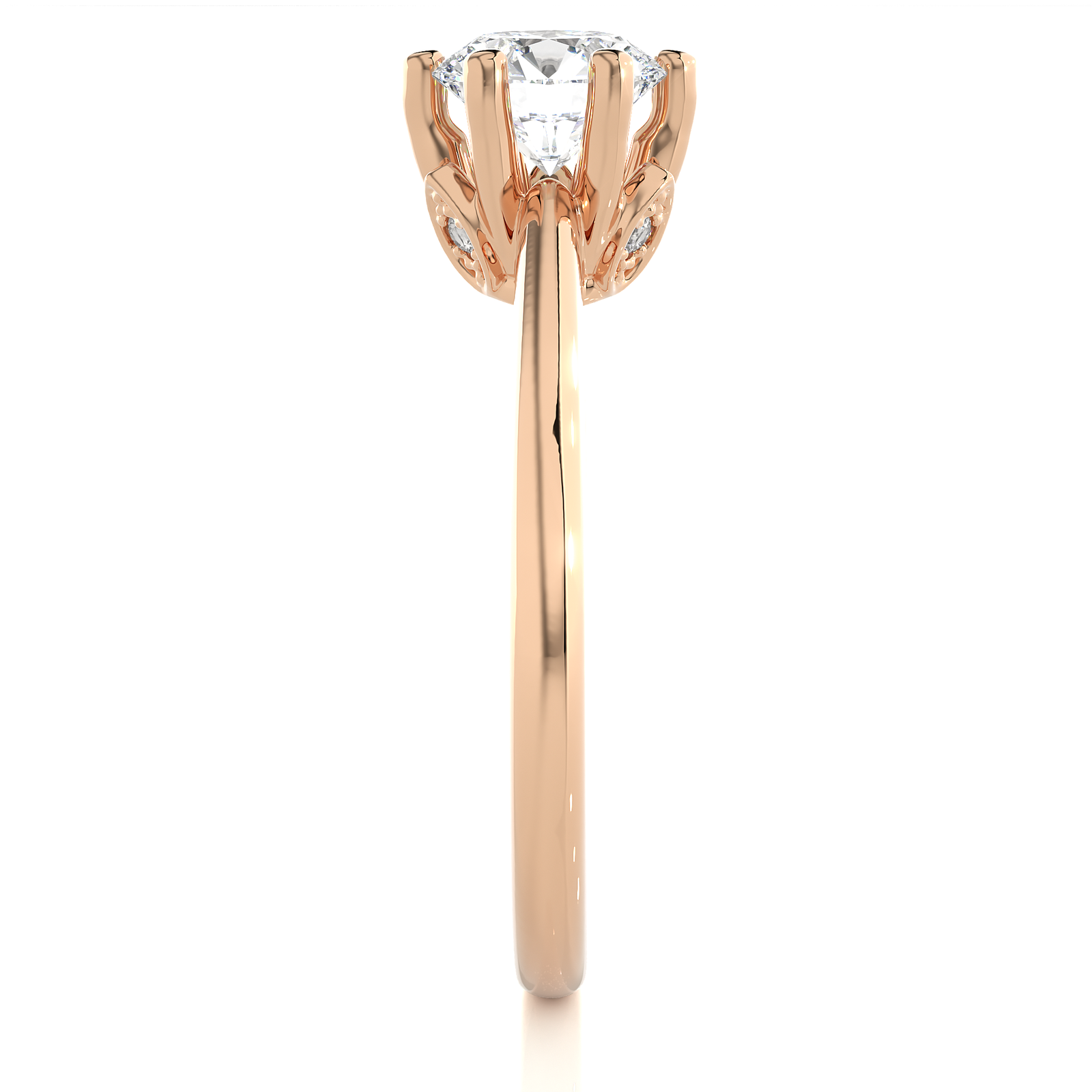 This exquisite round solitaire diamond ring features a floral-inspired six-prong setting, gracefully held in polished yellow gold. The delicate petal-like prongs enhance the brilliance of the center stone, offering timeless elegance with a romantic twist. Perfect for engagements or cherished moments, it blends classic charm with distinctive feminine detail.