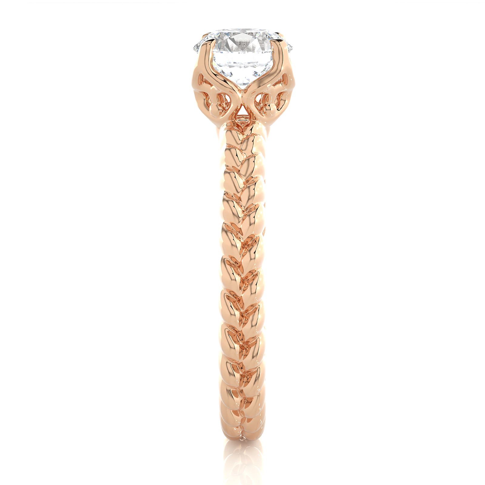 Celebrate timeless elegance with this striking solitaire ring, featuring a brilliant round diamond nestled in a four-prong setting. The unique braided solid gold band adds texture and sophistication, symbolizing everlasting love and unity. Perfect for engagements or anniversaries, this piece blends classic sparkle with artistic, modern craftsmanship.