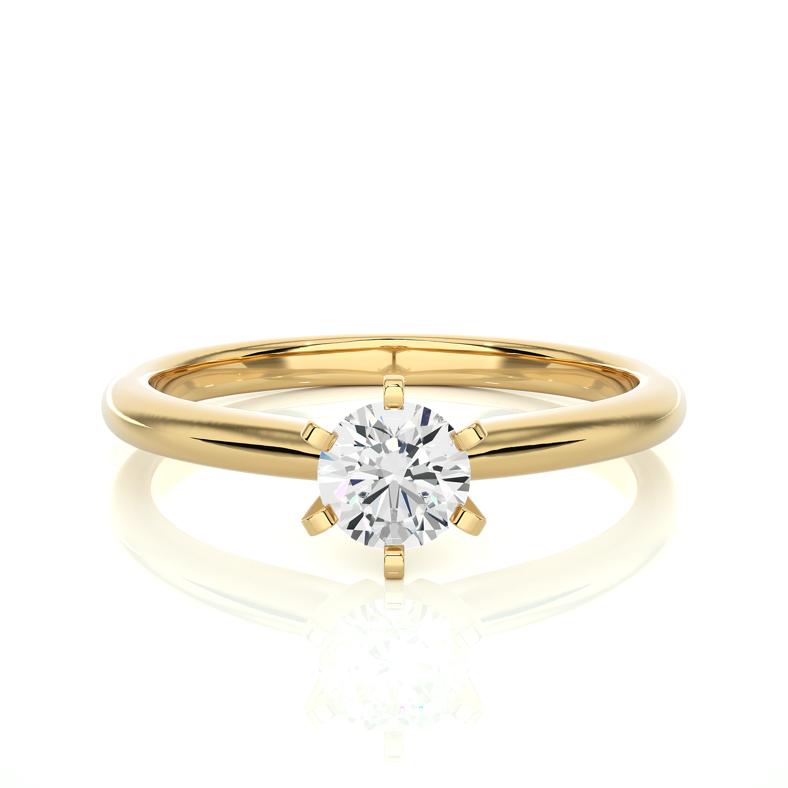 A timeless beauty, this solitaire ring features a dazzling round diamond secured by six elegant prongs atop a polished yellow gold band. The minimalist yet sophisticated design enhances the diamond’s brilliance, making it a perfect symbol of eternal love and commitment. Ideal for engagements or a romantic celebration.