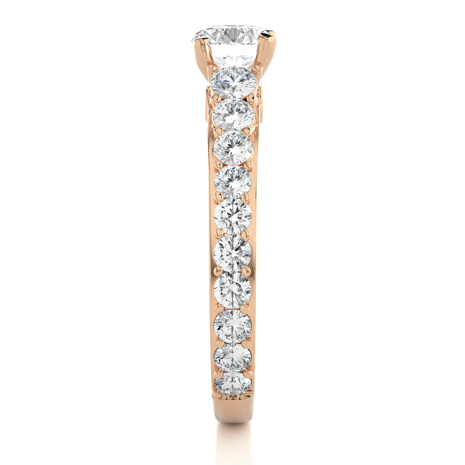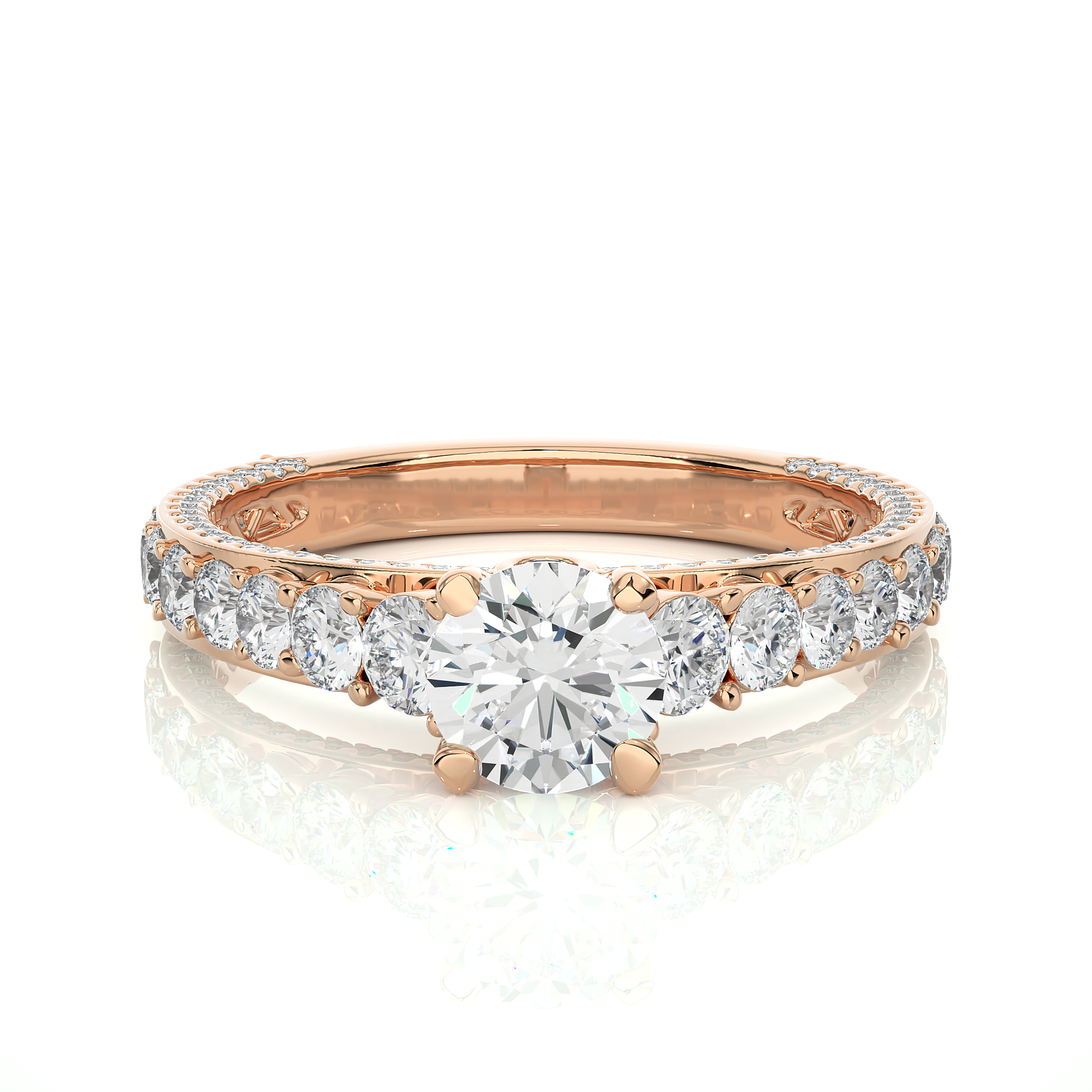 This stunning gold engagement ring, featuring a brilliant round center diamond flanked by a cascade of dazzling accent stones. Intricate pave detailing enhances its timeless elegance, while the unique side-view bezel adds a modern twist. A luxurious piece crafted to symbolize enduring love and beauty.