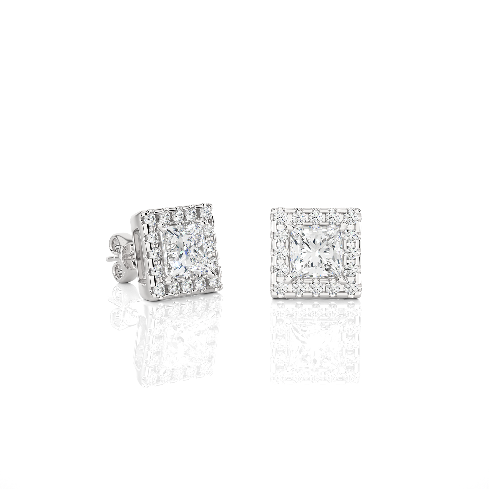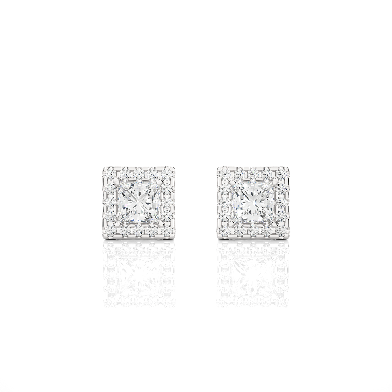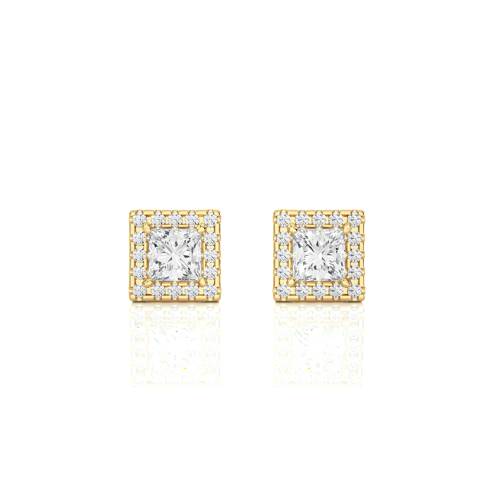 These luxurious stud earrings showcase princess-cut center diamonds surrounded by a brilliant halo of round diamonds, set in rich solid gold. The elegant square halo design adds extra sparkle and sophistication, making them perfect for elevating everyday style or completing a glamorous evening look. A timeless gift of elegance.