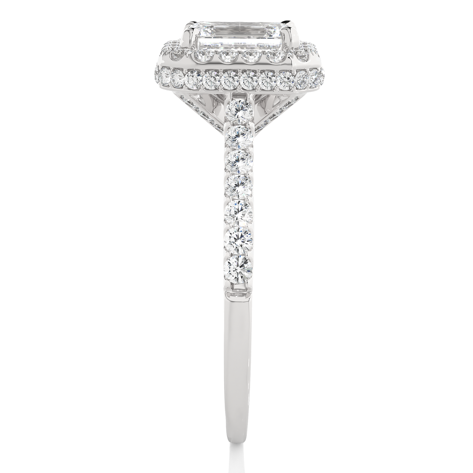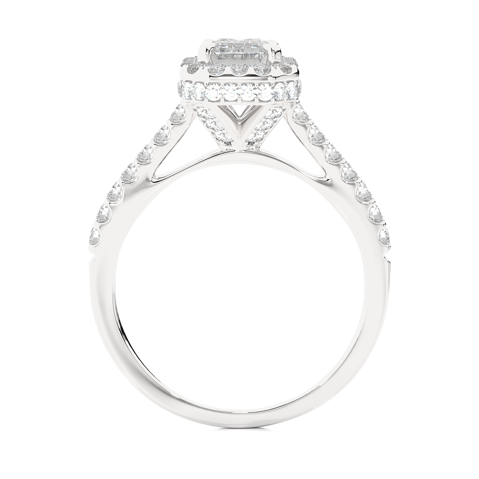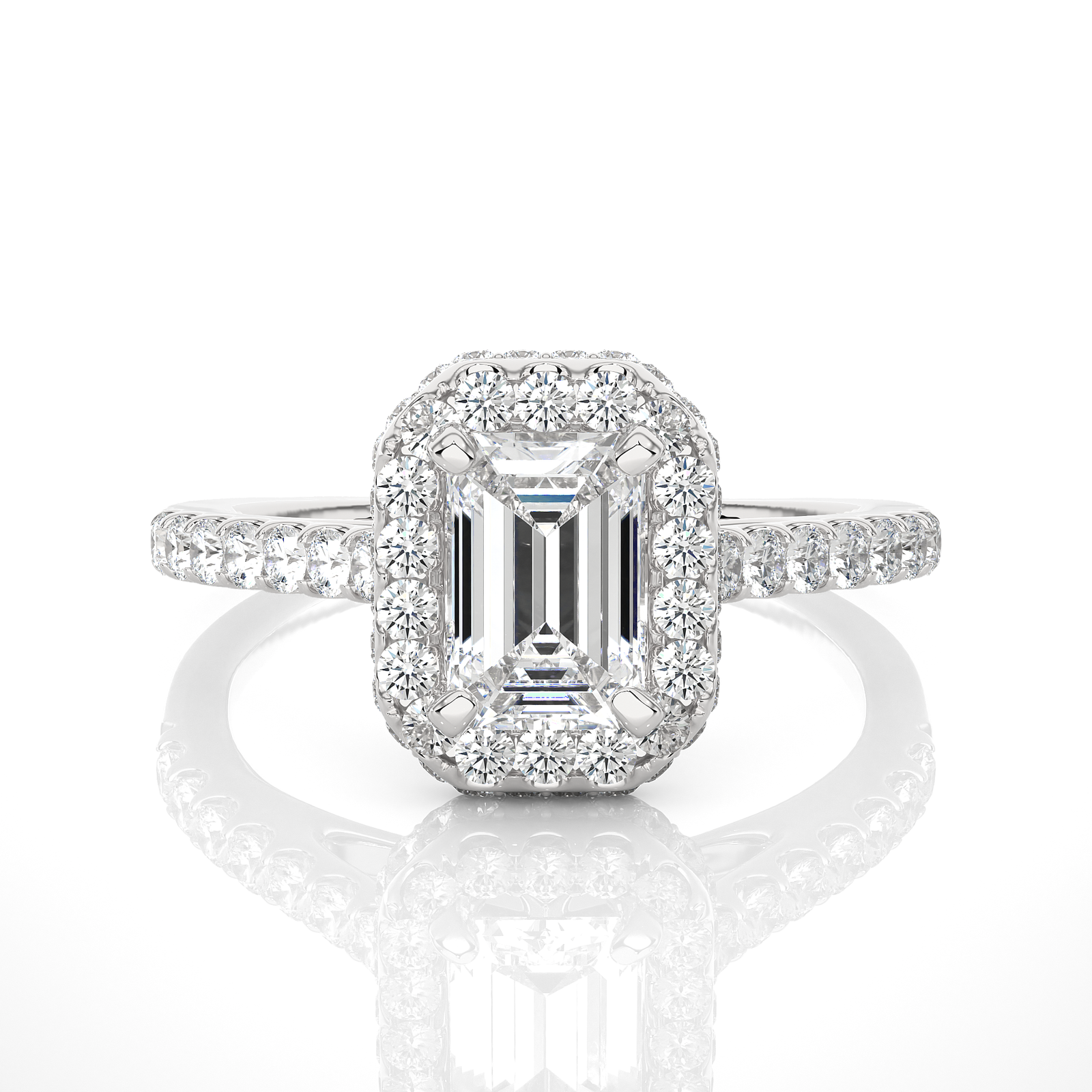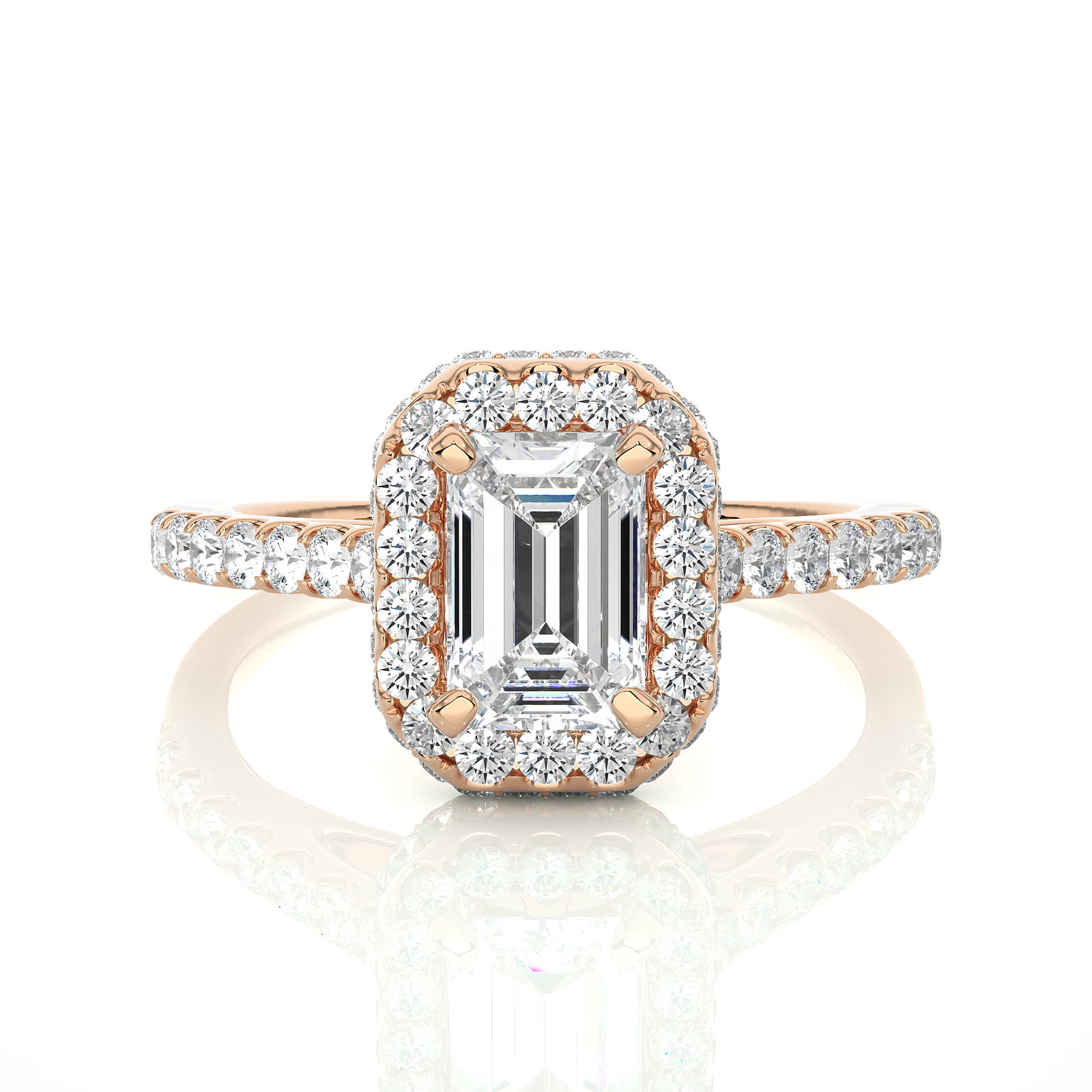 This exquisite gold ring features a stunning emerald-cut diamond center, surrounded by a sparkling halo of round diamonds. Additional diamonds adorn the band, creating a brilliant, timeless design. Perfect for engagements or special occasions, this ring offers elegance and sophistication with every dazzling detail.