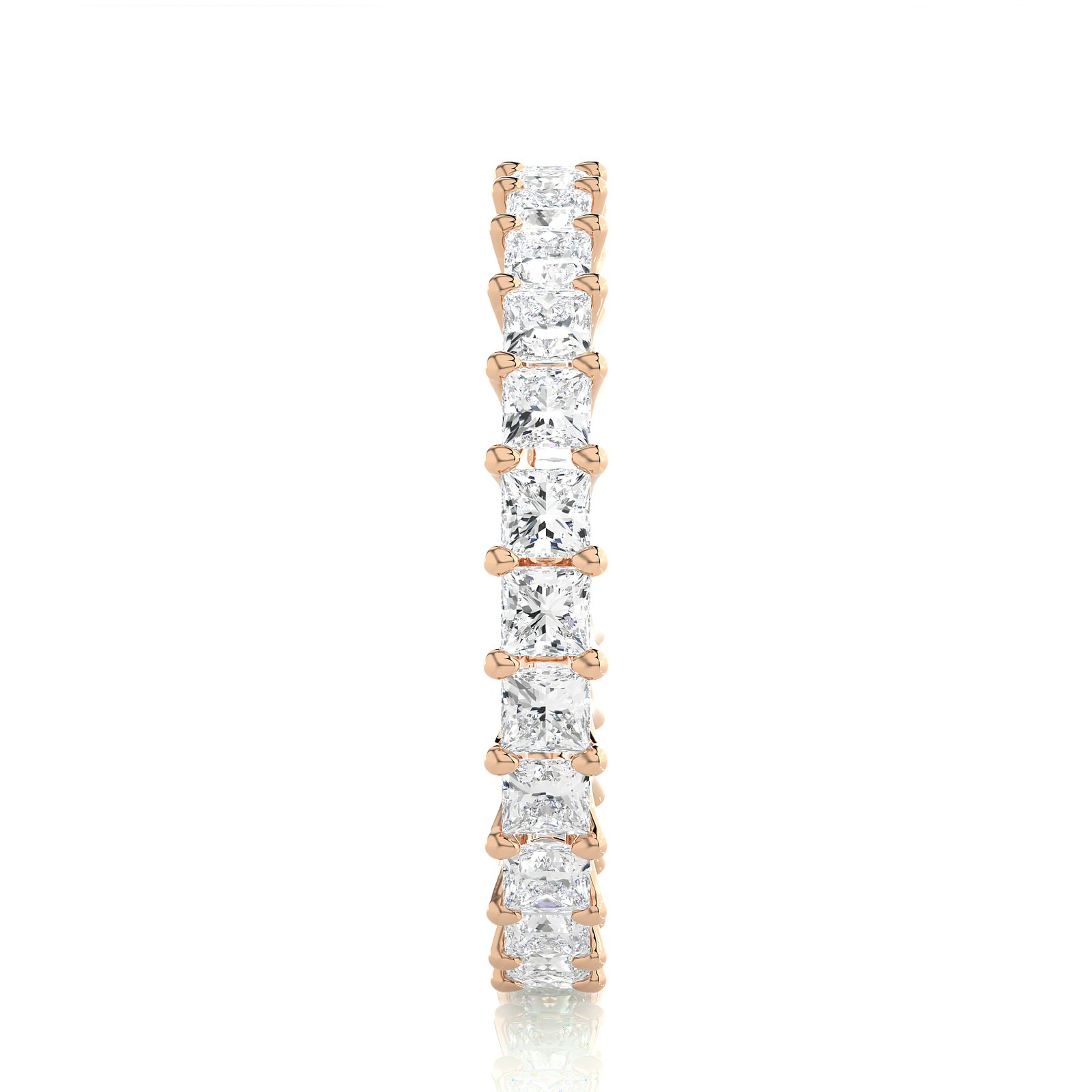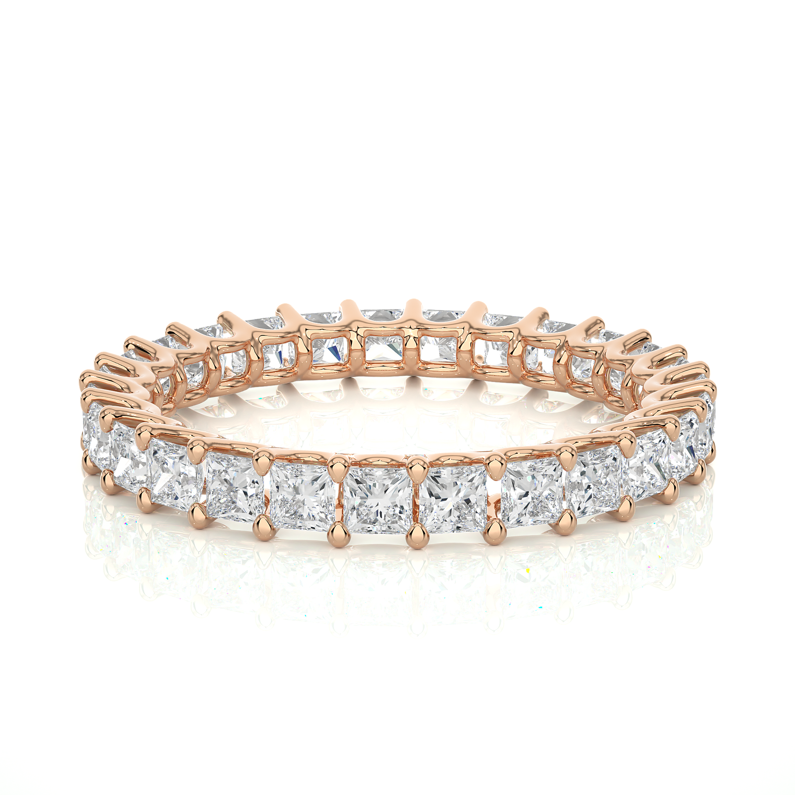 Celebrate everlasting love with this stunning eternity band crafted in rose gold. Featuring a continuous circle of dazzling princess-cut diamonds in a sleek prong setting, this ring radiates brilliance and timeless elegance. Perfect as a wedding band, anniversary gift, or stackable piece, it adds luxury and sparkle to any moment.