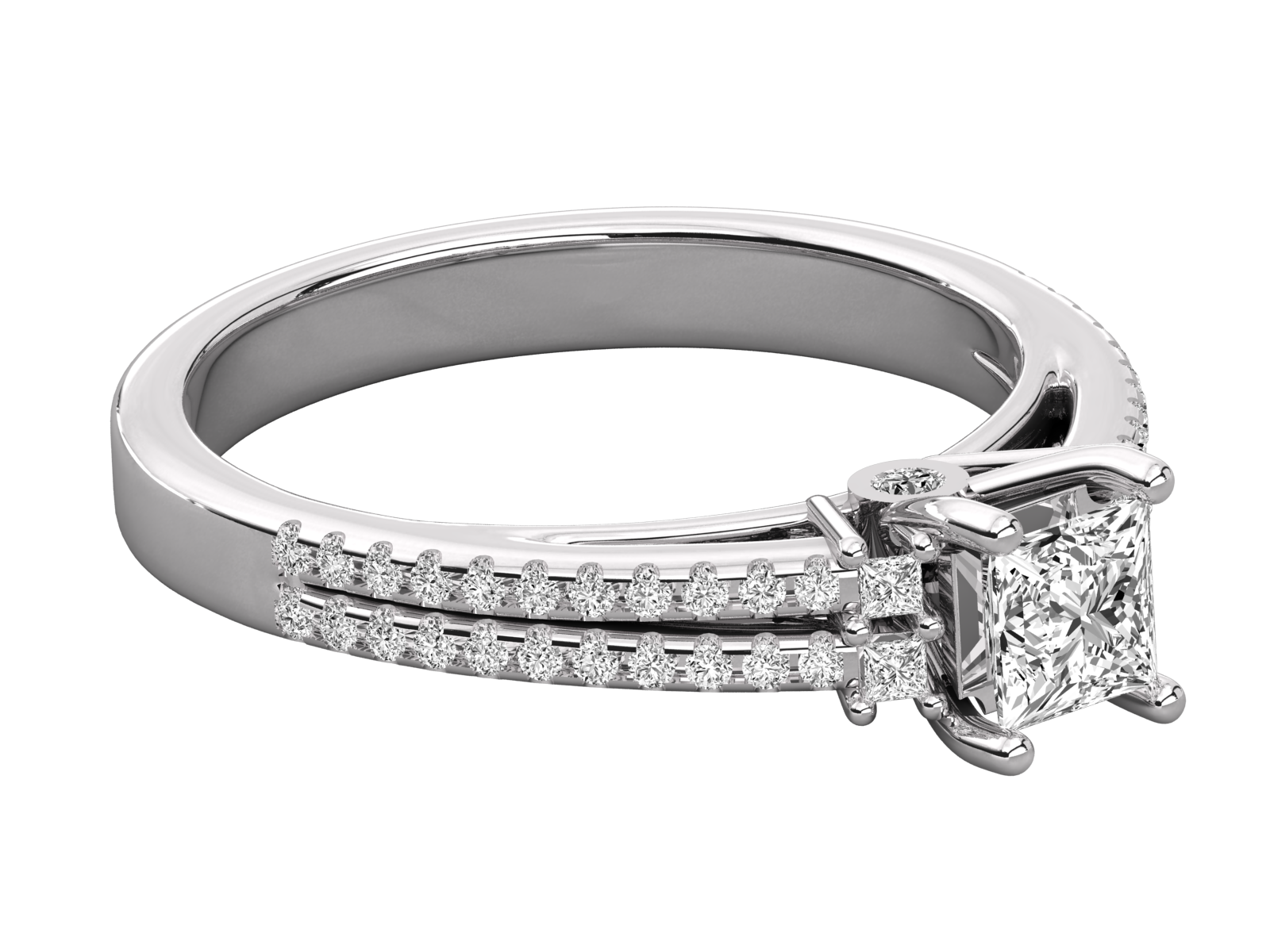 A sophisticated engagement ring featuring a captivating princess-cut diamond at its center, flanked by two sleek rows of pavé-set round diamonds on a polished rose gold band. The double-band design enhances brilliance and elegance, making it a timeless choice for those seeking modern beauty with a classic romantic touch.