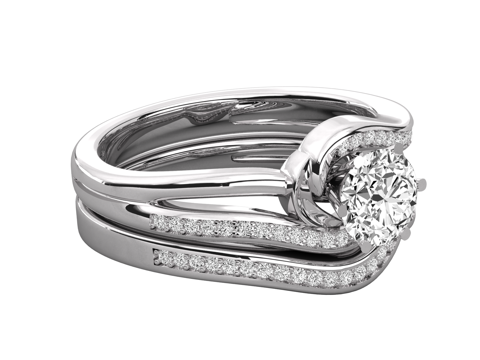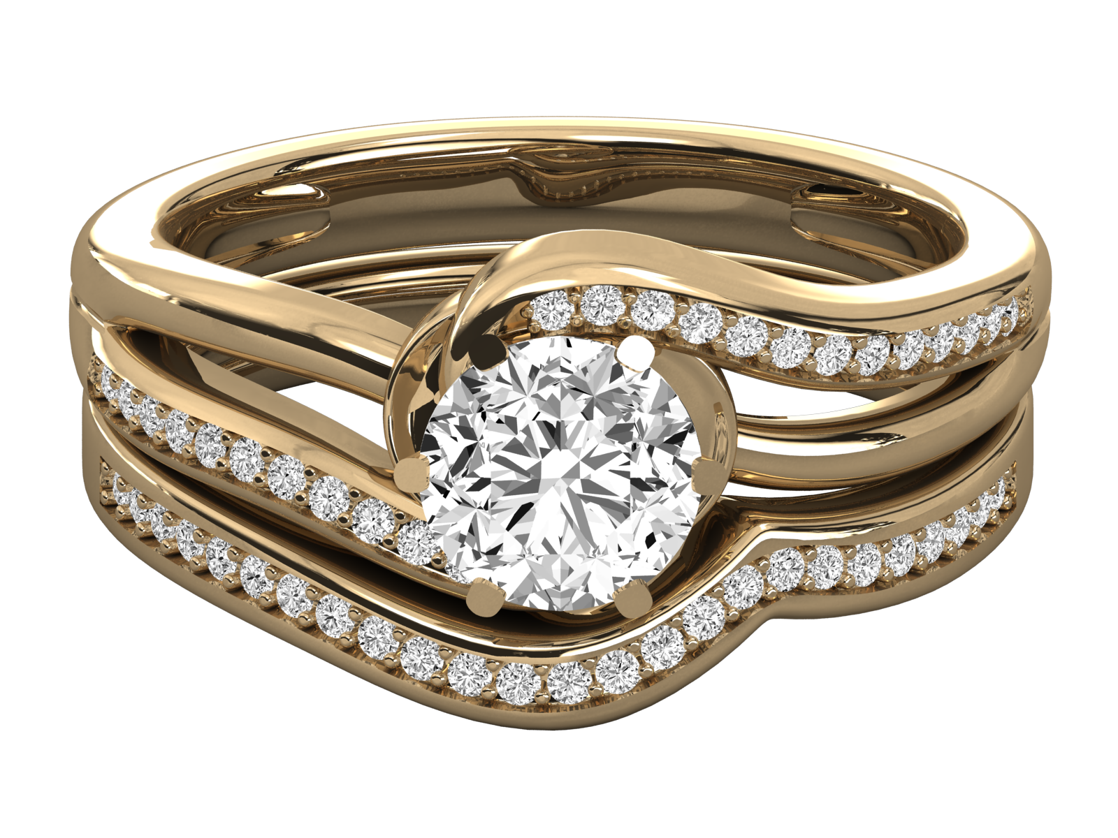 This captivating ring features a round-cut center diamond embraced by a flowing swirl of solid gold. Three elegantly curved bands, accented with pavé-set diamonds, add brilliance and depth. The unique, romantic design symbolizes eternal unity, making it a perfect choice for engagements or special anniversaries. Bold yet gracefully timeless.