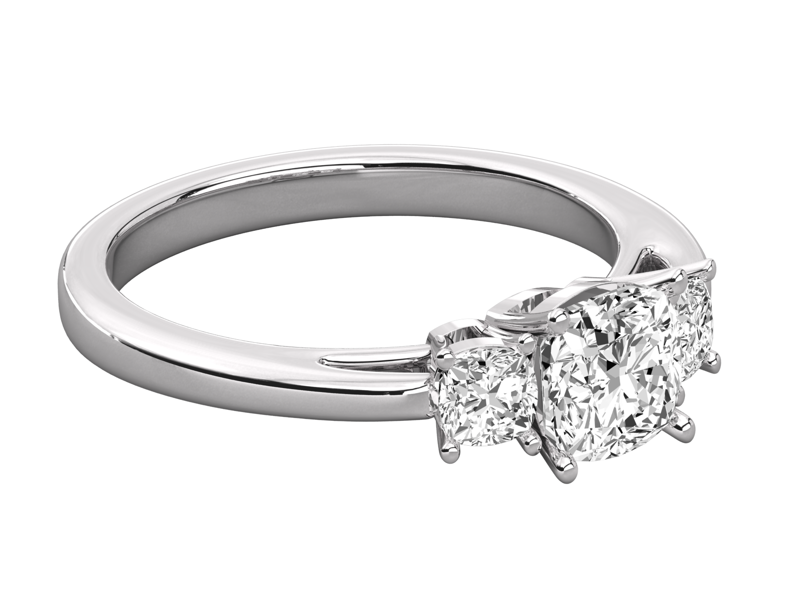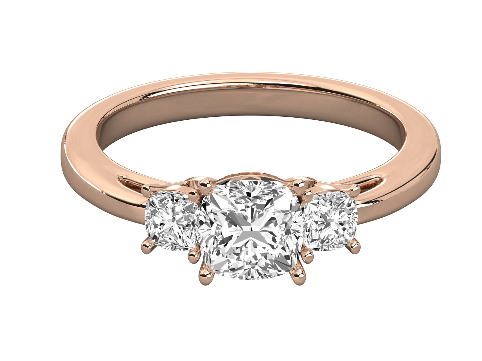 This exquisite three-stone diamond ring. Set in polished gold, the central cushion-cut diamond is flanked by two brilliant round diamonds, symbolizing your past, present, and future. A perfect blend of classic design and modern brilliance, it’s an ideal choice for engagements or special milestones.