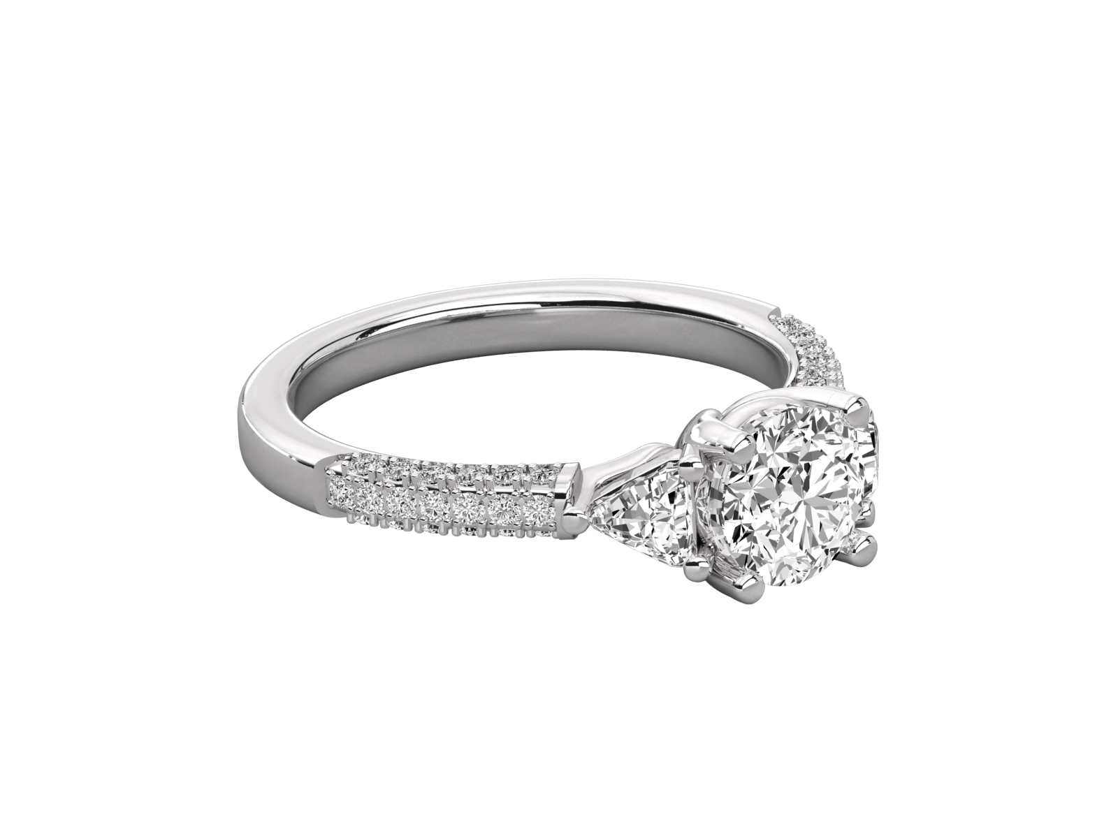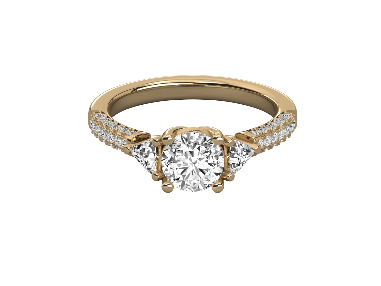 This exquisite gold ring features a dazzling round-cut center diamond flanked by two stunning trillion-cut side stones. The band is adorned with pavé-set diamonds, adding extra brilliance and charm. A perfect blend of elegance and luxury, ideal for engagements or special milestones. Celebrate timeless beauty with this captivating piece.