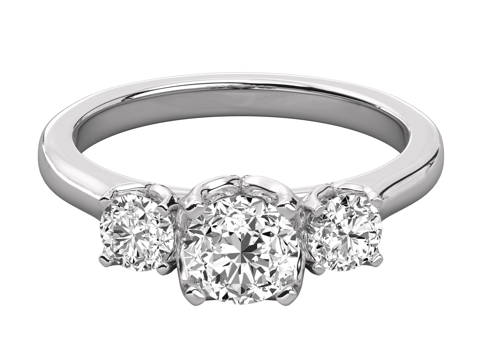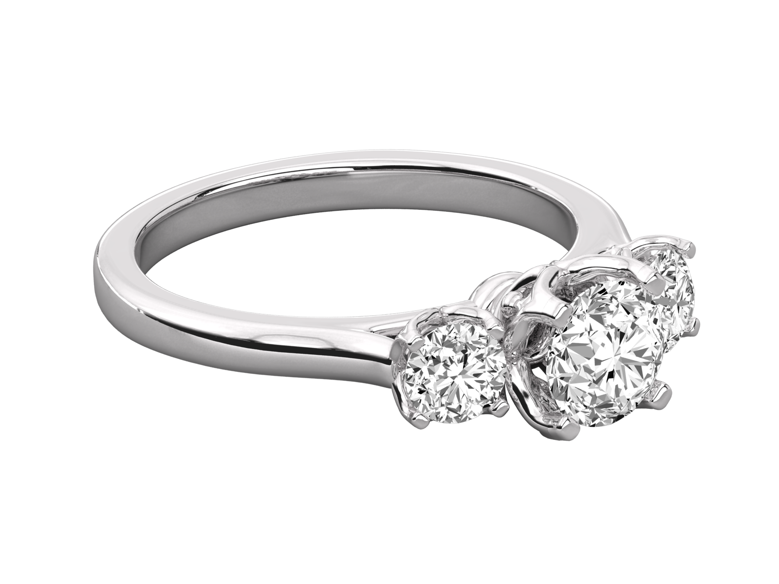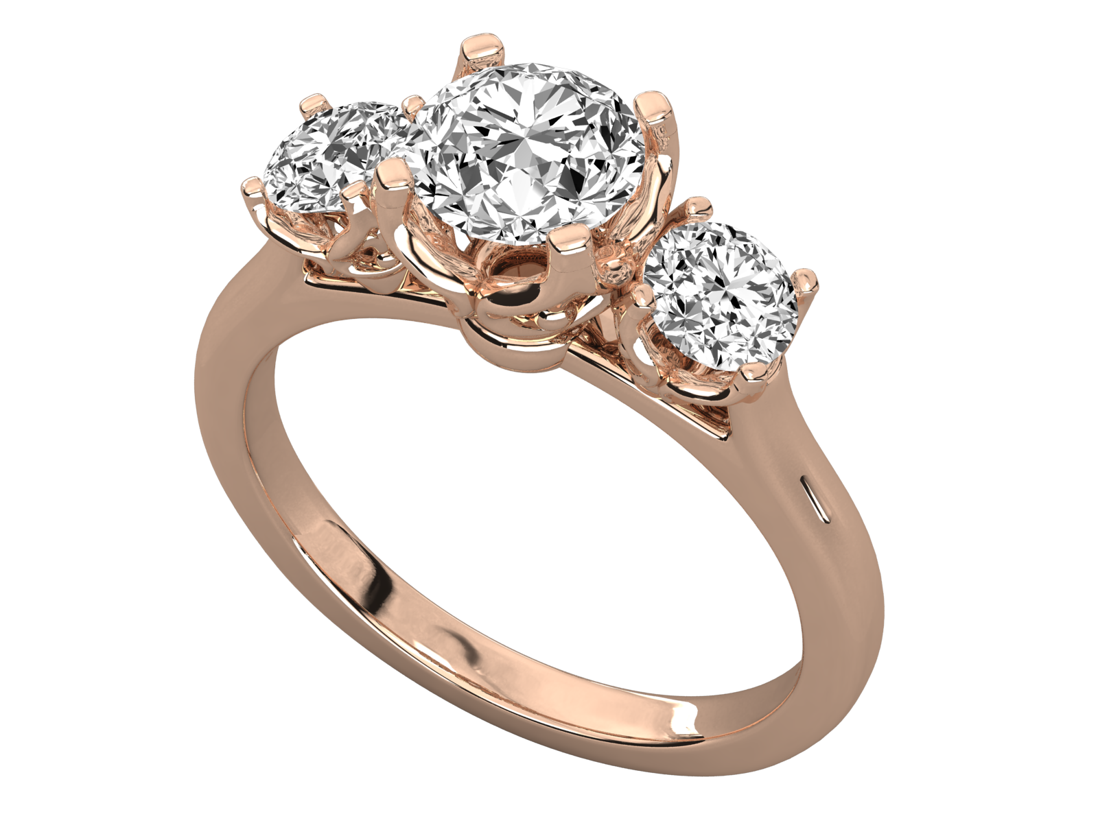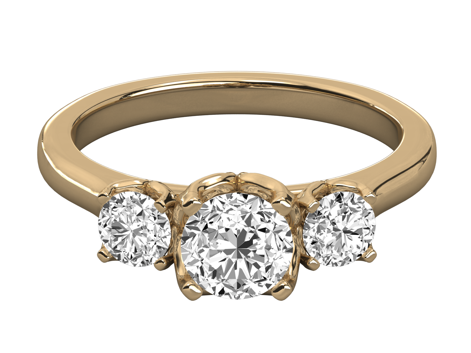 This three-stone ring features a brilliant round-cut center diamond accented by two perfectly matched side stones. Set in radiant yellow gold, the trio symbolizes your journey together—past, present, and future. A graceful and meaningful choice for engagements, anniversaries, or special milestones. Refined beauty that lasts forever.