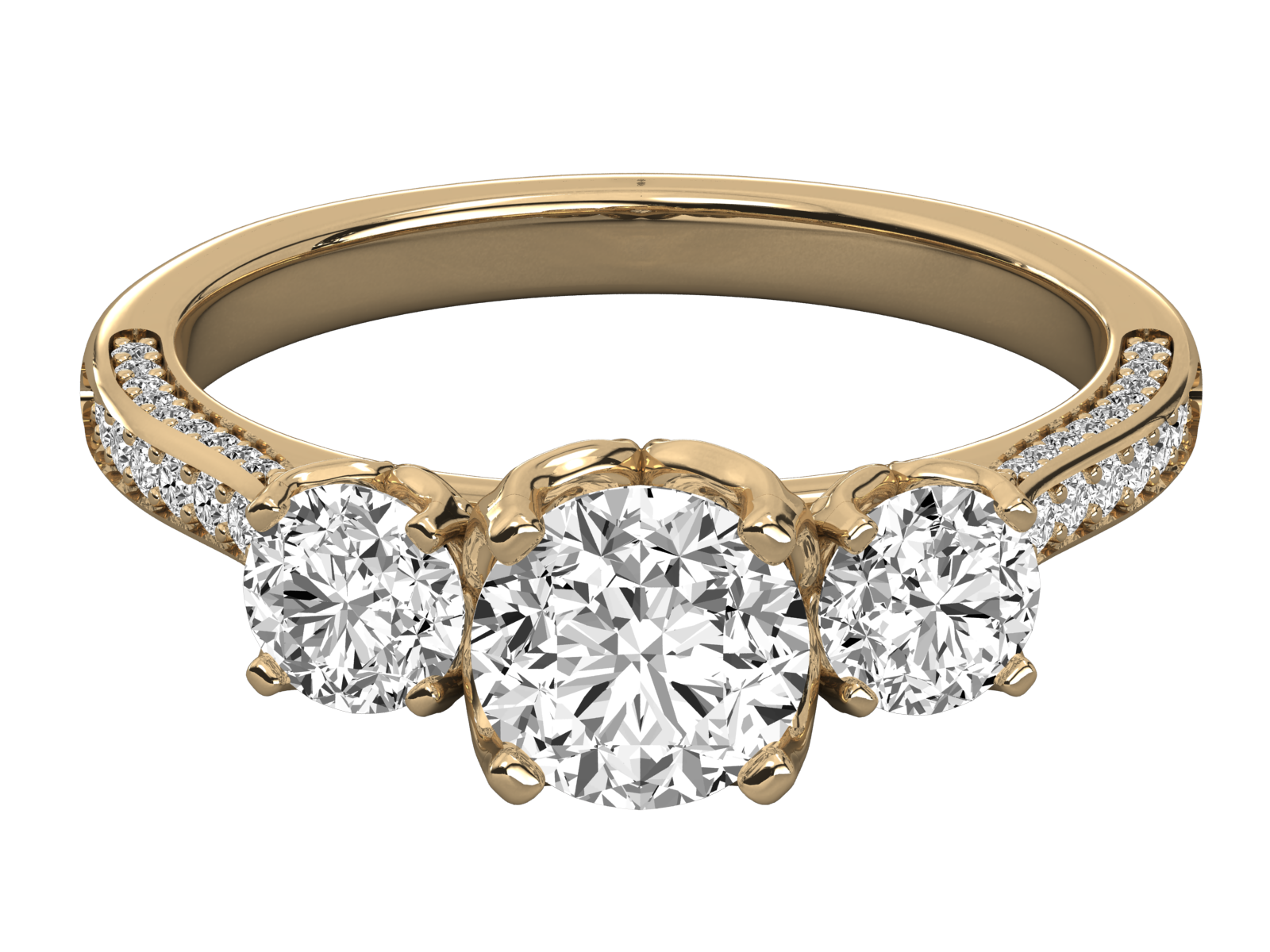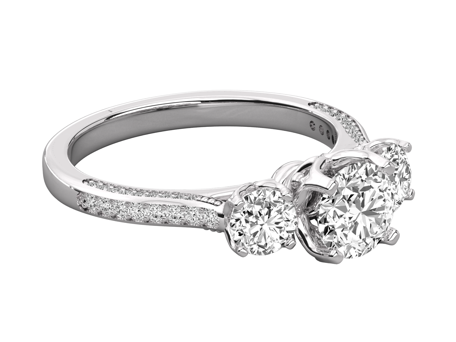This stunning white gold trilogy ring. Featuring three brilliant round-cut diamonds as the centerpiece and a split-shank band adorned with pavé-set accents, this design radiates elegance and luxury. Perfect for anniversaries or milestones, this ring symbolizes the past, present, and future of your beautiful journey together.