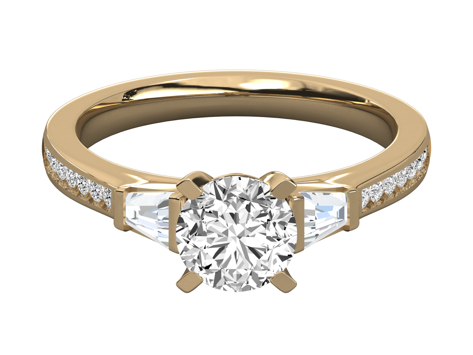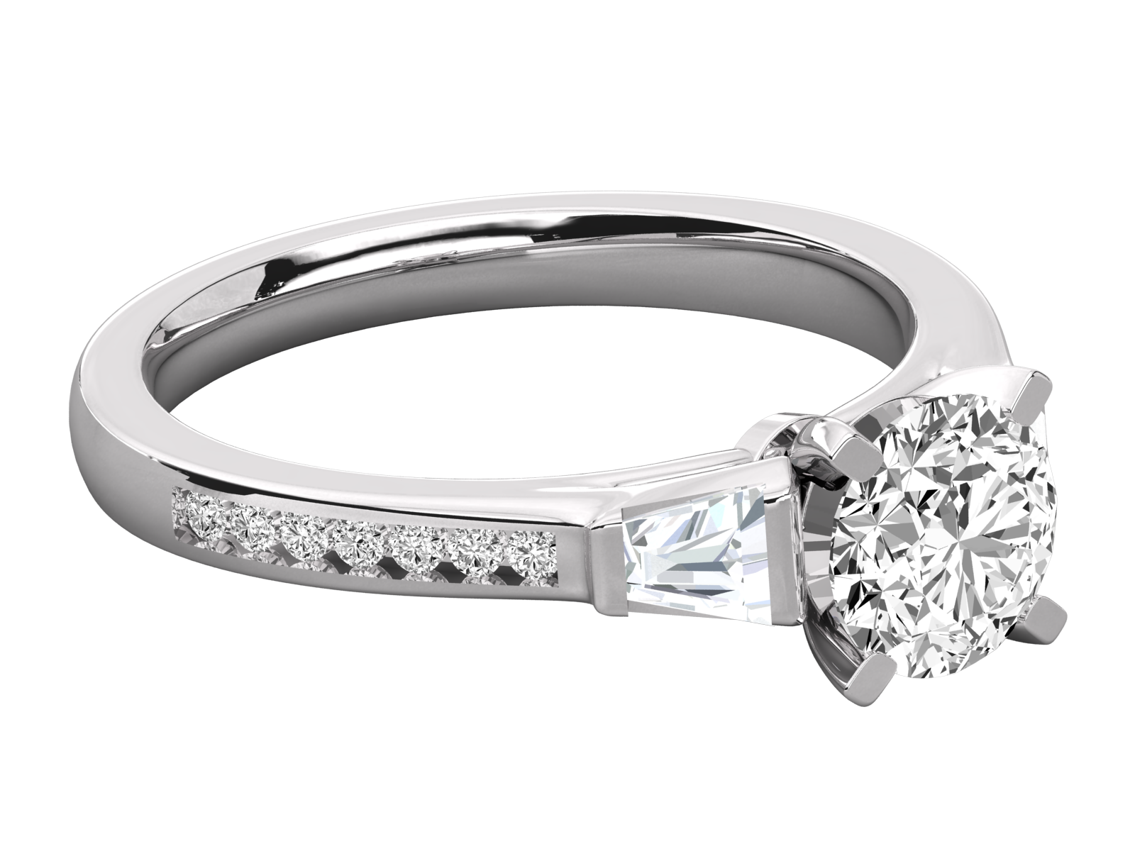 This sophisticated engagement ring features a brilliant round-cut center diamond flanked by sleek tapered baguette diamonds. Set in luminous white gold, the band is delicately adorned with accent stones for extra sparkle. A modern yet timeless design, perfect for those who appreciate clean lines, elegance, and understated luxury.