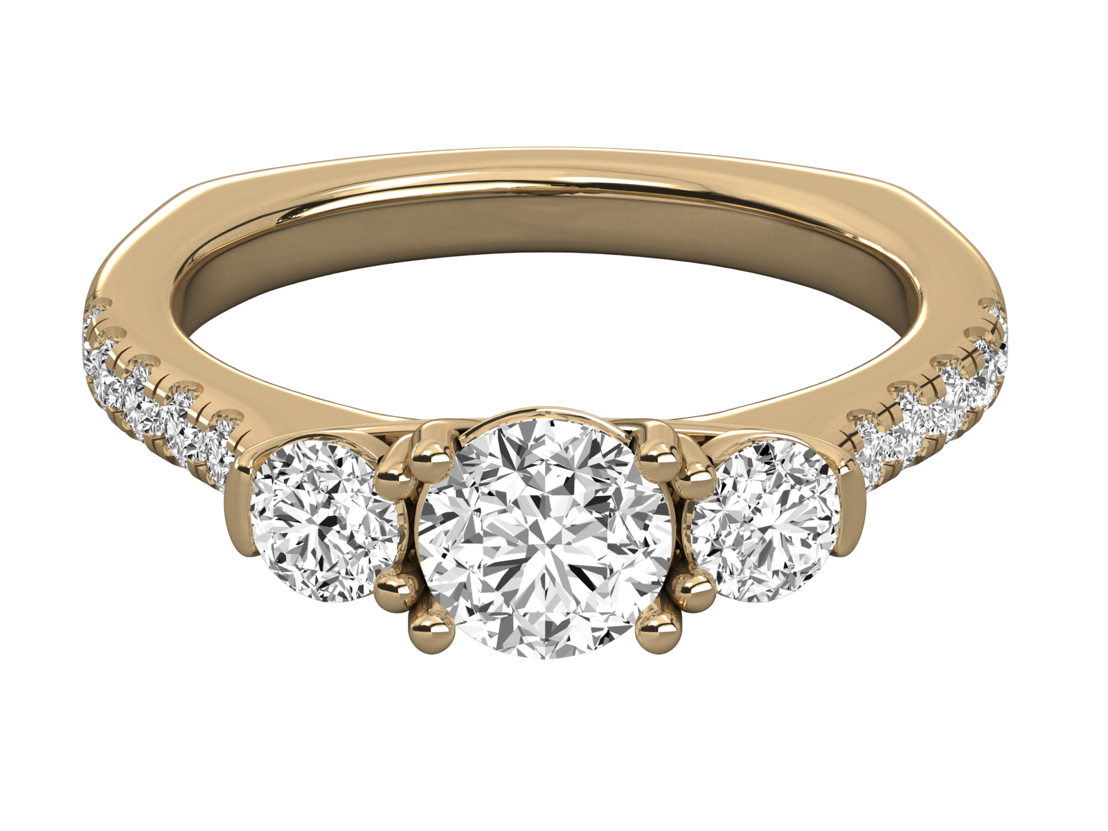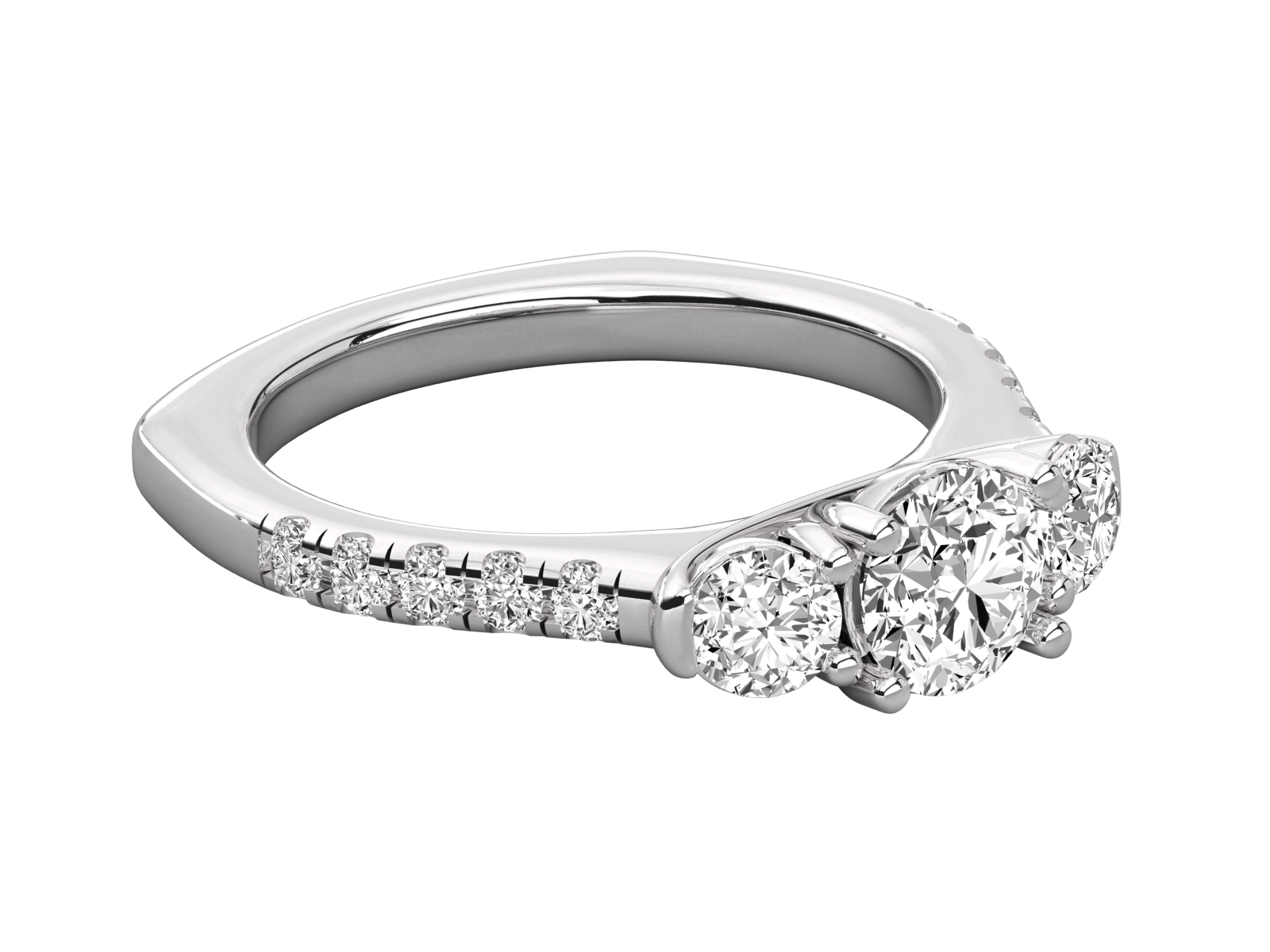 This elegant three-stone diamond ring features a brilliant round center diamond flanked by two sparkling side stones. The band is adorned with a row of pavé-set diamonds for added brilliance. A timeless piece symbolizing love’s journey—perfect for engagements, anniversaries, or meaningful celebrations.