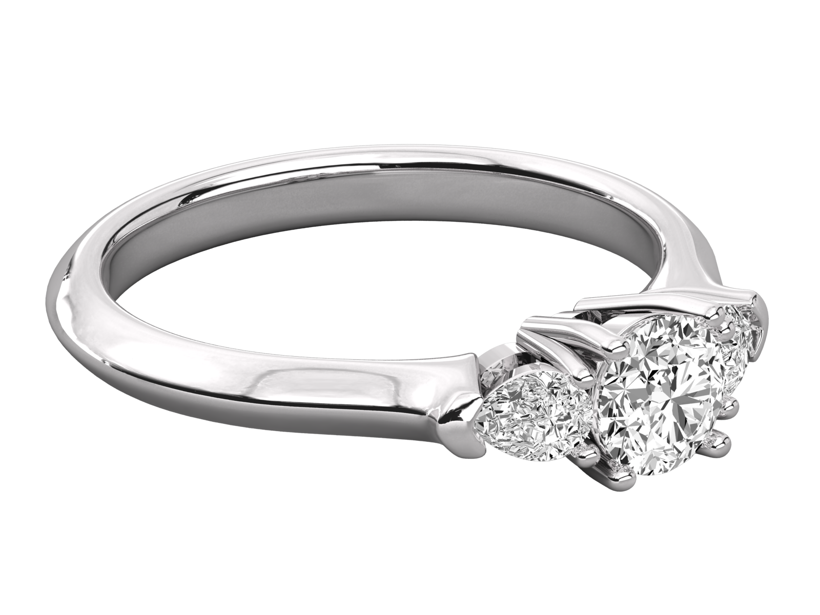This sophisticated three-stone ring, featuring a brilliant round center diamond accented by two pear-shaped side stones. Set in polished white gold, this classic yet contemporary design symbolizes your past, present, and future together. A stunning choice for engagements or anniversaries, crafted to last a lifetime.