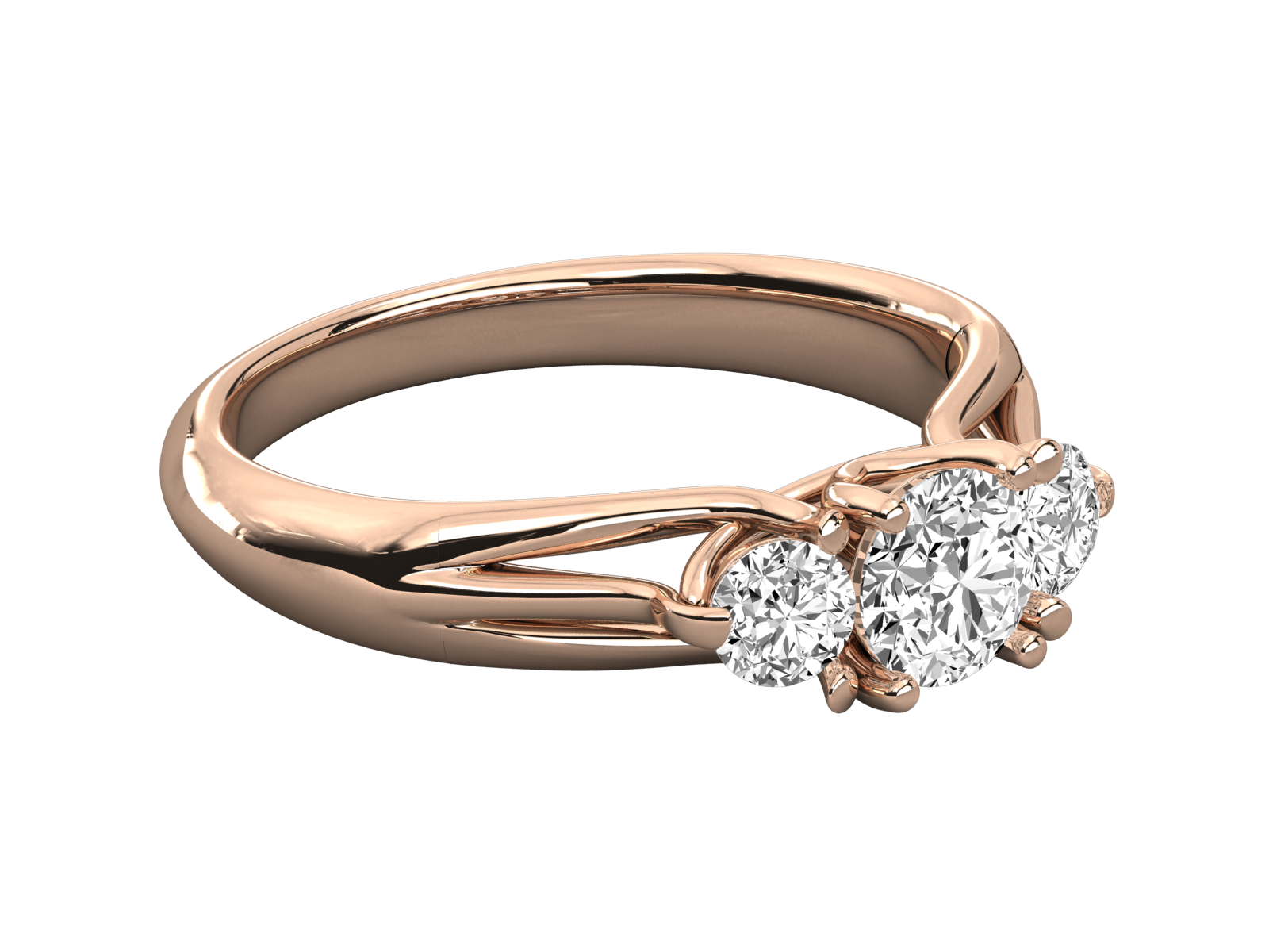 This exquisite three-stone diamond ring features a round-cut center stone flanked by two dazzling side diamonds, all set in a graceful split-shank white gold band. Symbolizing your journey through time—past, present, and future—this timeless design blends elegance and sentiment, making it a perfect choice for engagements or anniversaries.