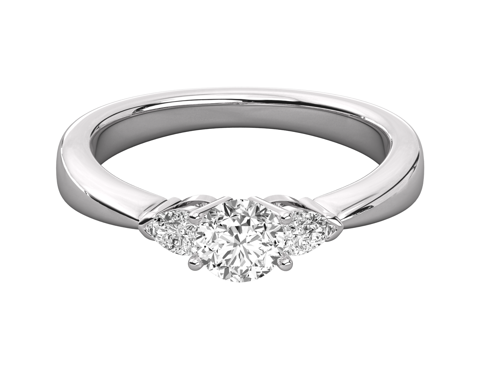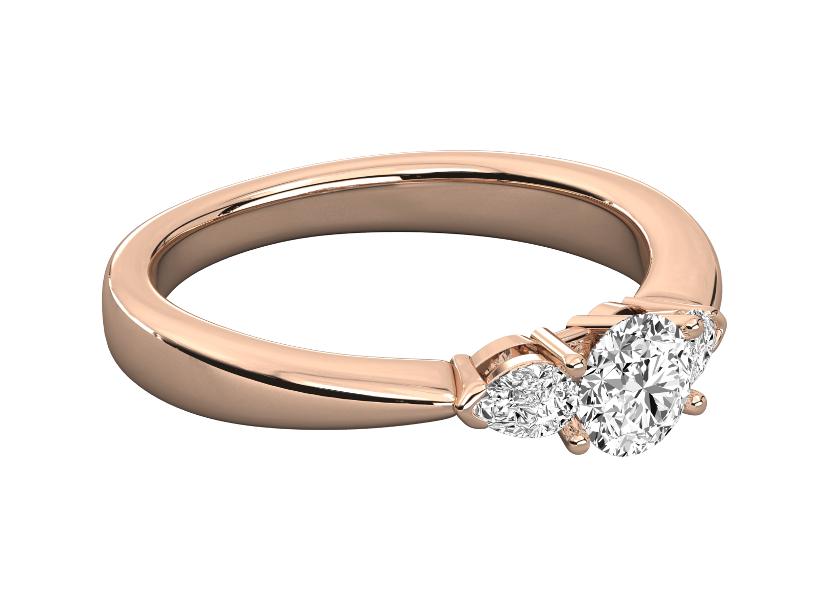 This timeless three-stone diamond ring, crafted in solid gold. Featuring a brilliant round center diamond flanked by two pear-shaped side stones, this design balances classic elegance with modern flair. Perfectly symbolic of your past, present, and future together—a stunning expression of enduring commitment and beauty.