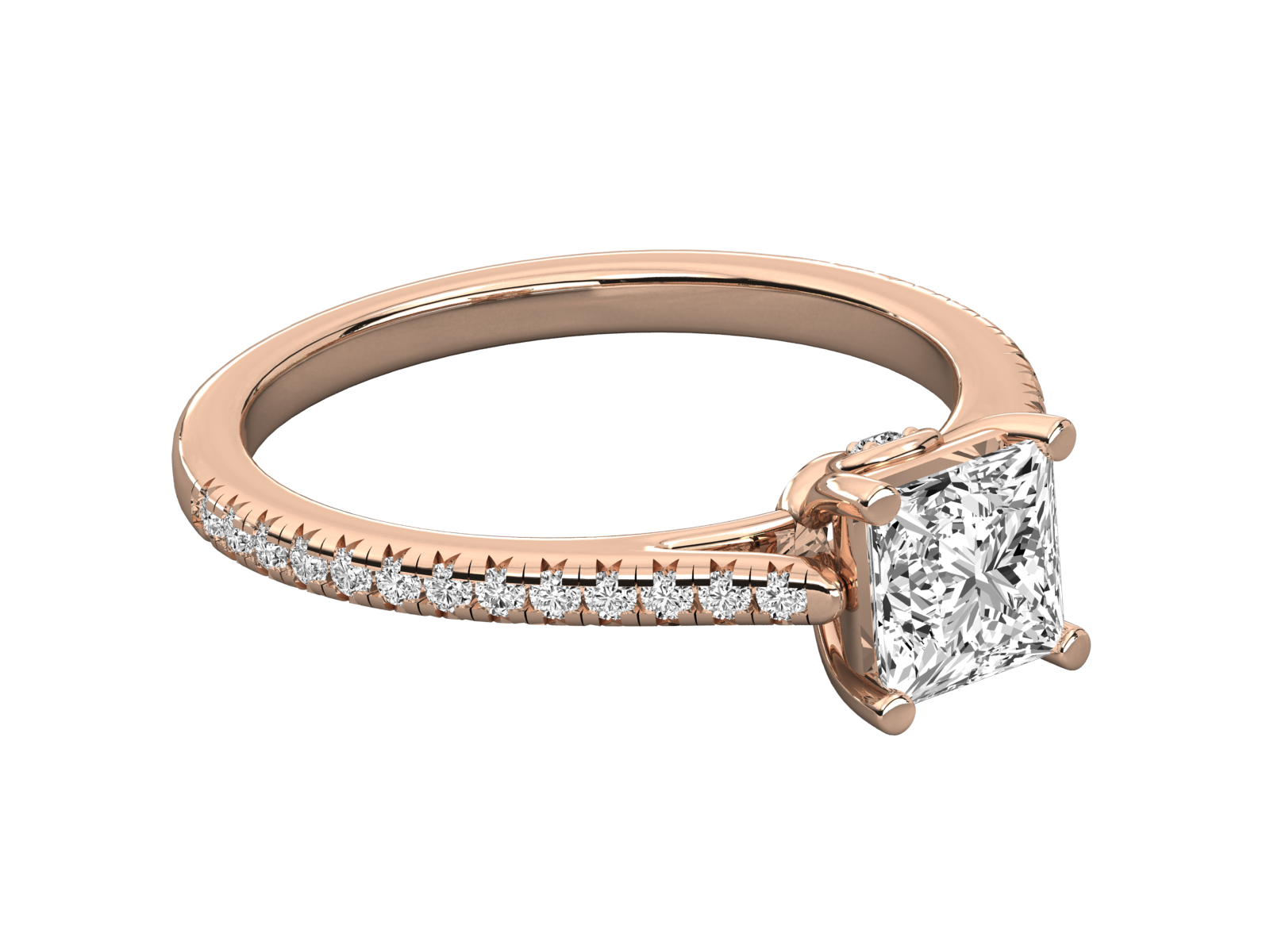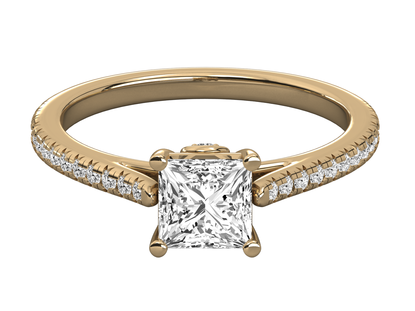This exquisite gold ring showcases a stunning round brilliant center diamond secured by a bold prong setting. Channel-set princess cut diamonds elegantly line the shank, adding extra sparkle and sophistication. Perfect for engagements or special occasions, this ring blends timeless elegance with a touch of modern design.