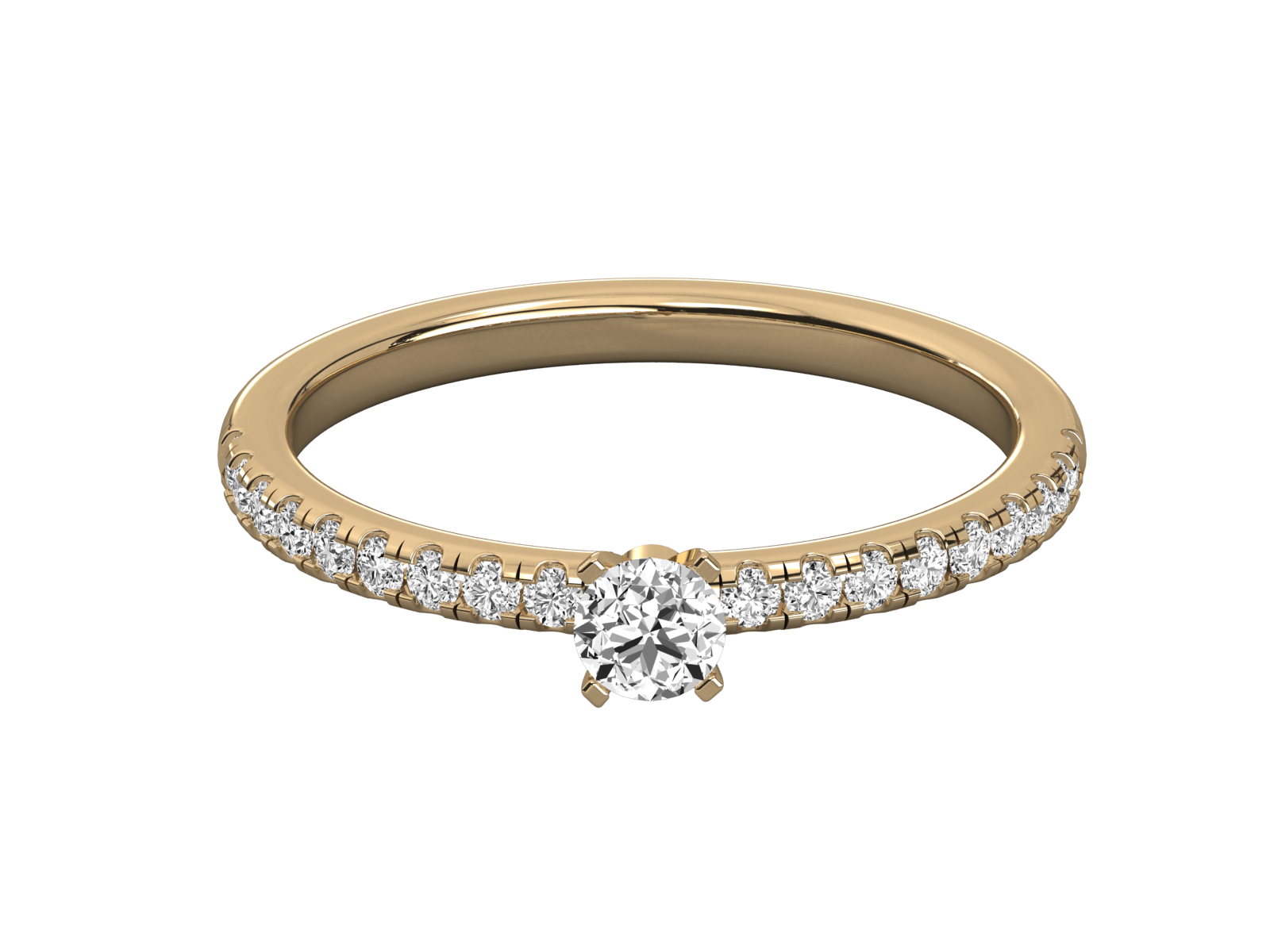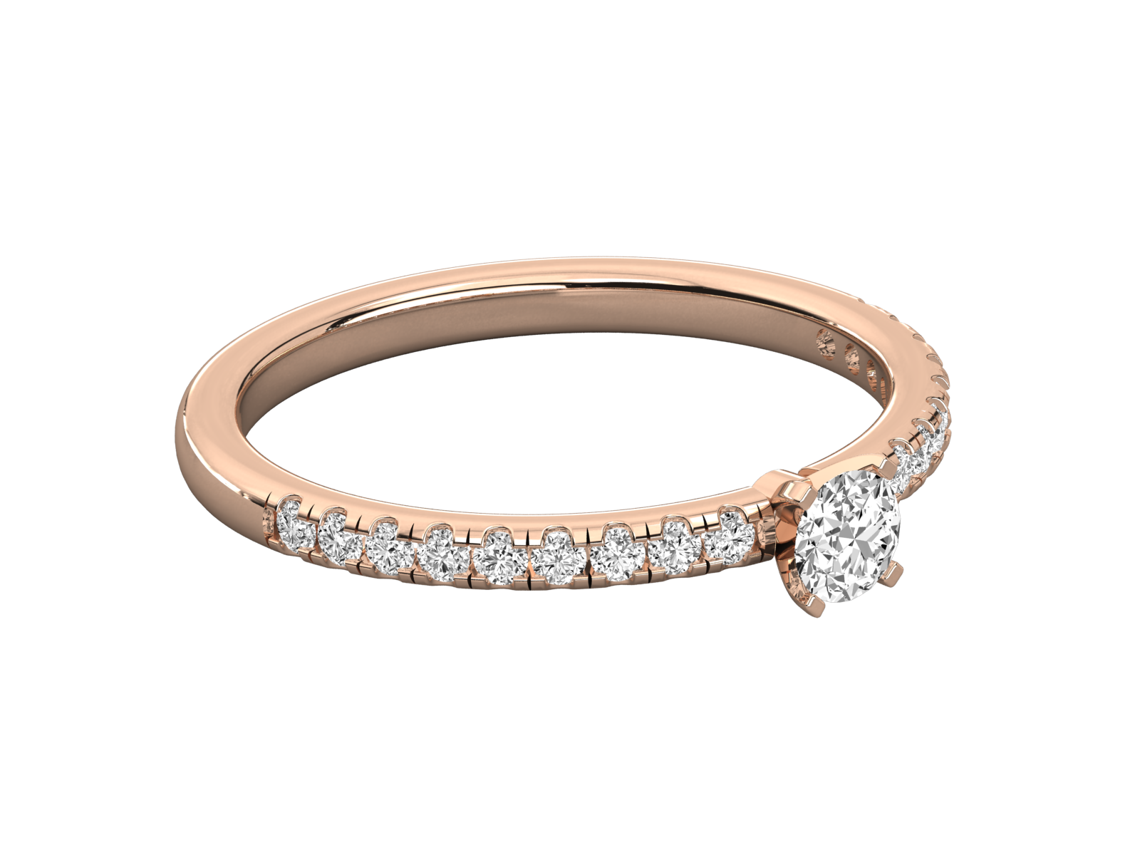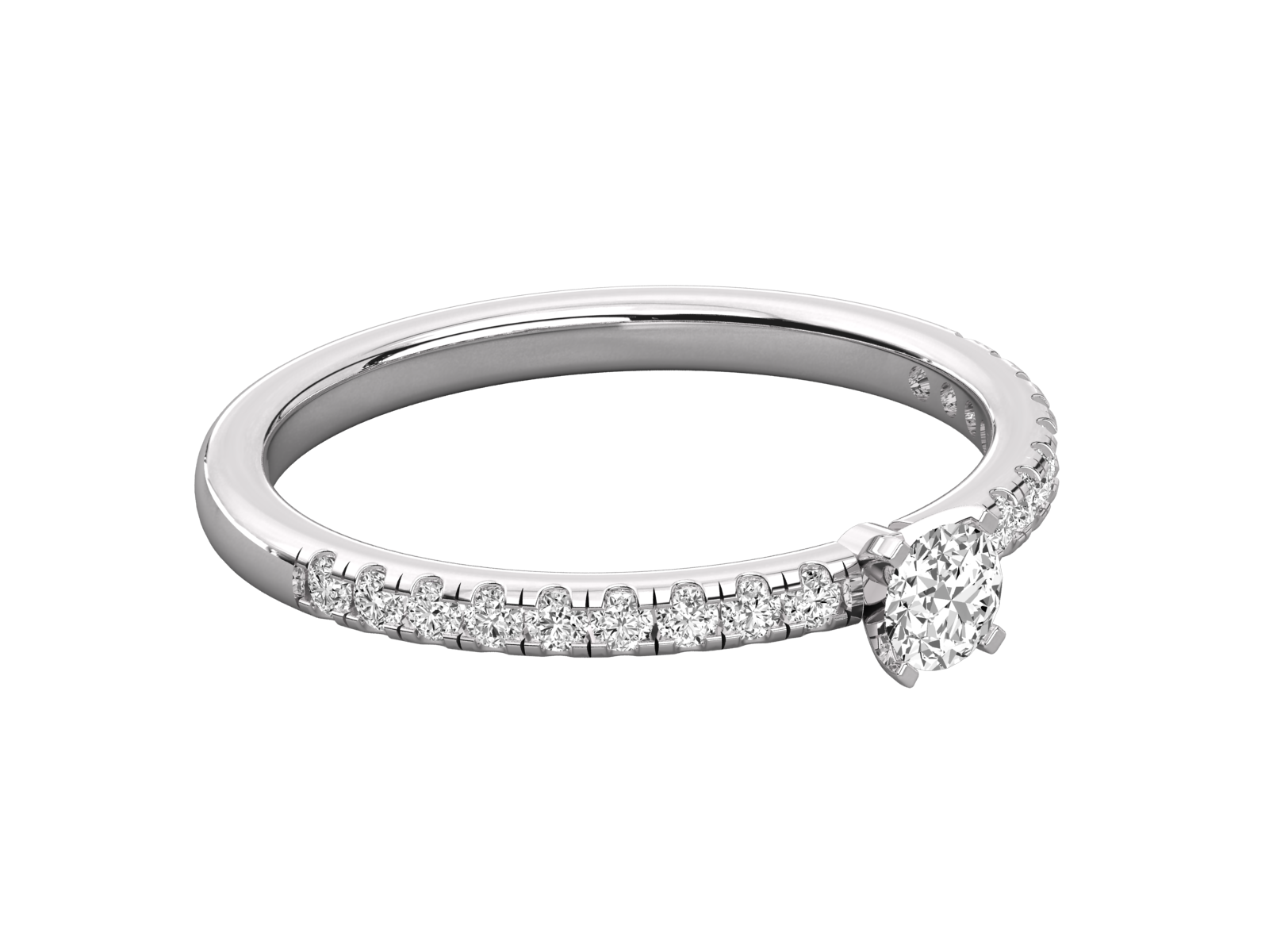 This elegant solitaire engagement ring features a brilliant round-cut diamond set atop a sleek white gold band. Accented with a line of pavé-set diamonds, the ring radiates classic sophistication. Perfect for a timeless proposal, it’s a symbol of enduring love and refined style—designed to be cherished forever.