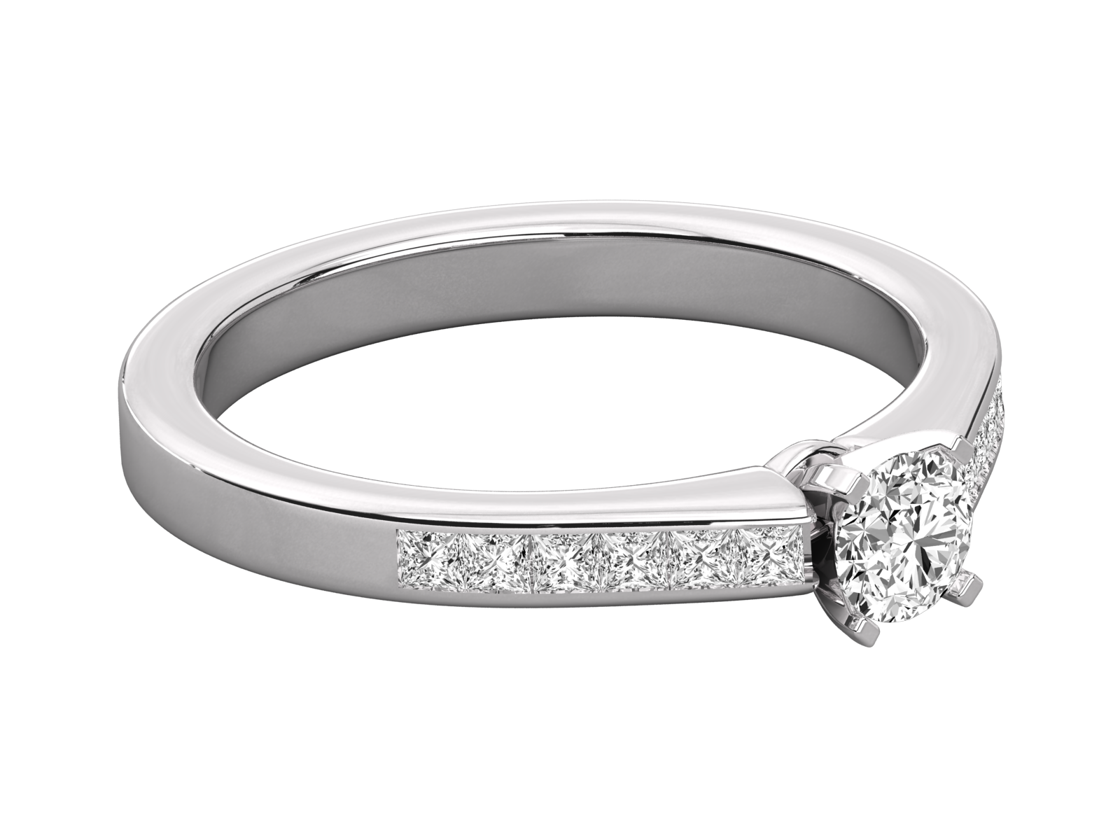 This elegant engagement ring features a stunning round-cut center diamond set in warm yellow gold. The band is adorned with channel-set princess-cut diamonds for added brilliance and sophistication. A timeless design that combines clean lines and classic sparkle, perfect for celebrating a love that lasts forever.