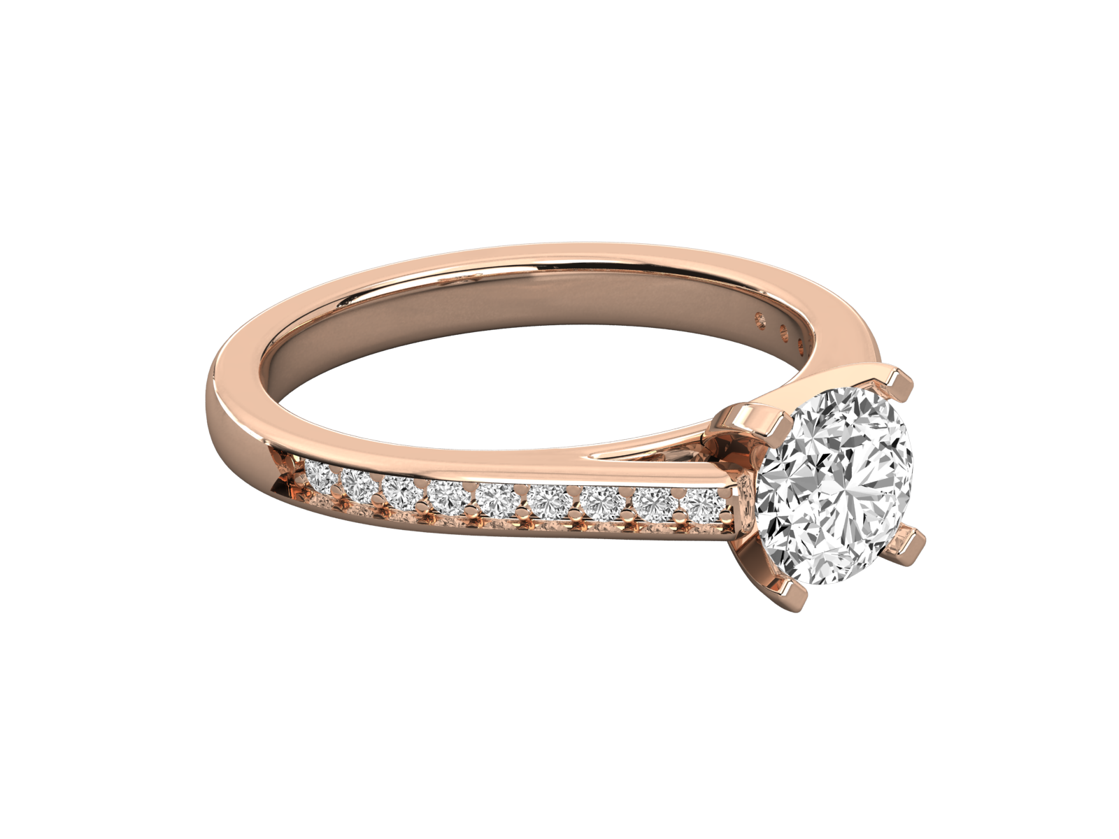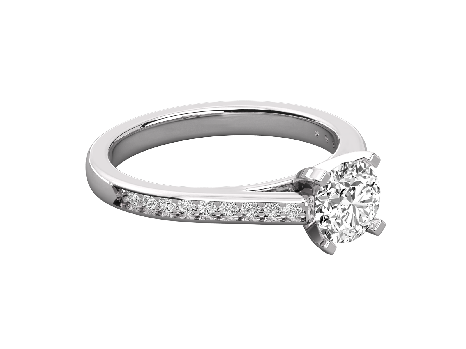 This timeless engagement ring showcases a brilliant round-cut center diamond, securely held in a classic four-prong setting. The sleek white gold band features a shimmering row of pavé-set diamonds, adding radiant sparkle and sophistication. A perfect expression of eternal love, designed to captivate hearts with its refined elegance.