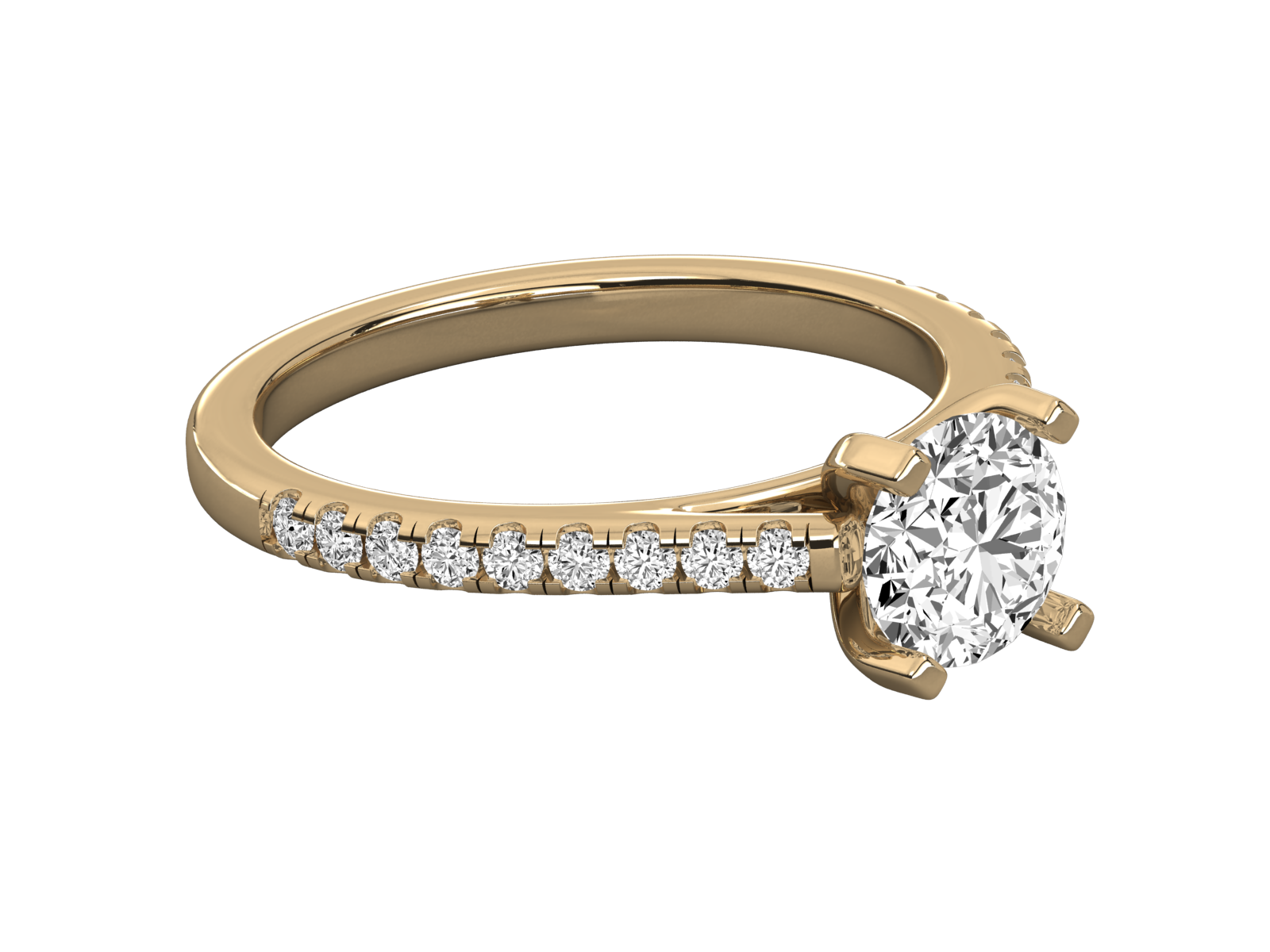 This stunning yellow gold ring features a brilliant round solitaire diamond set in a classic four-prong setting. The slender band is adorned with sparkling pavé diamonds, adding subtle glamour and sophistication. Perfect for engagements or special occasions, this ring embodies timeless elegance and refined beauty.
