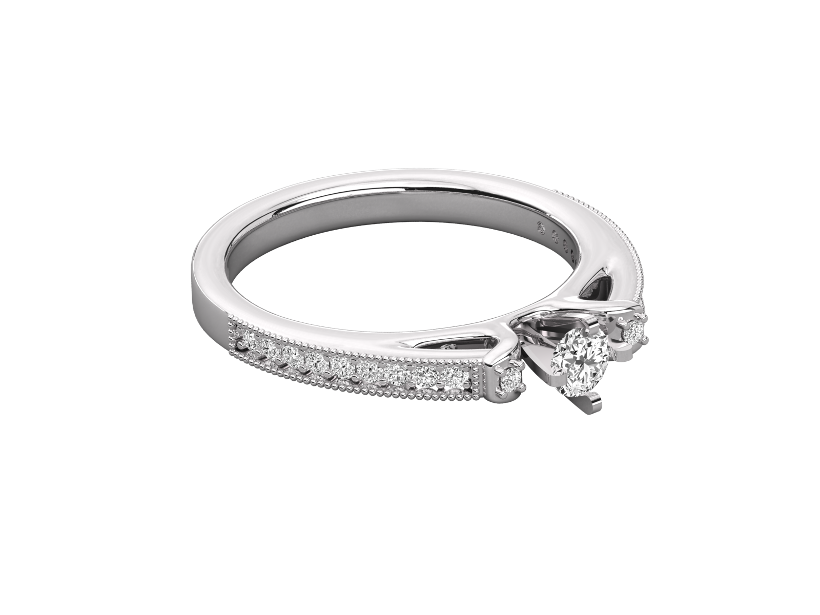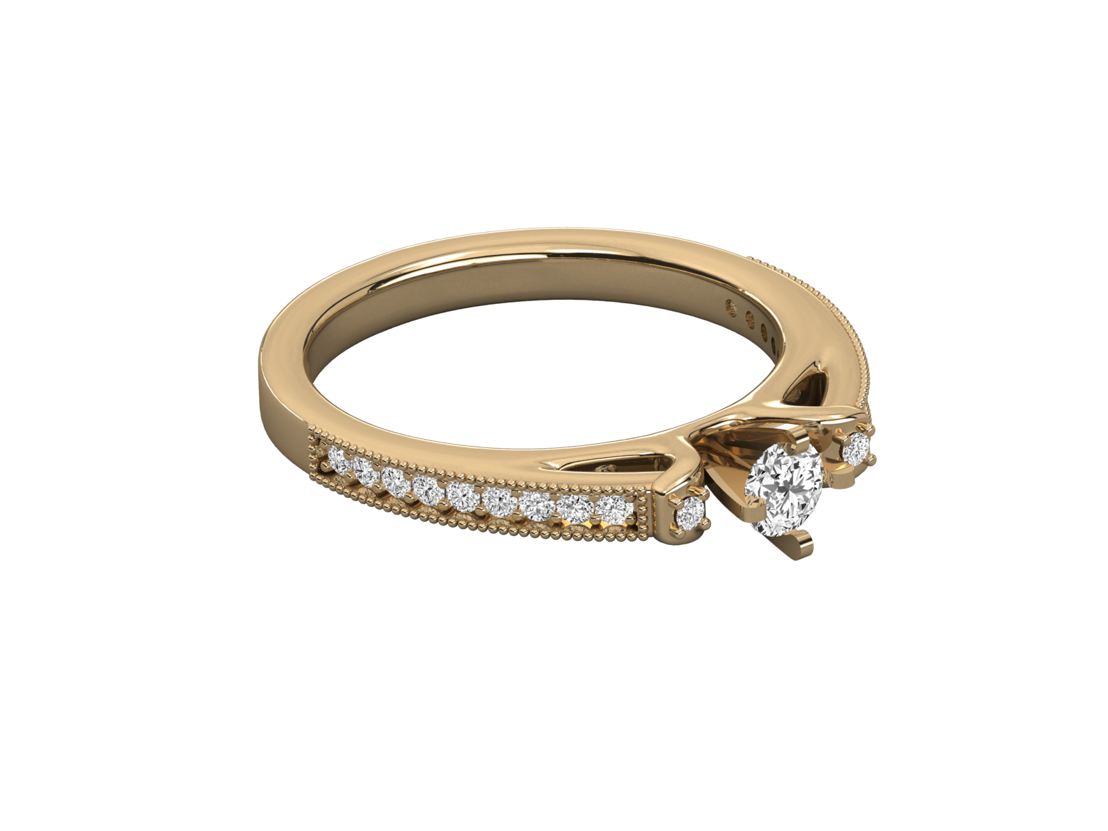 This stunning solid gold engagement ring features a brilliant central diamond set in a secure four-prong setting. Milgrain detailing along the band adds vintage charm, while smaller diamond accents enhance its sparkle. A perfect blend of timeless elegance and intricate craftsmanship for your special moment.