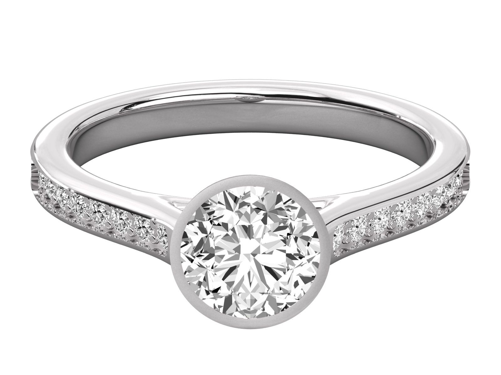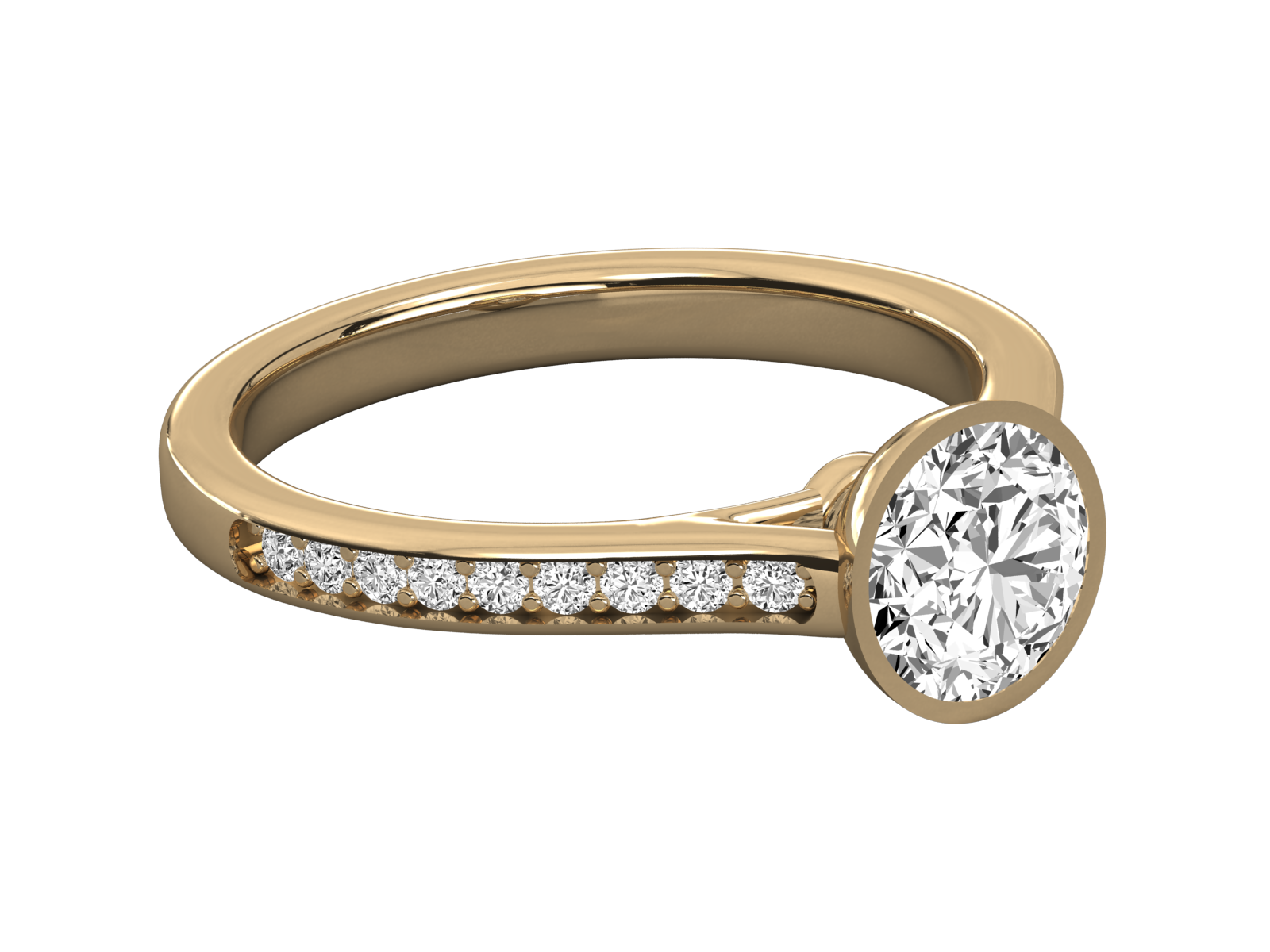 This stunning gold engagement ring features a bezel-set round diamond center stone, accented by a pavé diamond band for extra sparkle. A modern twist on a classic design, it's perfect for brides who love elegance and simplicity. Ideal for engagements, anniversaries, or as a meaningful gift.