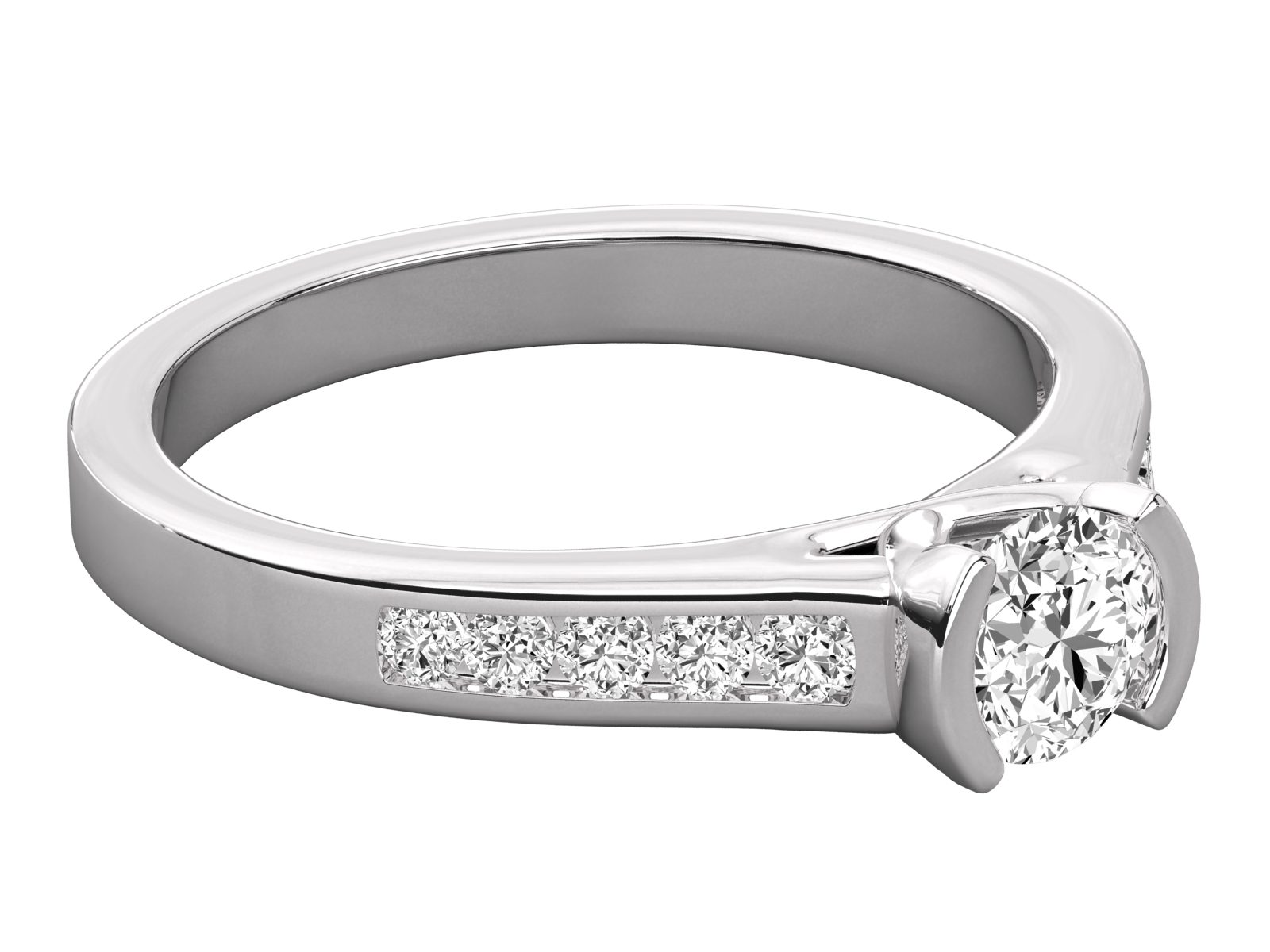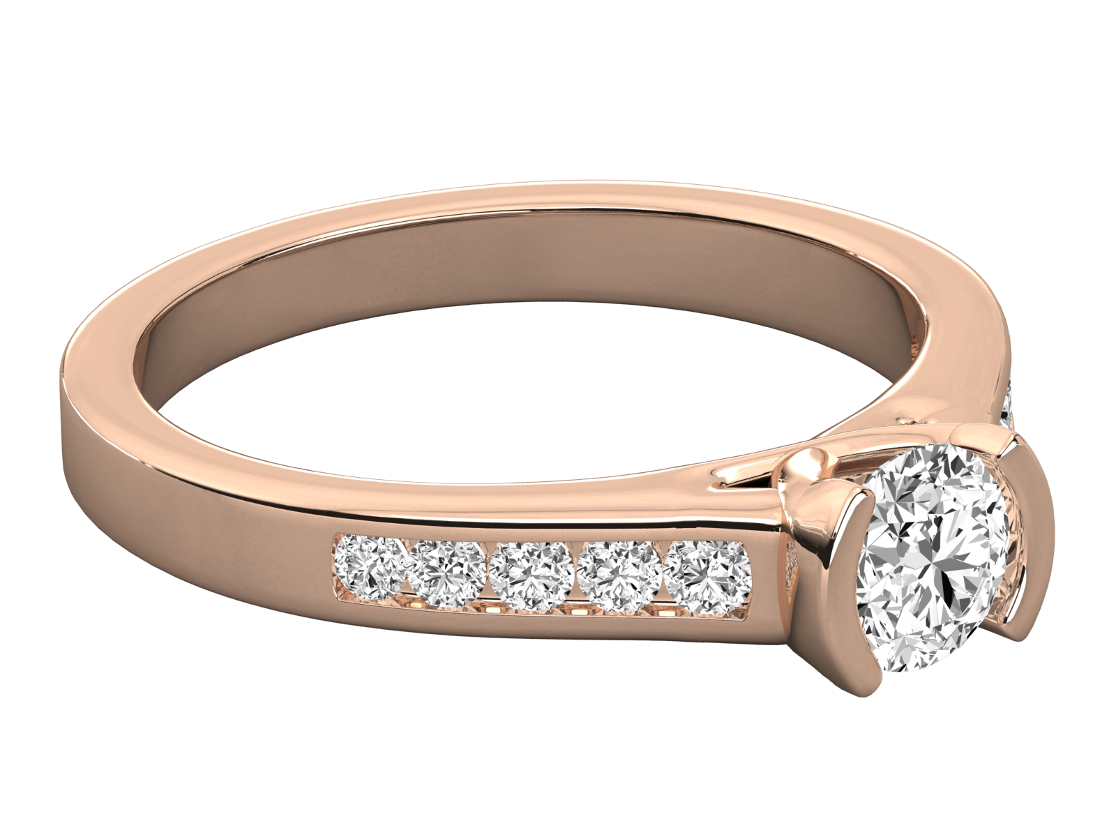 This modern gold engagement ring showcases a brilliant round diamond center in a secure half-bezel setting. Channel-set diamonds enhance both sides of the band, creating a seamless flow of sparkle. Sleek, bold, and beautifully balanced — ideal for brides who adore clean lines with a luxurious touch.
