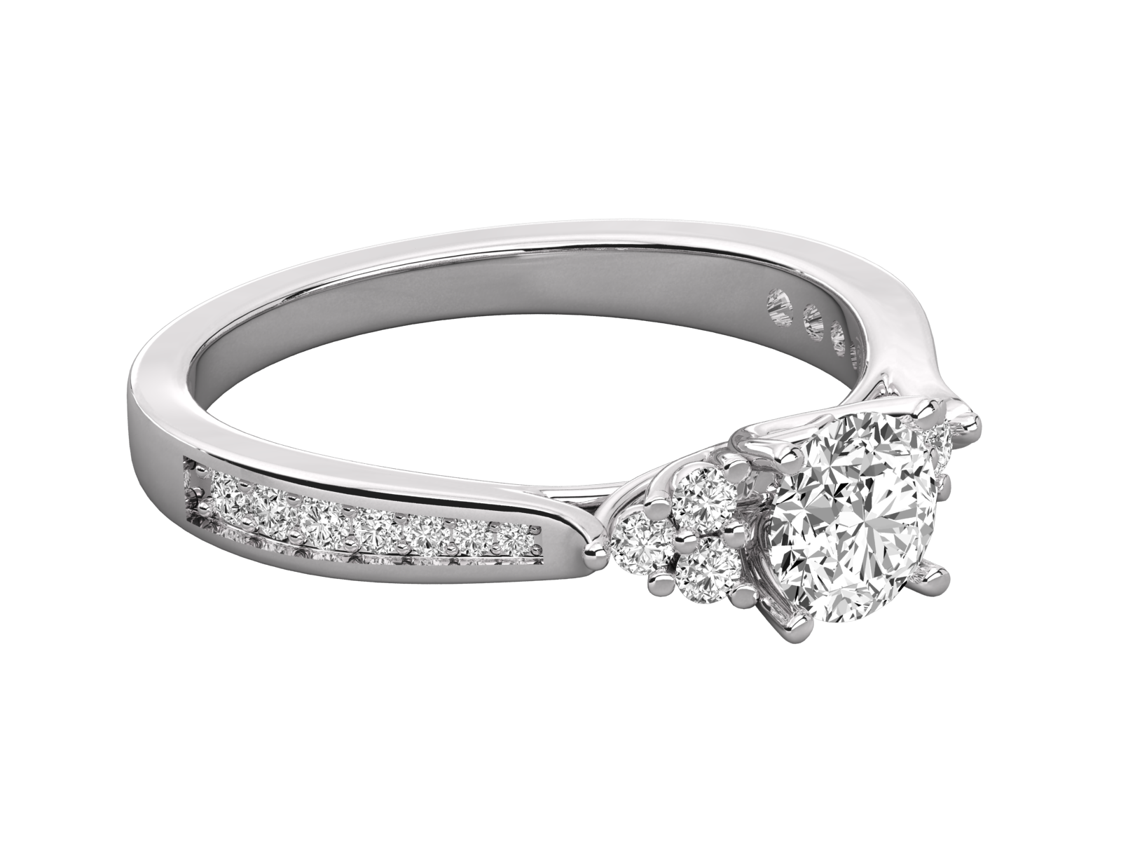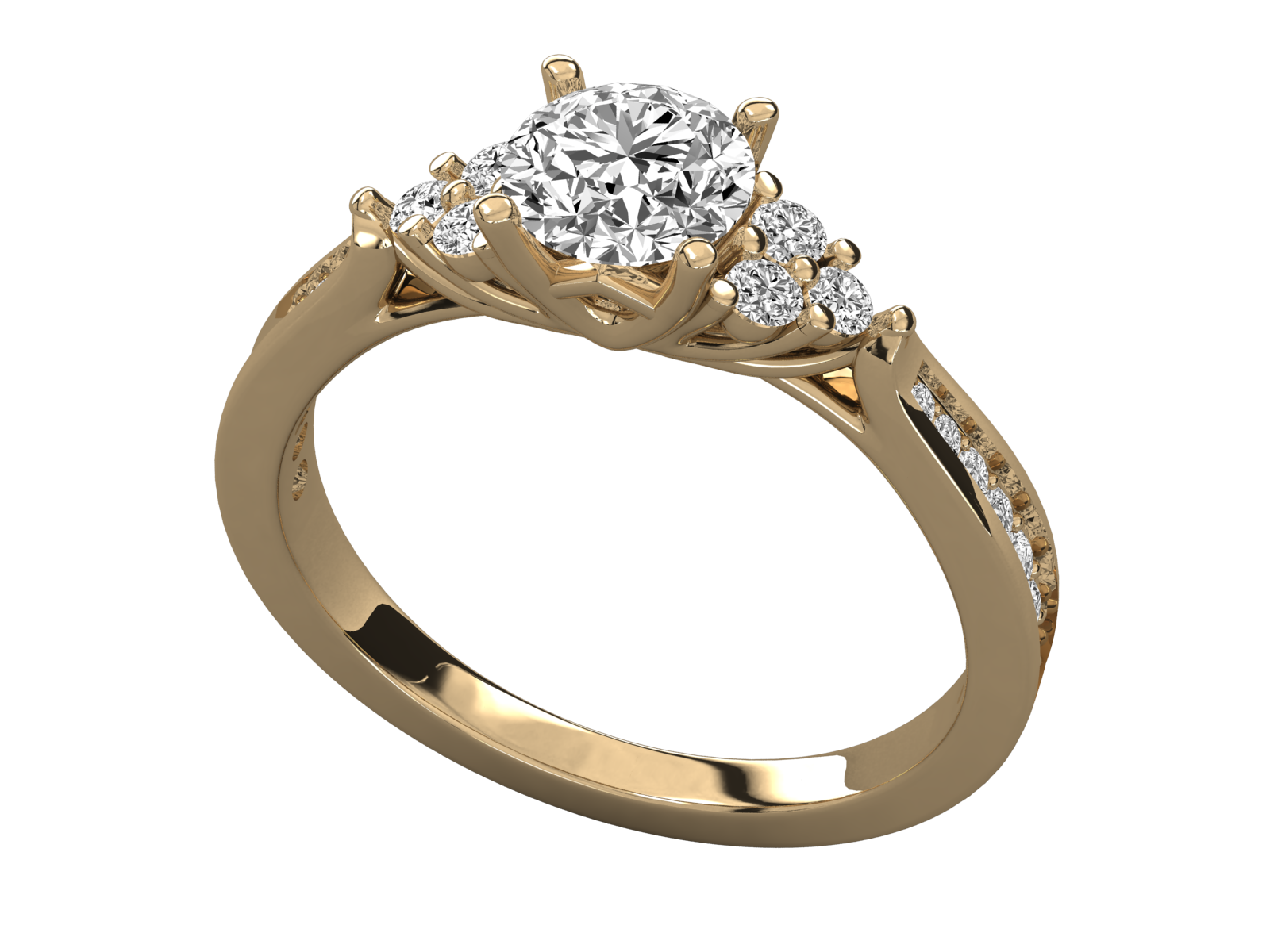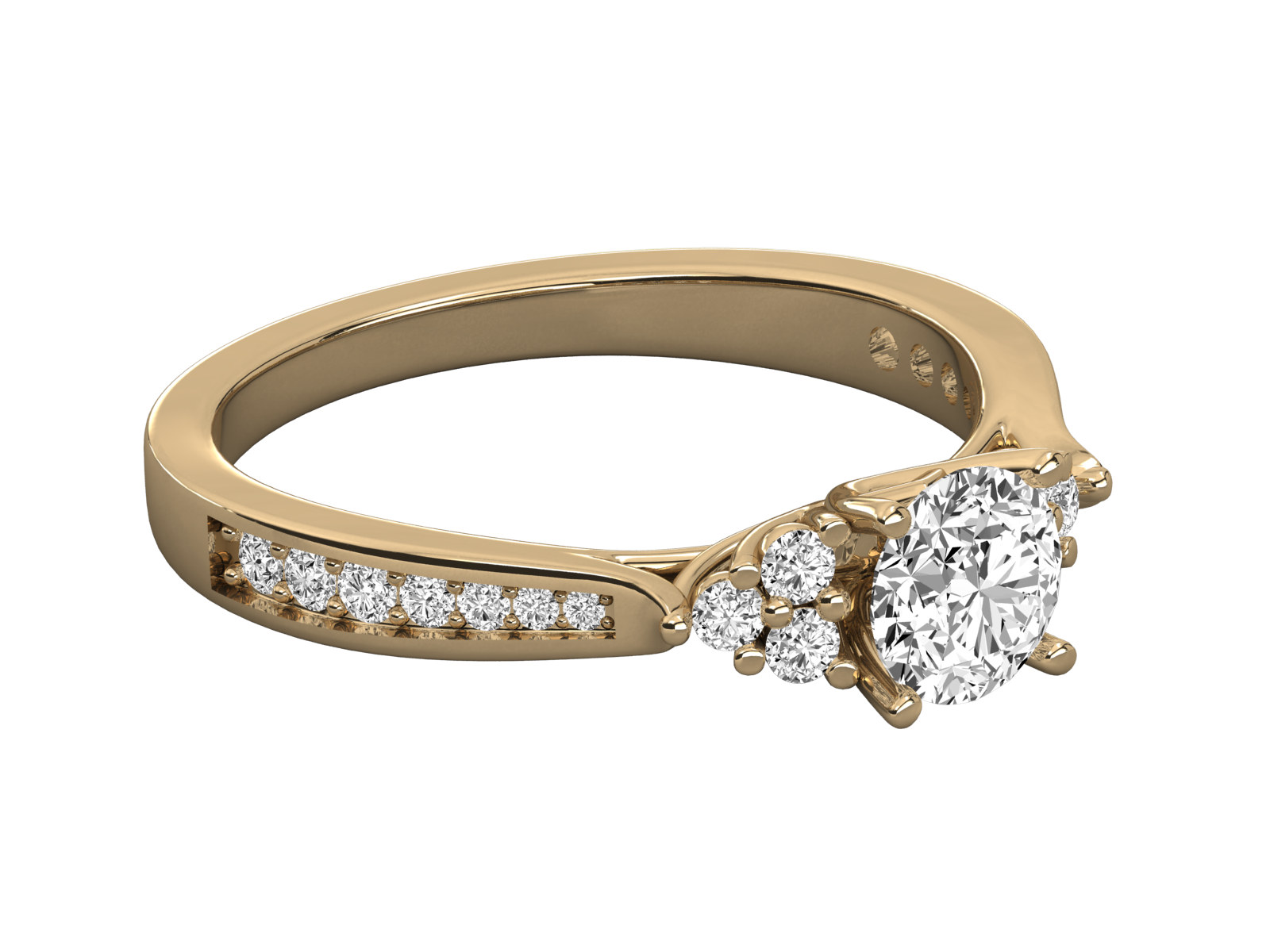 This elegant gold engagement ring features a brilliant round-cut center diamond, flanked by shimmering cluster accents for added brilliance. The band is adorned with a line of pavé-set diamonds, enhancing the ring’s timeless charm. A perfect blend of classic design and luxurious sparkle for your special moment.