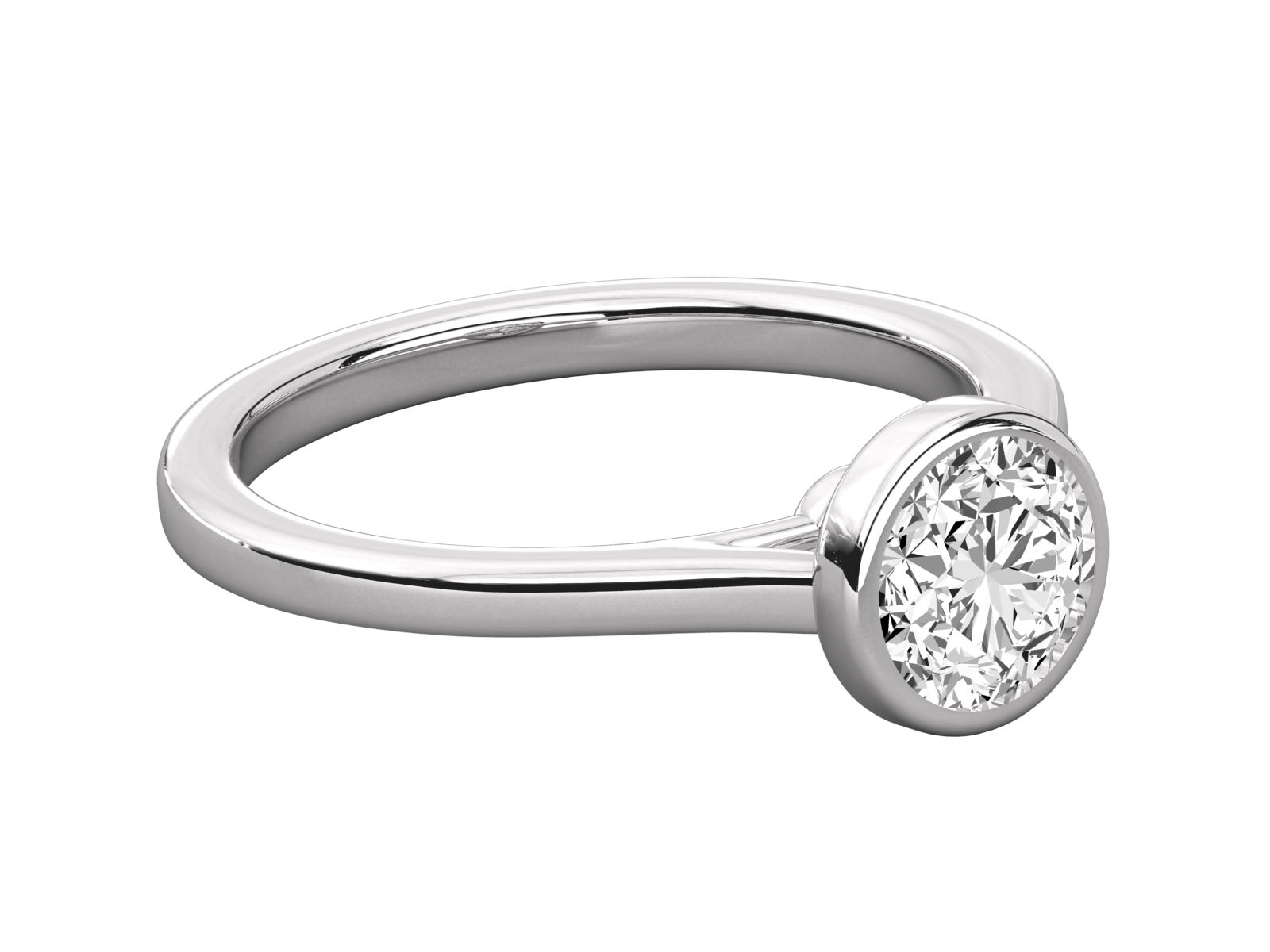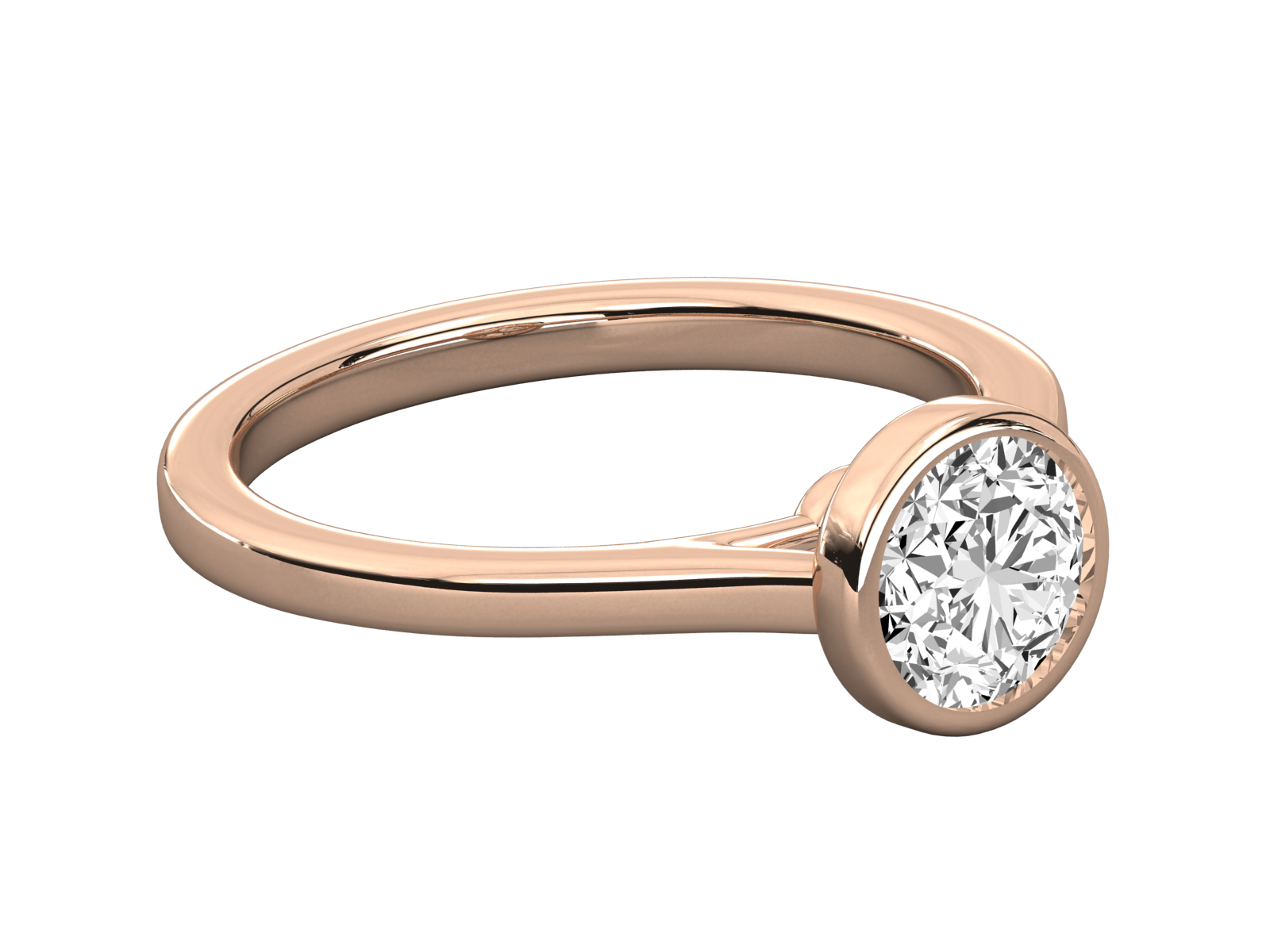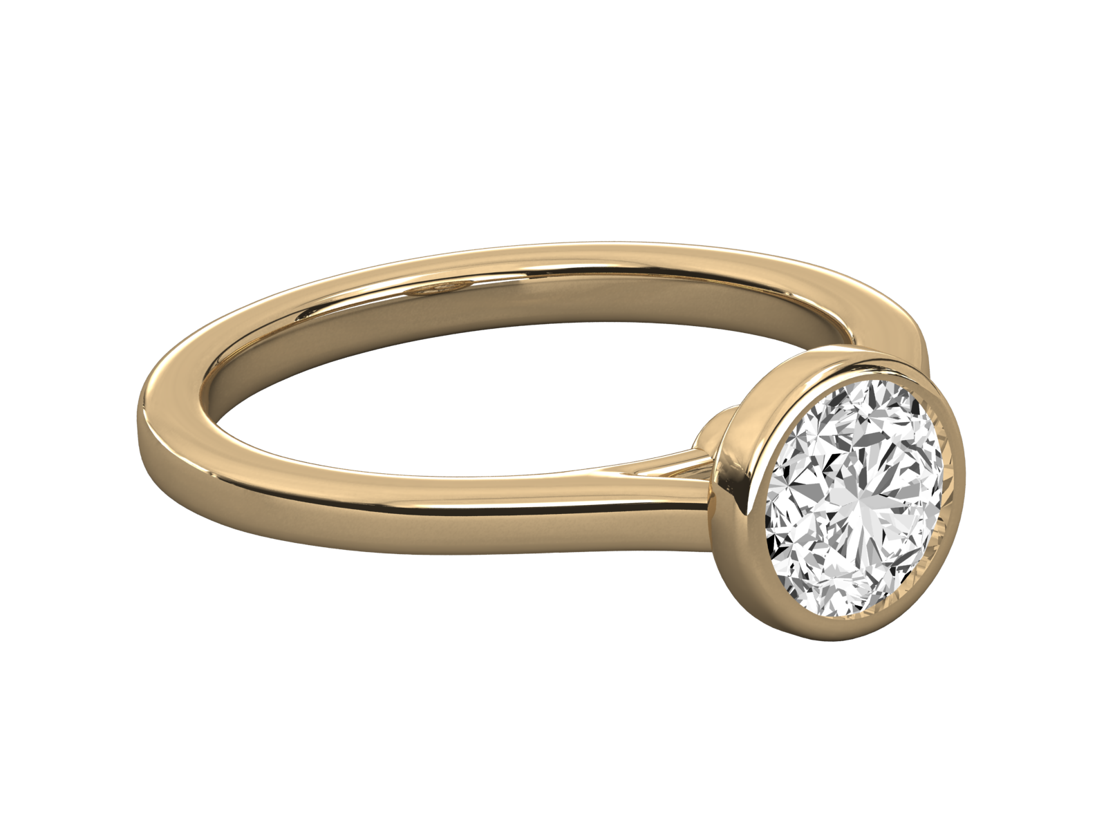 This modern gold ring features a bezel-set round brilliant diamond, offering both security and striking elegance. The smooth, polished band and seamless setting highlight the stone’s brilliance while providing a contemporary minimalist look. Ideal for those who cherish understated sophistication with a touch of timeless glamour.