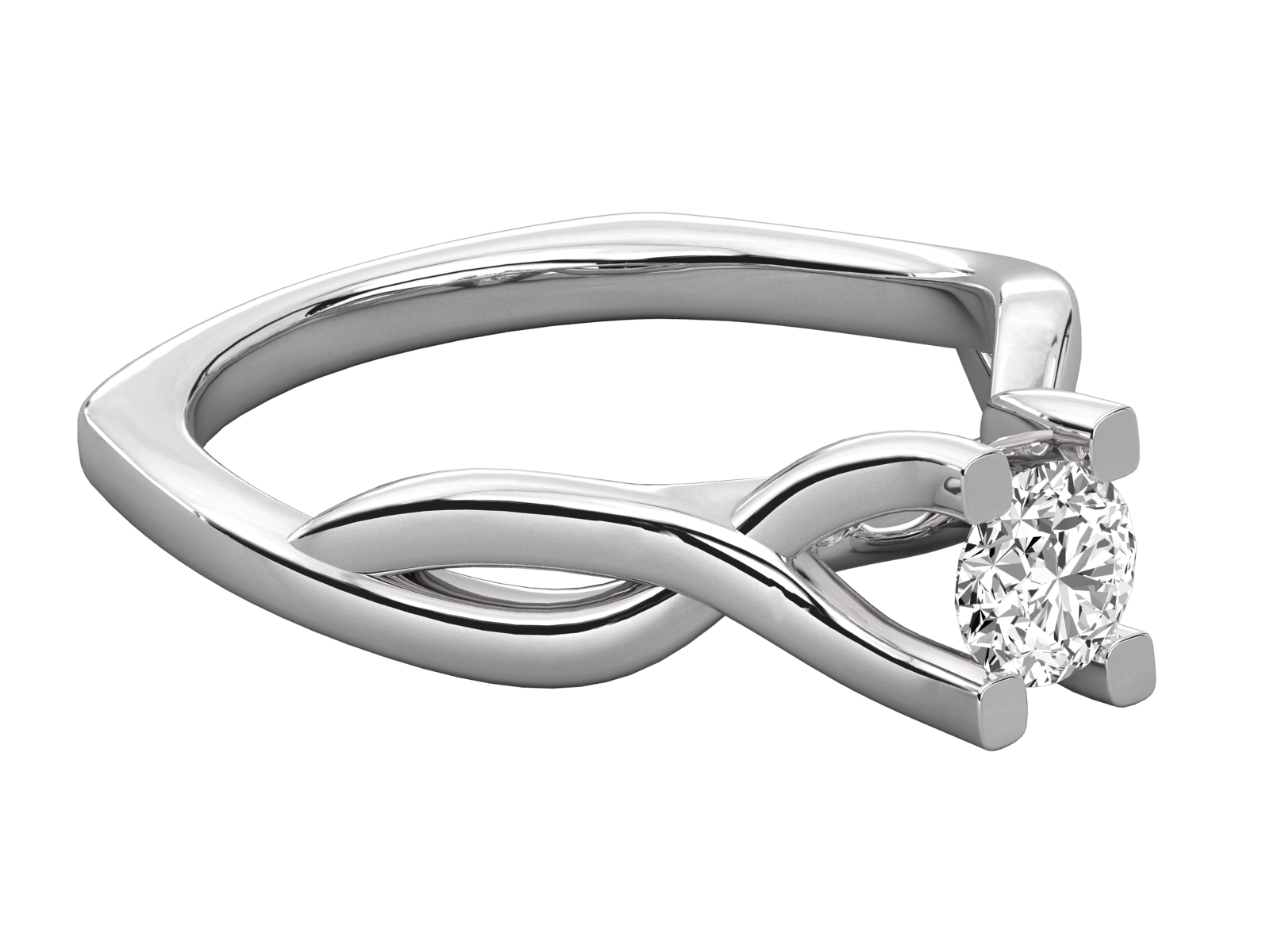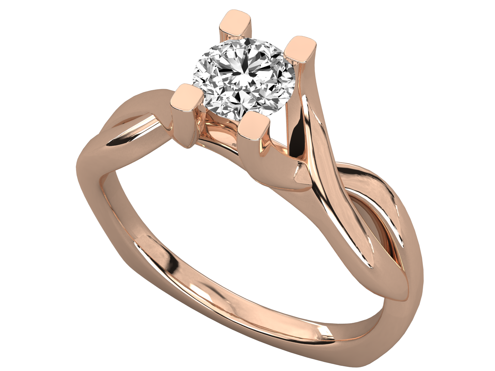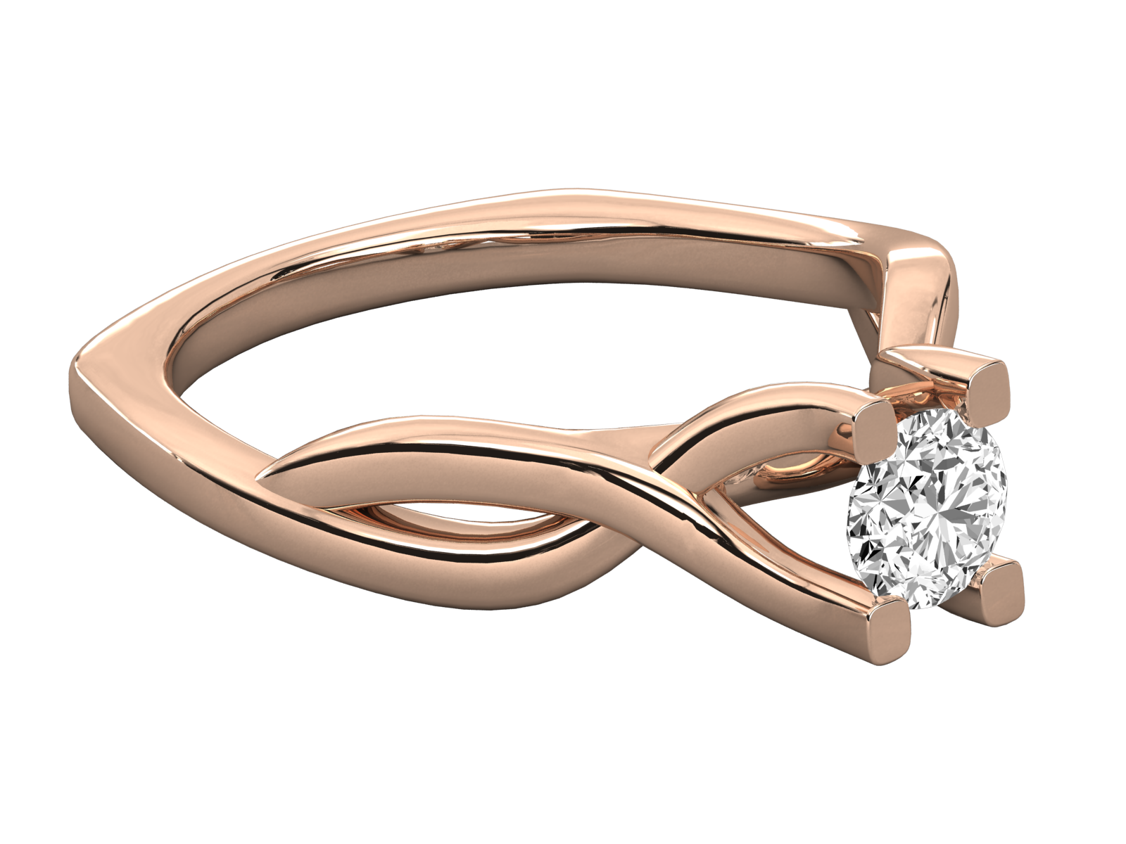 A romantic blend of elegance and symbolism, this rose gold ring features an intertwined band representing unity and eternal love. The central round brilliant diamond is securely held in a four-prong setting, drawing the eye with timeless sparkle. Ideal for those seeking a meaningful yet contemporary engagement or promise ring.