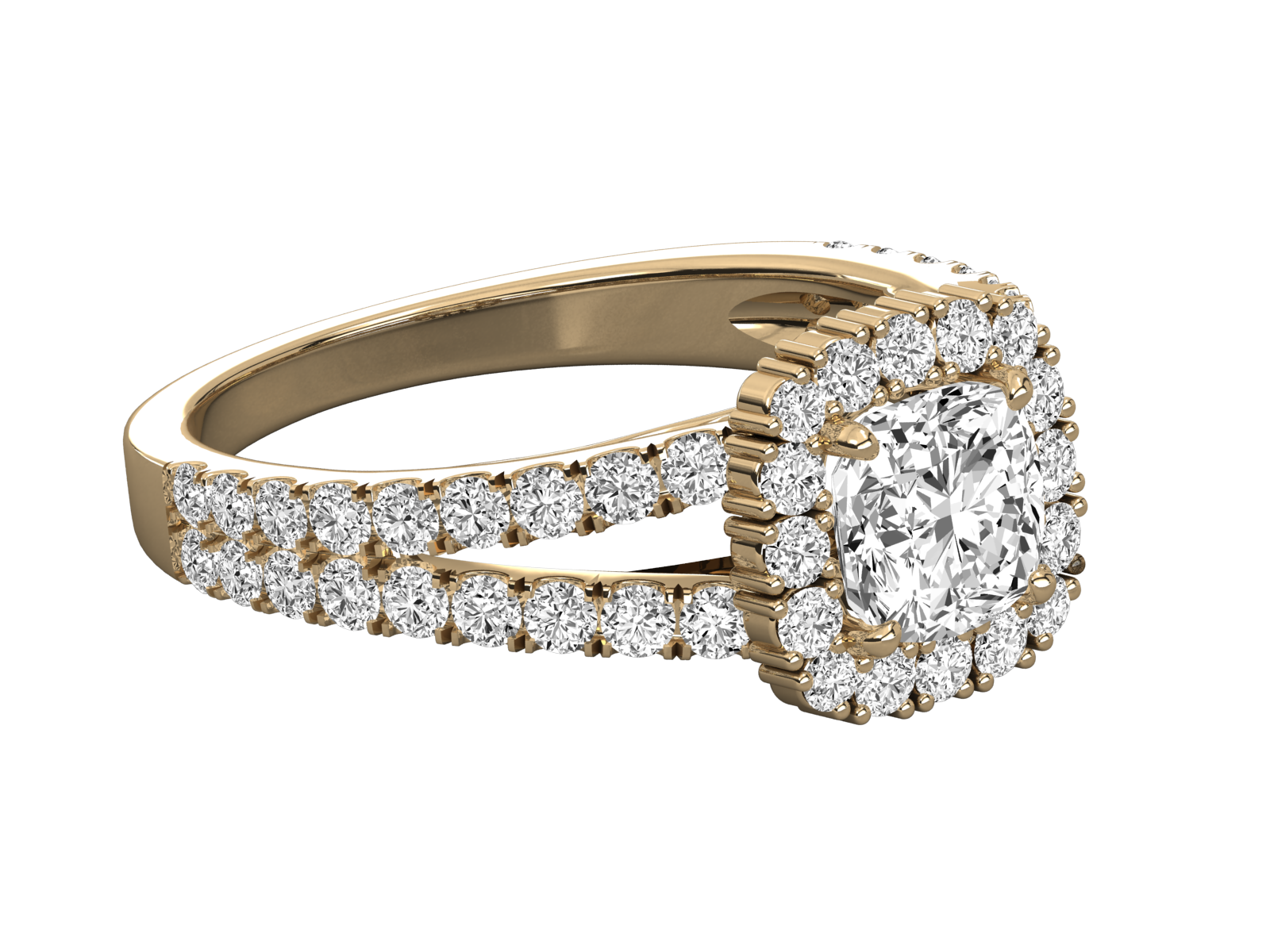 This engagement ring features a radiant cushion-cut center diamond surrounded by a sparkling halo. The split shank band, encrusted with round diamonds, adds elegance and brilliance. A timeless symbol of love and commitment, perfect for your special moment.