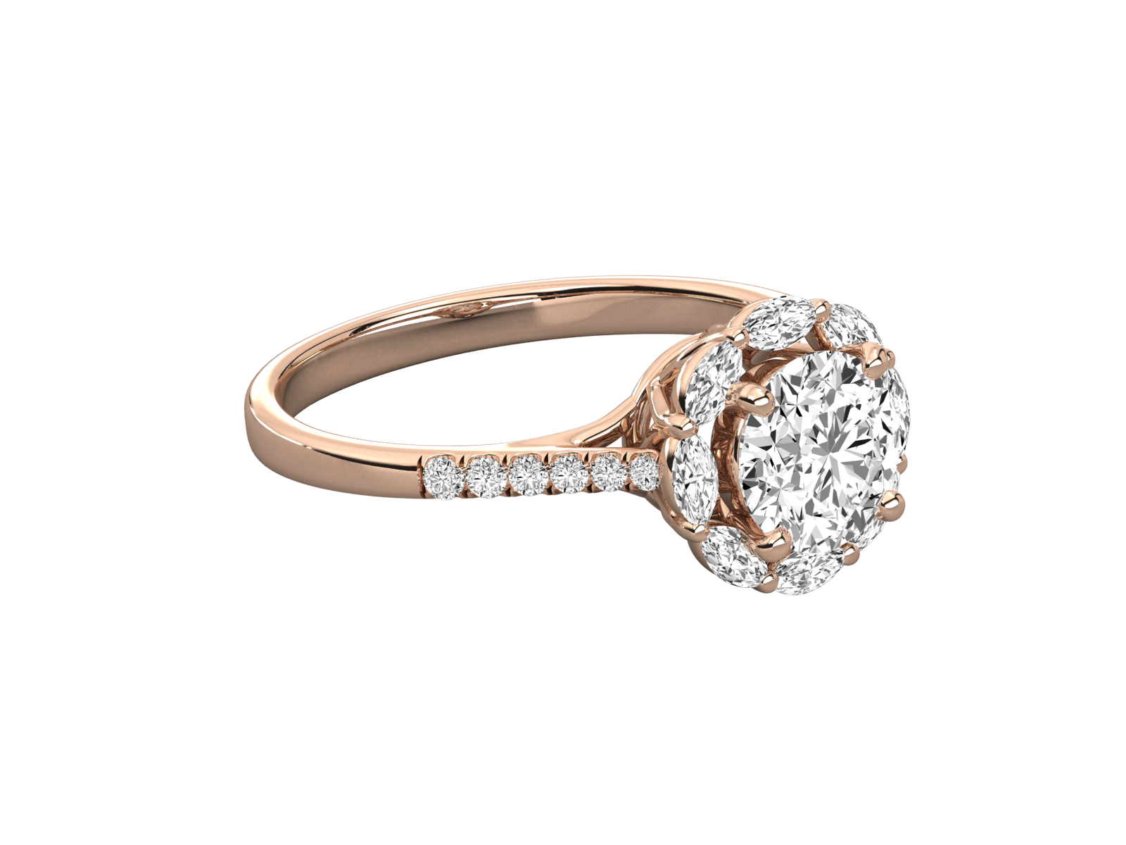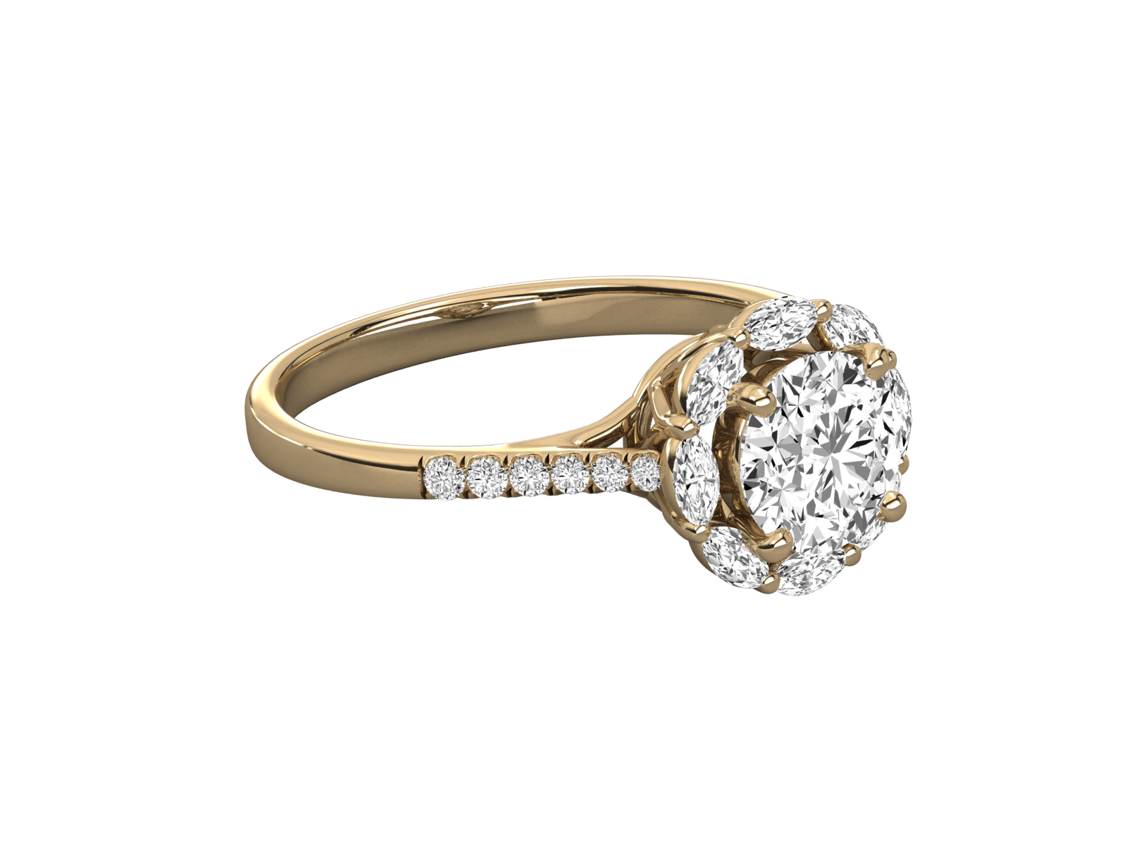 Inspired by nature’s elegance, this gold engagement ring features a round brilliant center stone surrounded by marquise-cut diamonds forming a delicate floral halo. The slim band is accented with shimmering pavé-set diamonds for added sparkle. A romantic and timeless piece perfect for those who love unique floral-inspired designs.
