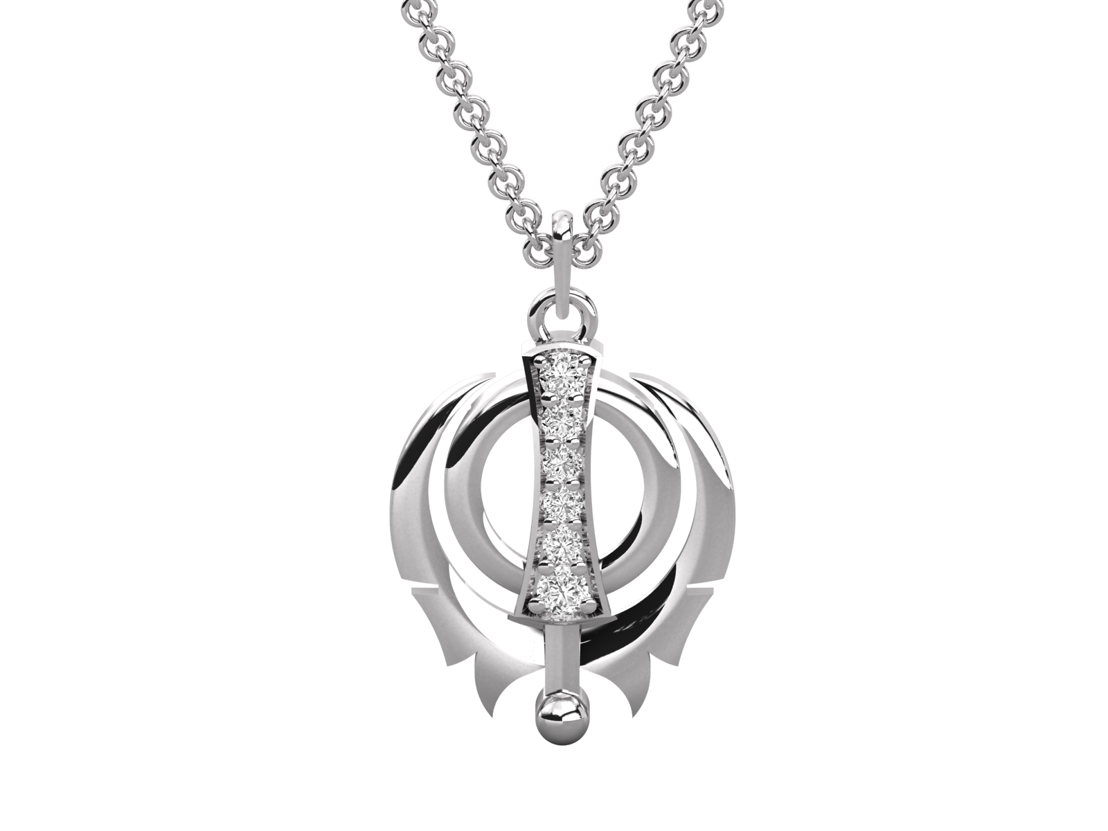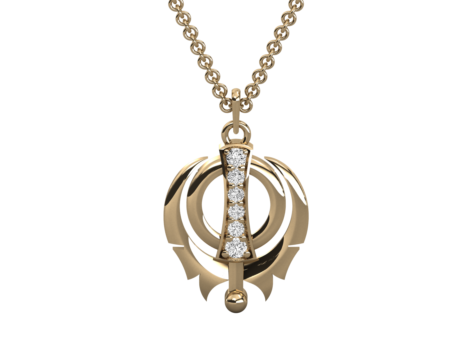This elegant gold Khanda pendant features dazzling diamonds set in the central sword, symbolizing strength and spirituality. A meaningful piece of Sikh religious jewelry, perfect for both men and women. Ideal for gifting during Vaisakhi, weddings, or spiritual milestones. Comes with a matching chain. Celebrate your faith in timeless style.