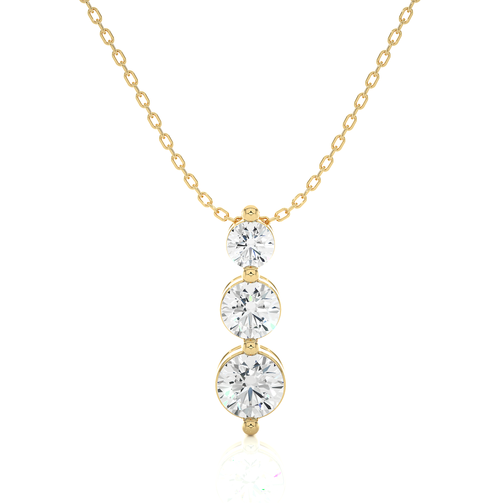 Gracefully elegant, this pendant showcases three round-cut diamonds in a vertical drop, symbolizing the past, present, and future. Set in warm yellow gold and suspended on a delicate chain, it’s a timeless piece perfect for everyday wear or special occasions. A radiant expression of love, style, and sophistication.