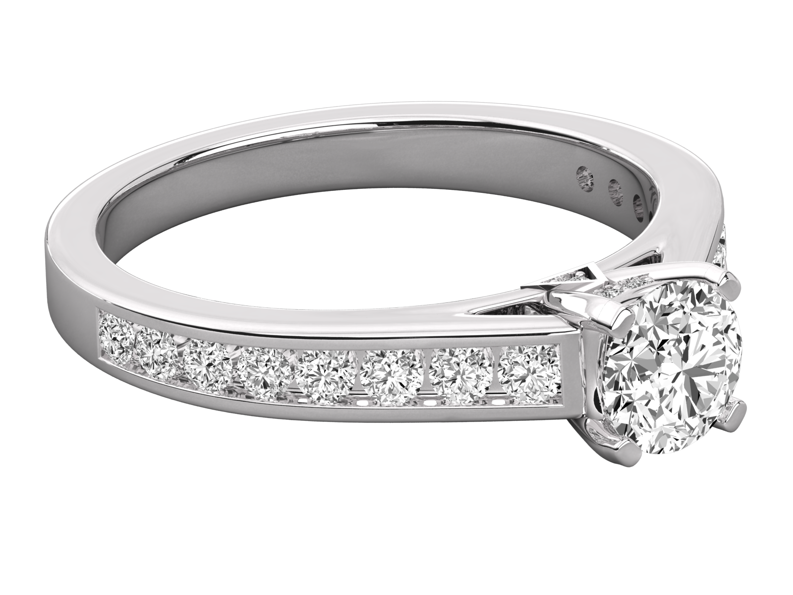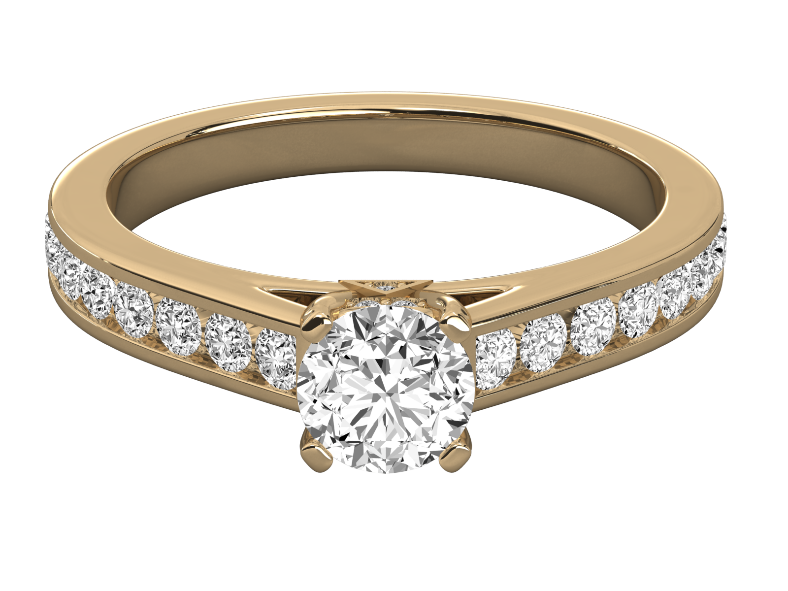 This elegant gold engagement ring features a dazzling round-cut center stone, accented by a sleek channel setting of brilliant diamonds along the band. Timeless and sophisticated, it’s the perfect blend of sparkle and structure—ideal for a modern bride seeking a classic yet bold symbol of everlasting love and commitment.