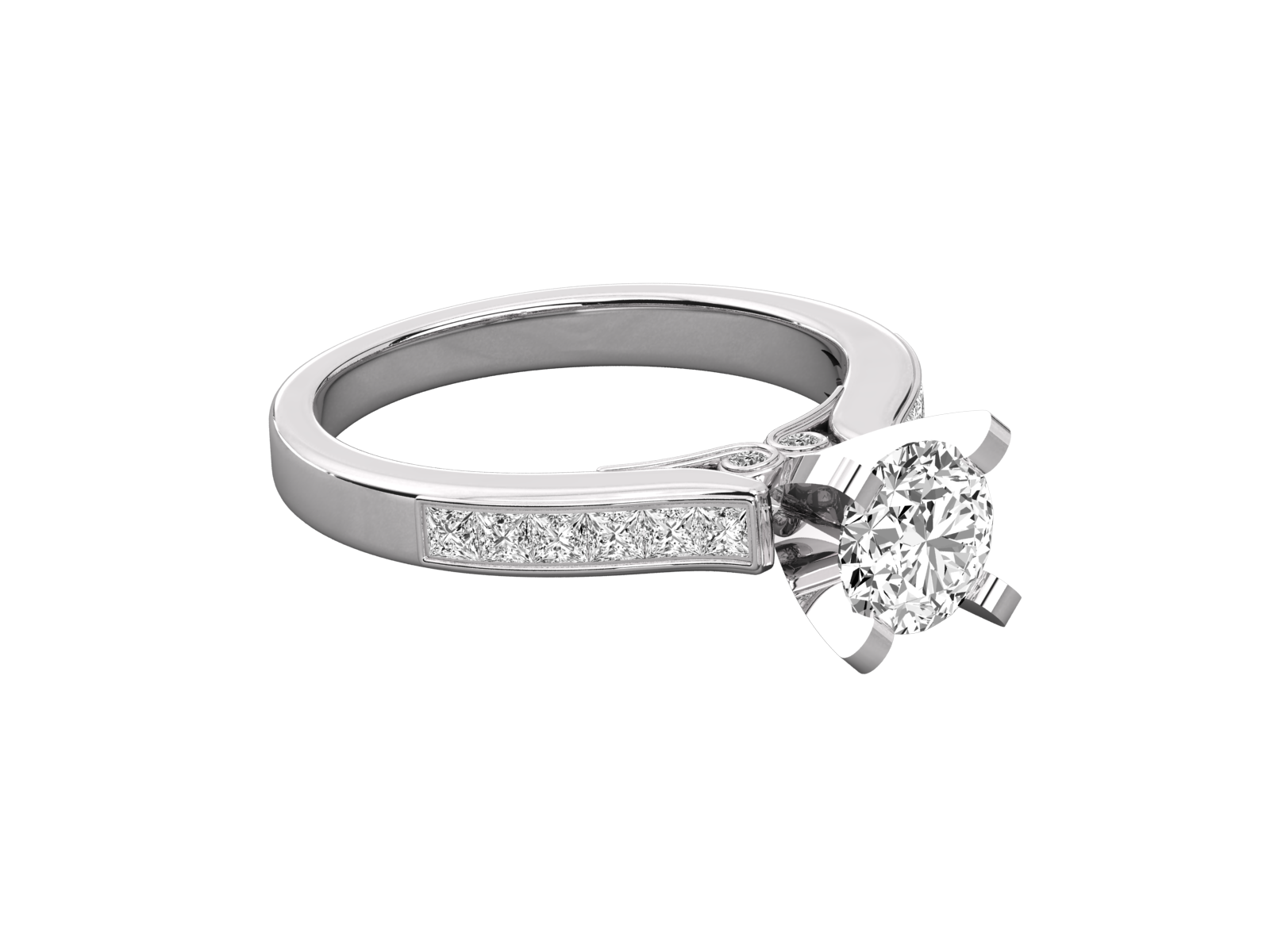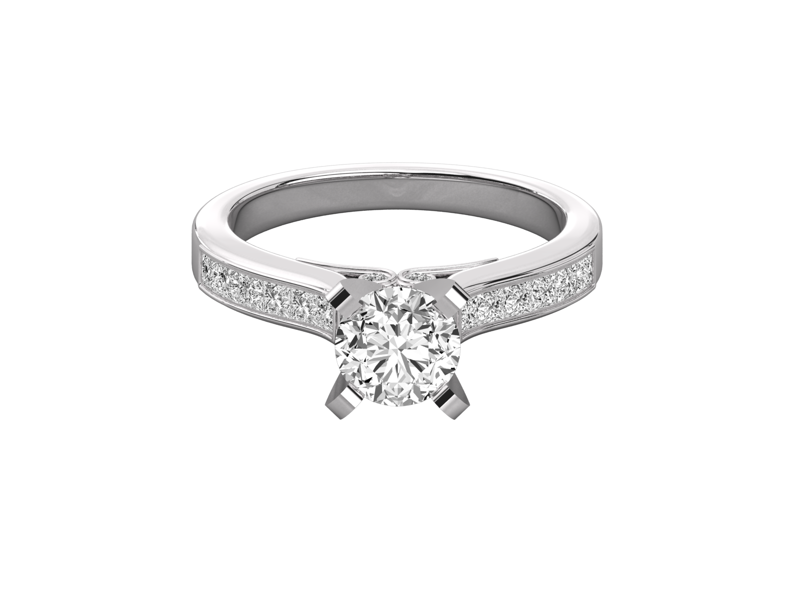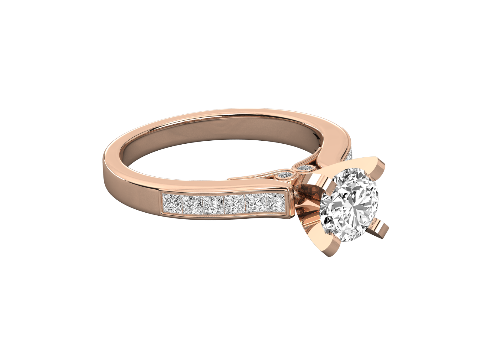 This gold engagement ring features a dazzling round-cut center diamond with channel-set accent stones along the band. Crafted for brilliance and durability, its sleek design adds a modern edge to a classic style. A perfect symbol of everlasting love for engagements, anniversaries, or special occasions.