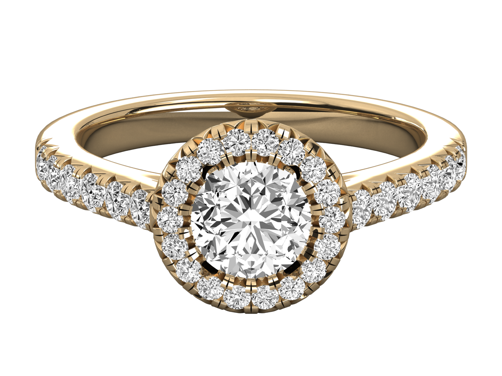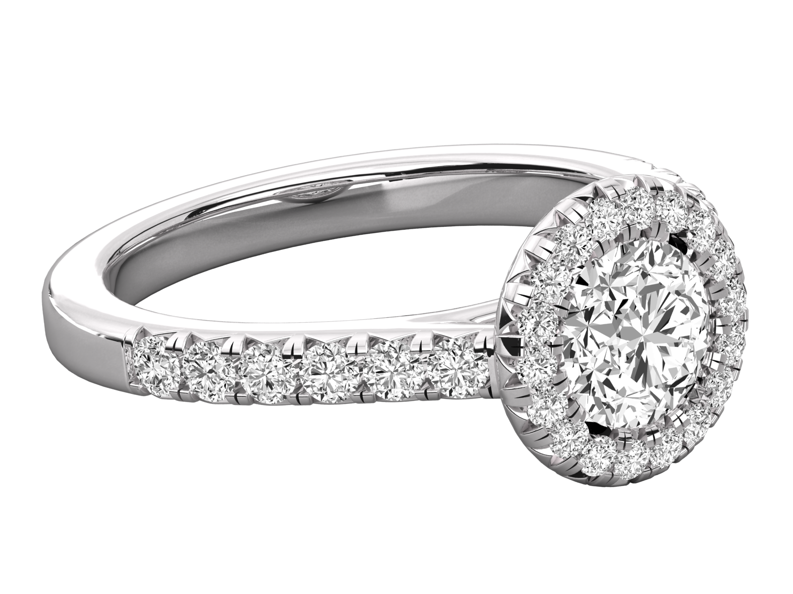 Dazzle in timeless elegance with this double halo engagement ring. A brilliant round diamond is encircled by two radiant halos, amplifying its sparkle. The pave diamond band adds extra shimmer, making this ring a perfect symbol of enduring love and sophistication. Crafted to celebrate your forever moment.