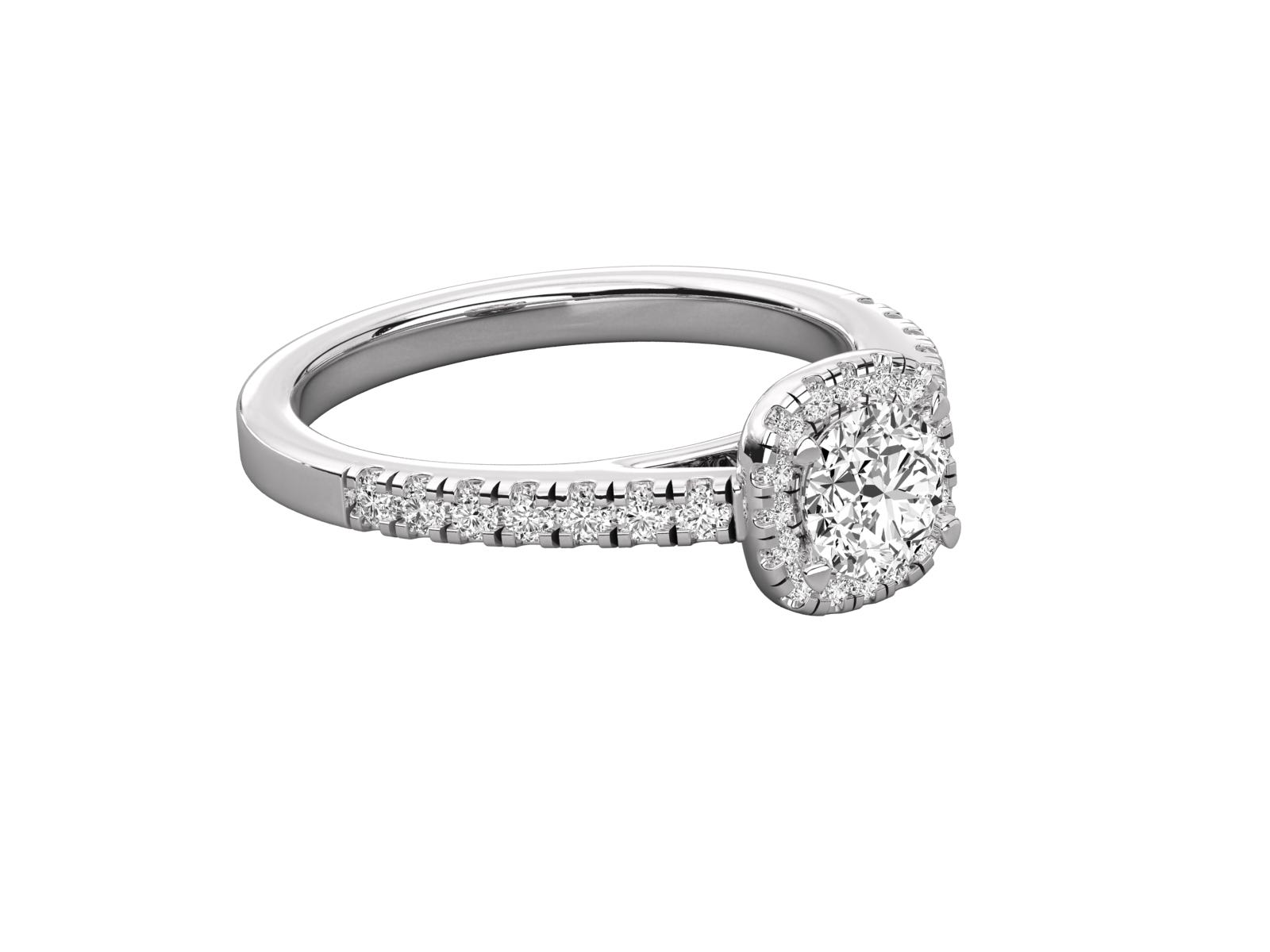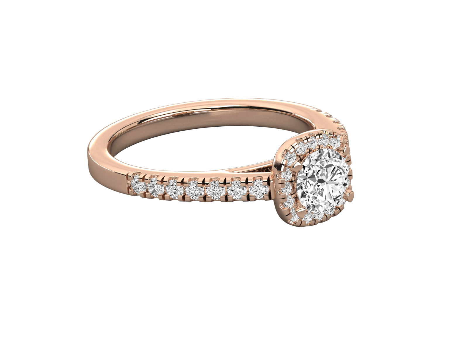This round halo diamond engagement ring in gold features a brilliant center stone framed by delicate accent diamonds. A sparkling pave band enhances its brilliance, making it the perfect symbol of love and commitment. Ideal for brides who adore vintage-inspired glamour with a modern rose gold twist.