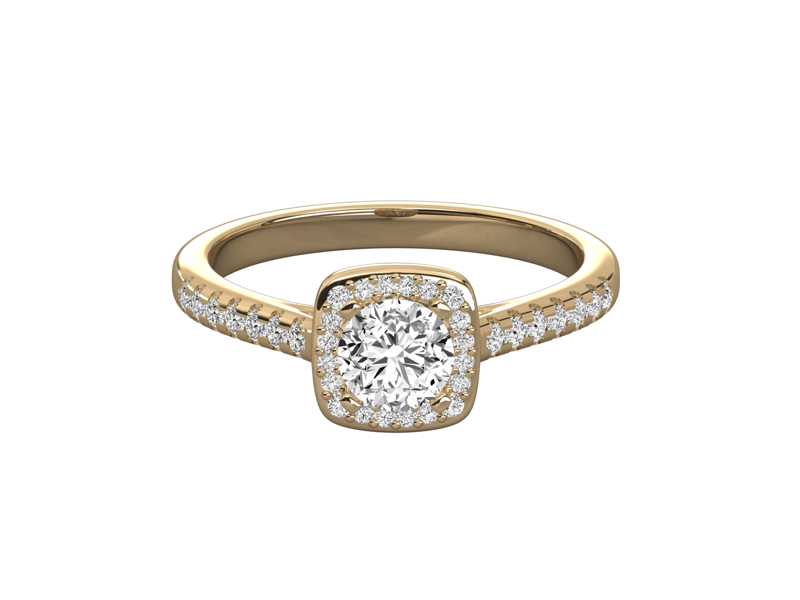 This cushion halo engagement ring showcases a round brilliant center diamond surrounded by a dazzling cushion-shaped halo. Set in warm rose gold with a pave diamond band, it combines vintage charm with modern flair. A romantic and radiant choice for proposals, anniversaries, or special milestone celebrations.