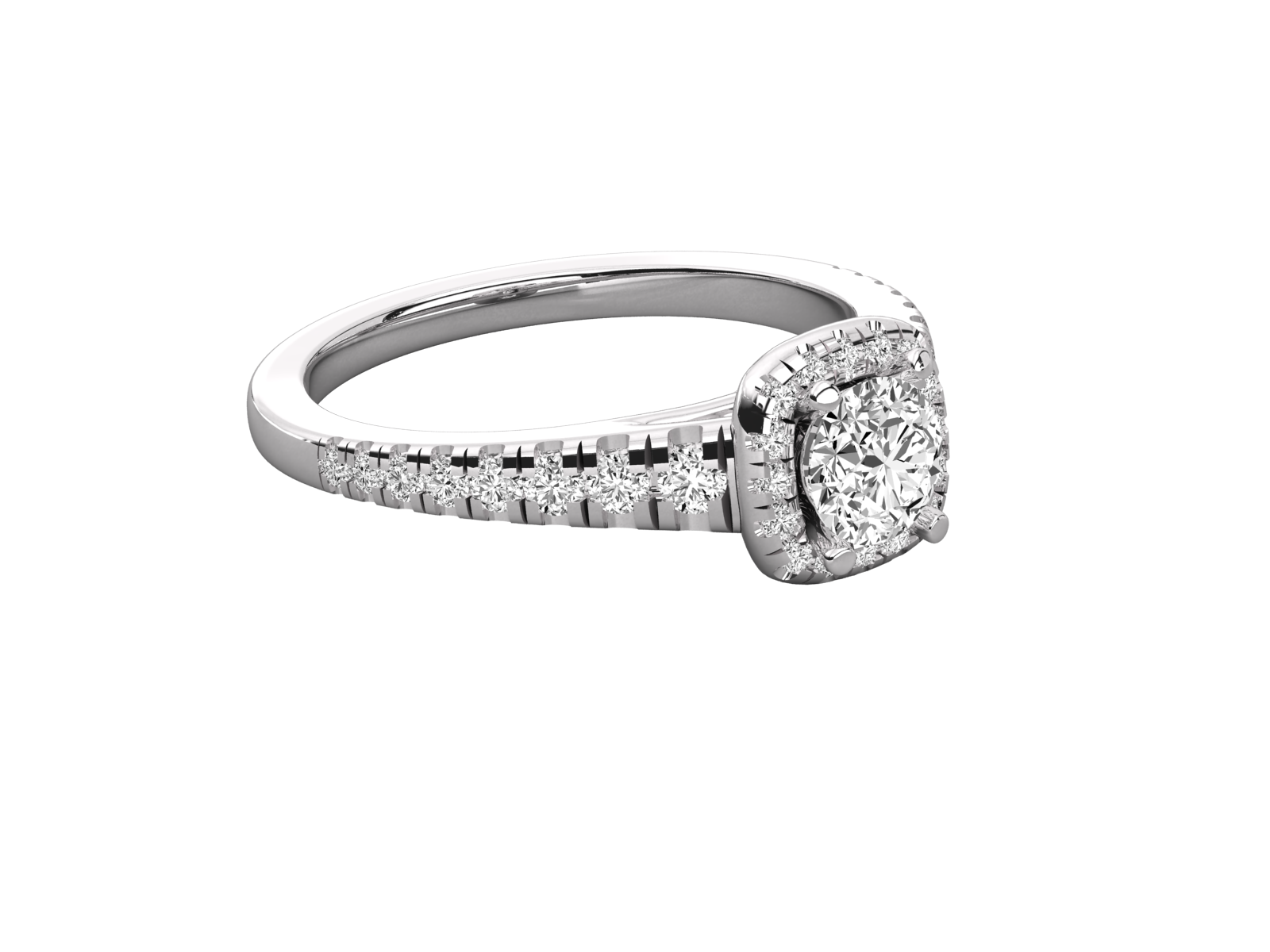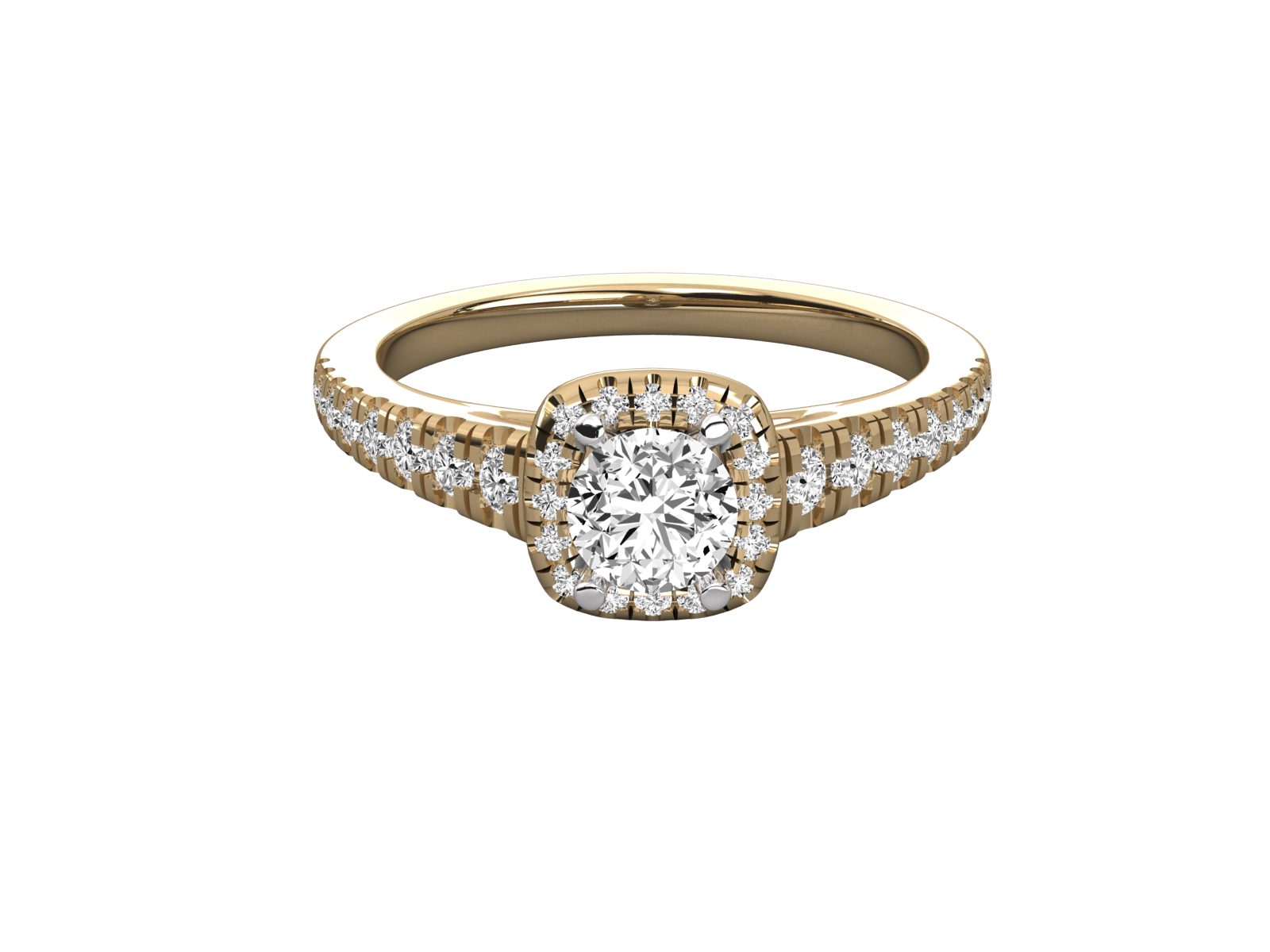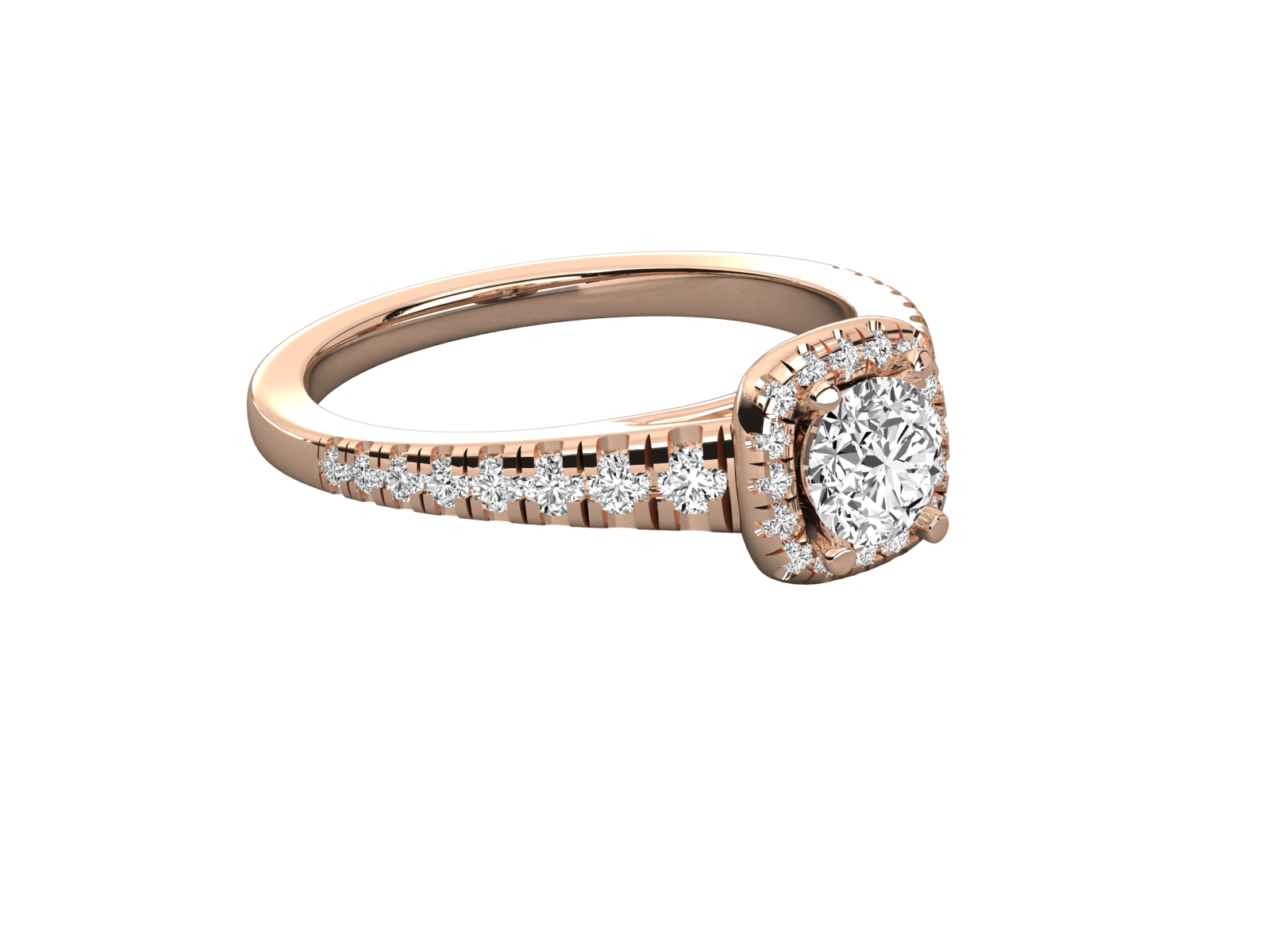 This stunning engagement ring features a round brilliant center embraced by a cushion-shaped halo, set in luxurious rose gold. The band boasts double rows of dazzling diamonds, adding extra sparkle and sophistication. A perfect fusion of elegance and modern style—ideal for proposals, anniversaries, or a memorable bridal jewelry gift.
