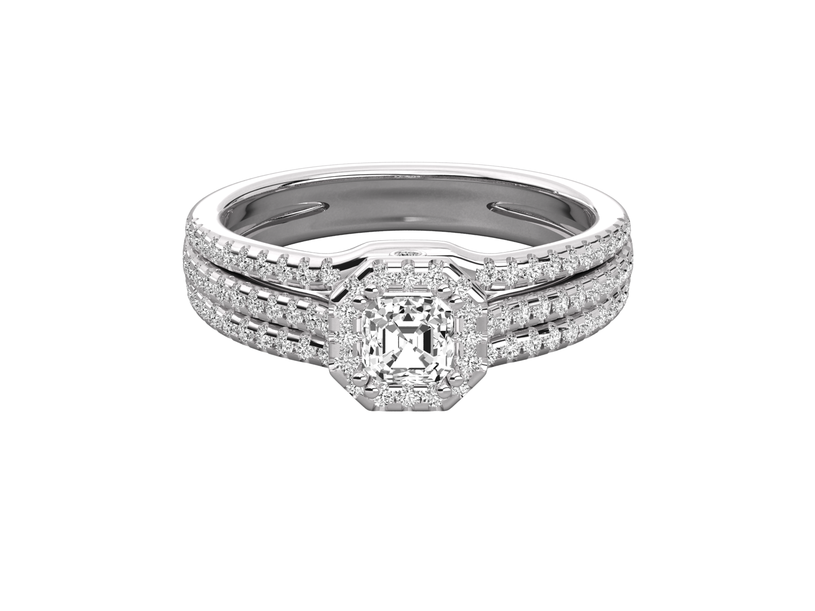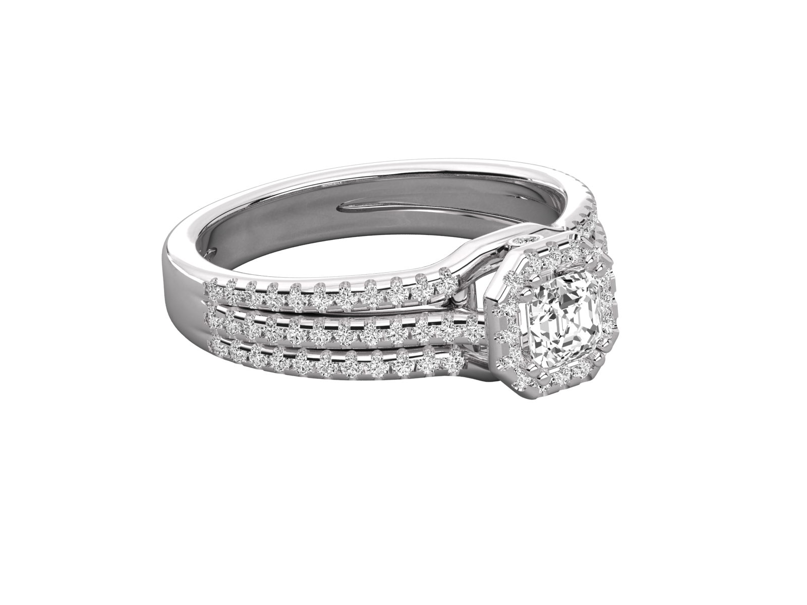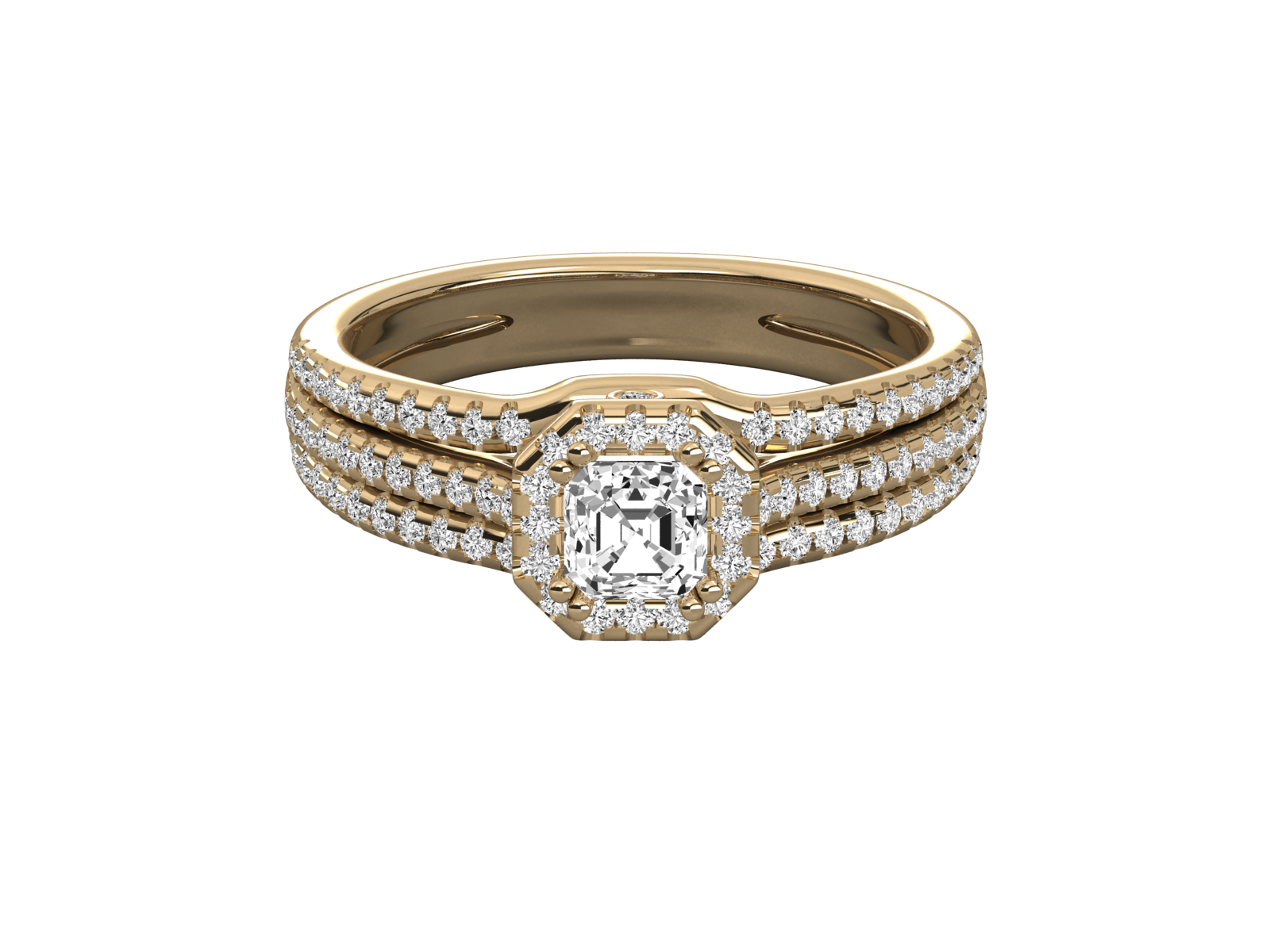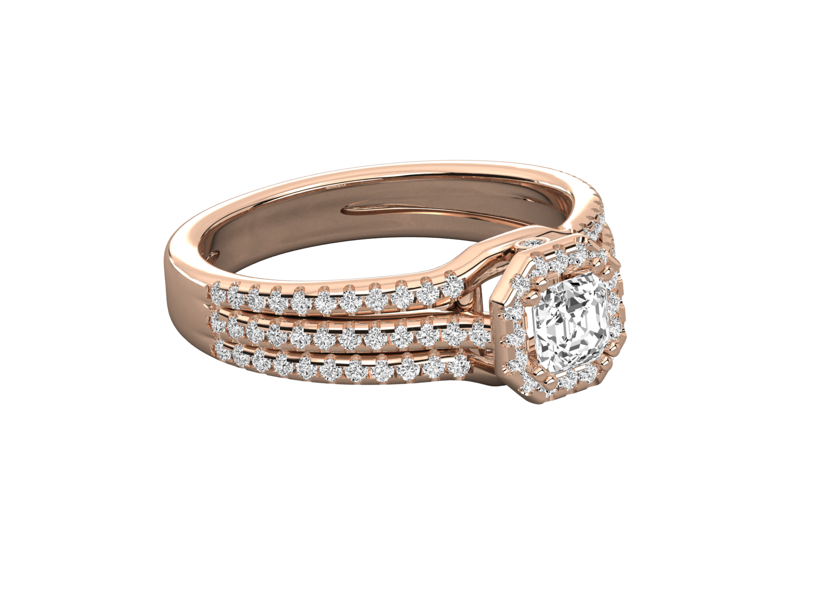 This captivating ring features a stunning Emerald-cut center diamond encased in a halo of brilliant round diamonds. Set in elegant rose gold, the triple diamond-encrusted bands add bold brilliance and a regal presence. A luxurious and sophisticated design, perfect for celebrating timeless love with a touch of vintage charm.