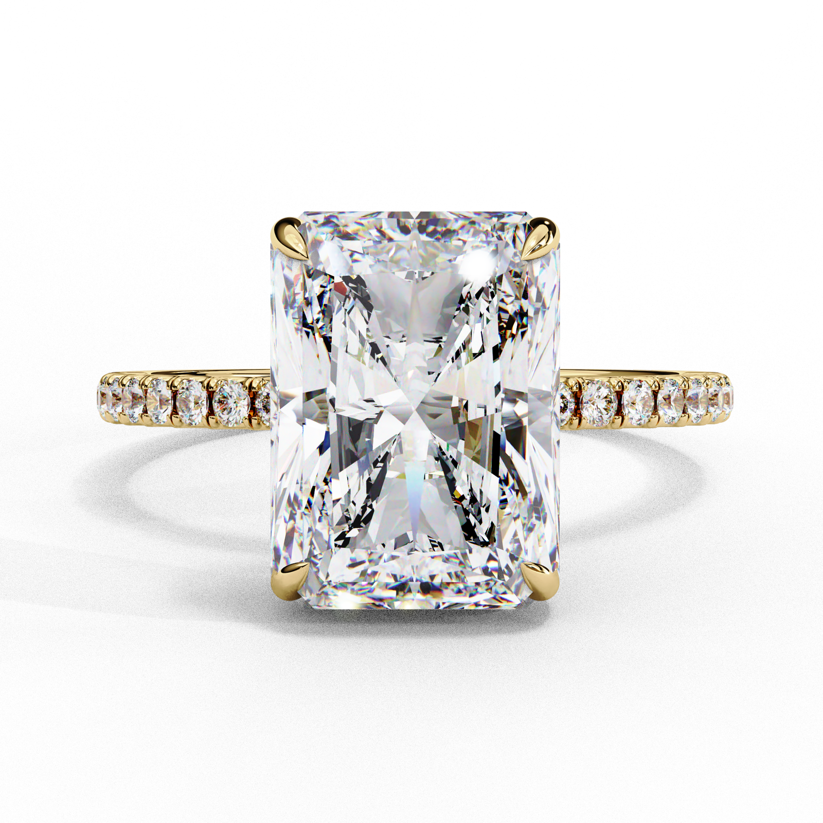 Make your special moment unforgettable with this Radiant Cut Moissanite Engagement Ring in gold. Featuring a dazzling pavé diamond band, it offers exceptional brilliance and timeless elegance. Perfect for engagements or weddings, this ring symbolizes everlasting love and sophistication. Ideal for modern brides seeking luxury and uniqueness.
